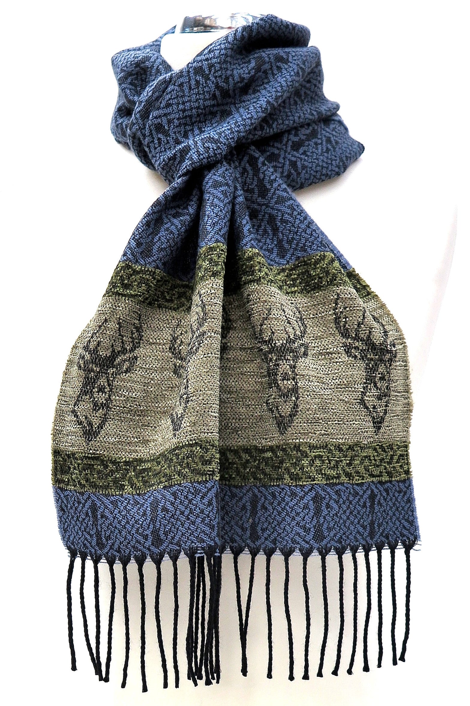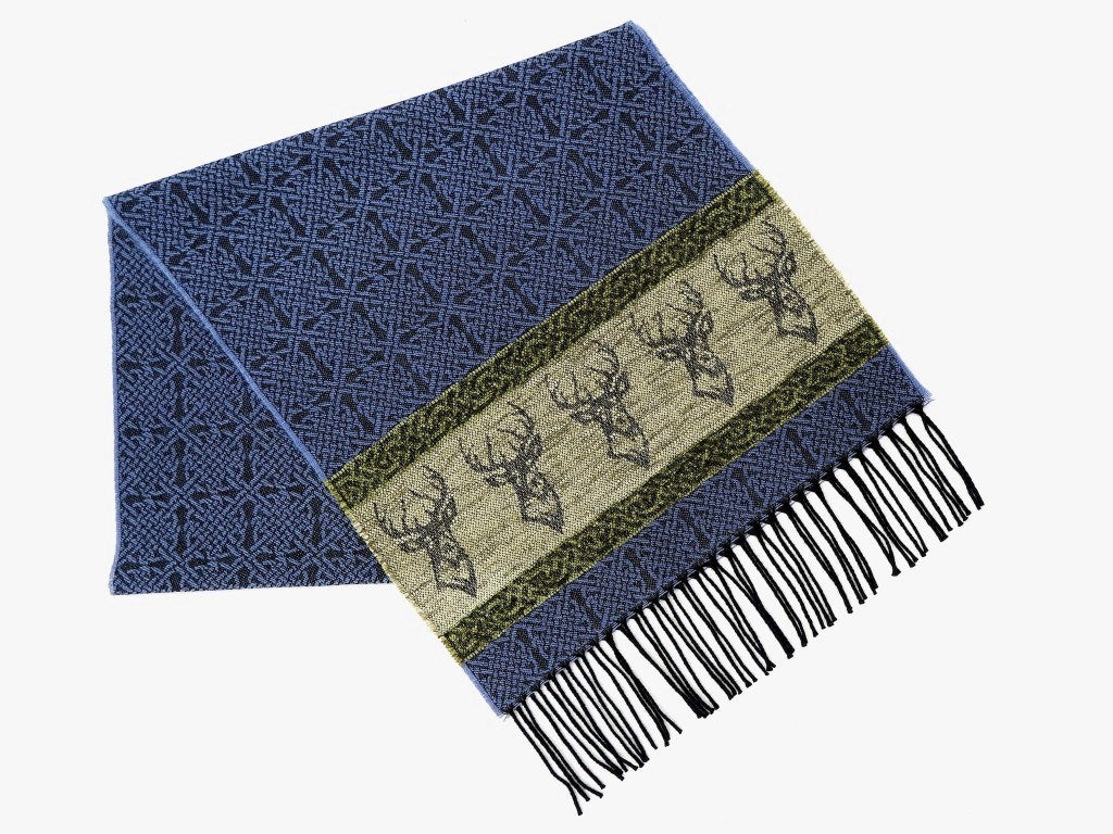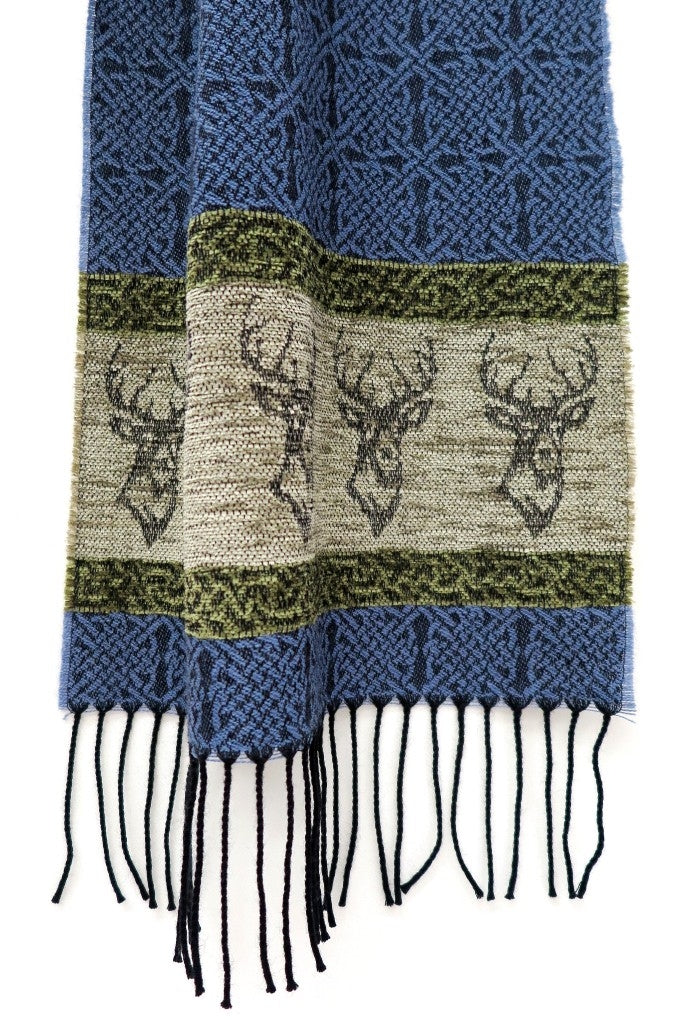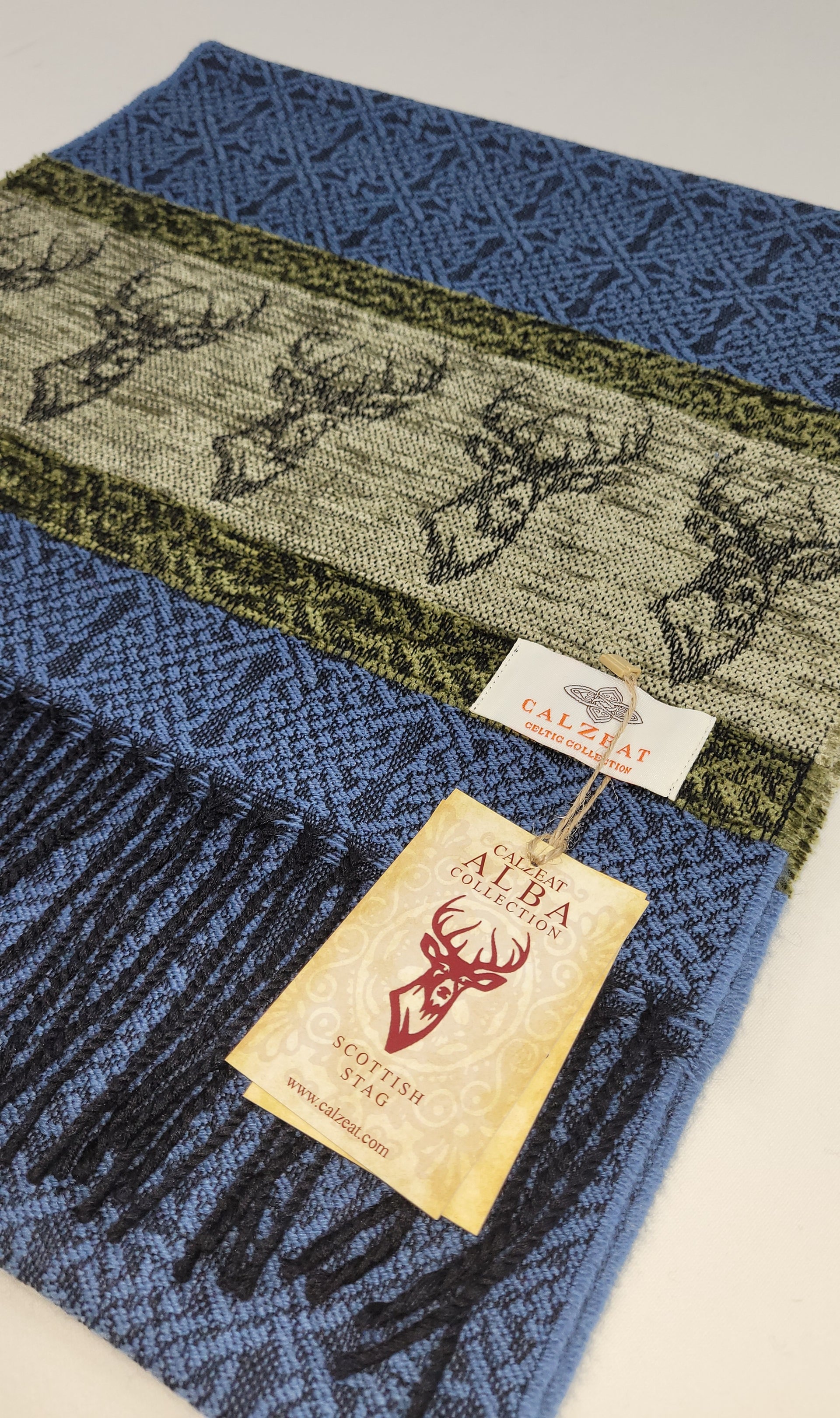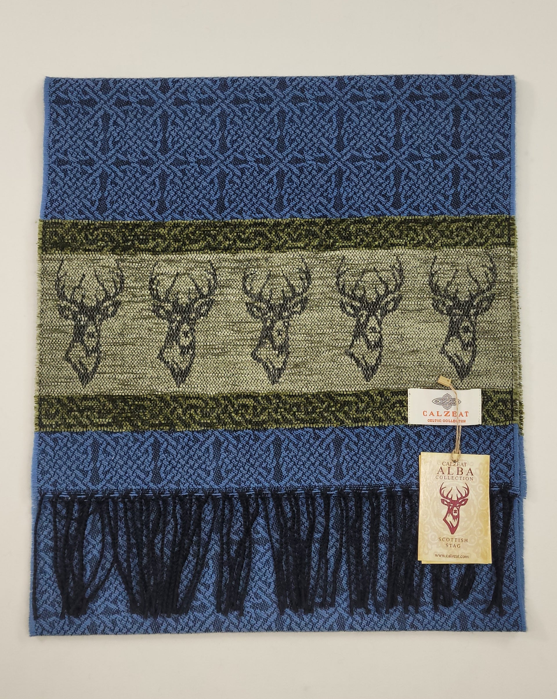 Celtic Alba Stag Blue woven scarf in Worsted Wool and luxurious Chenille. Dimensions: 35 x 170 cms including Fringes Composition: 45% Wool/55% Chenille An authentic Scottish product exclusively designed and woven by Calzeat of Scotland. |
