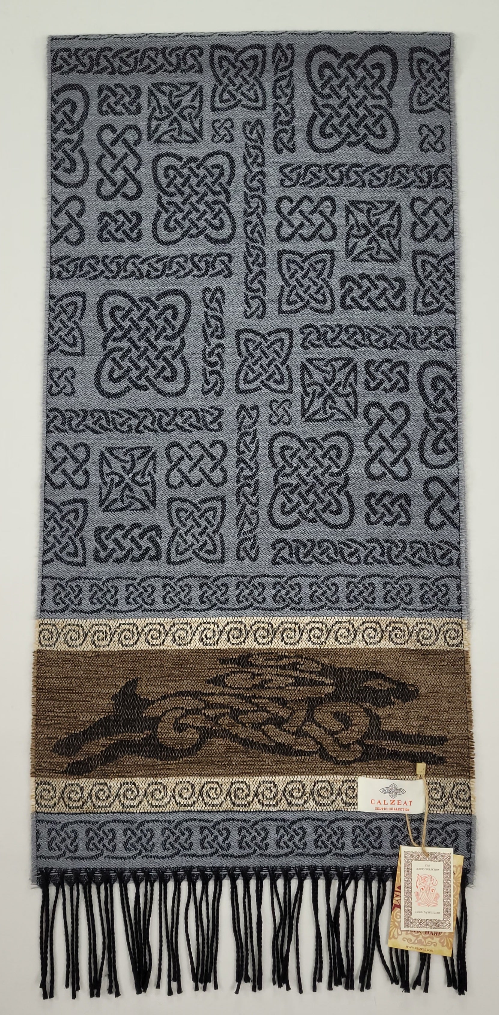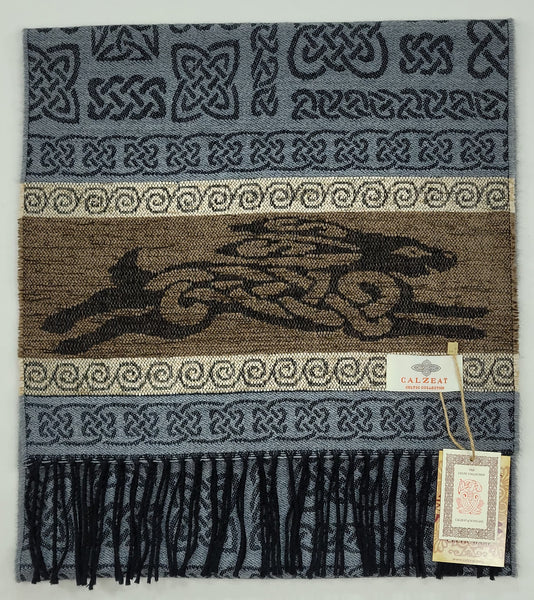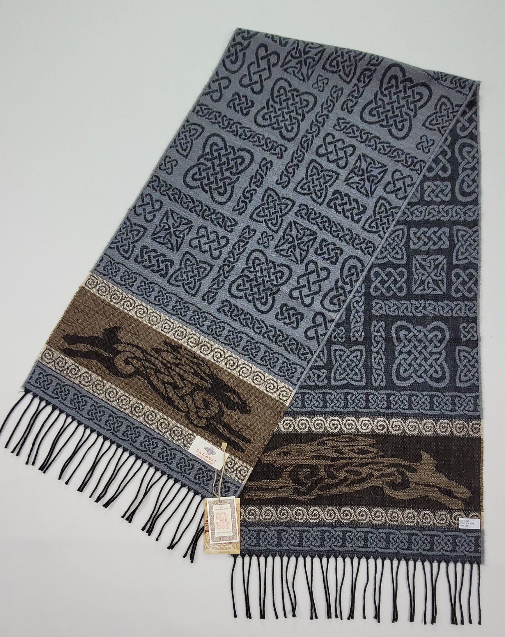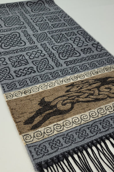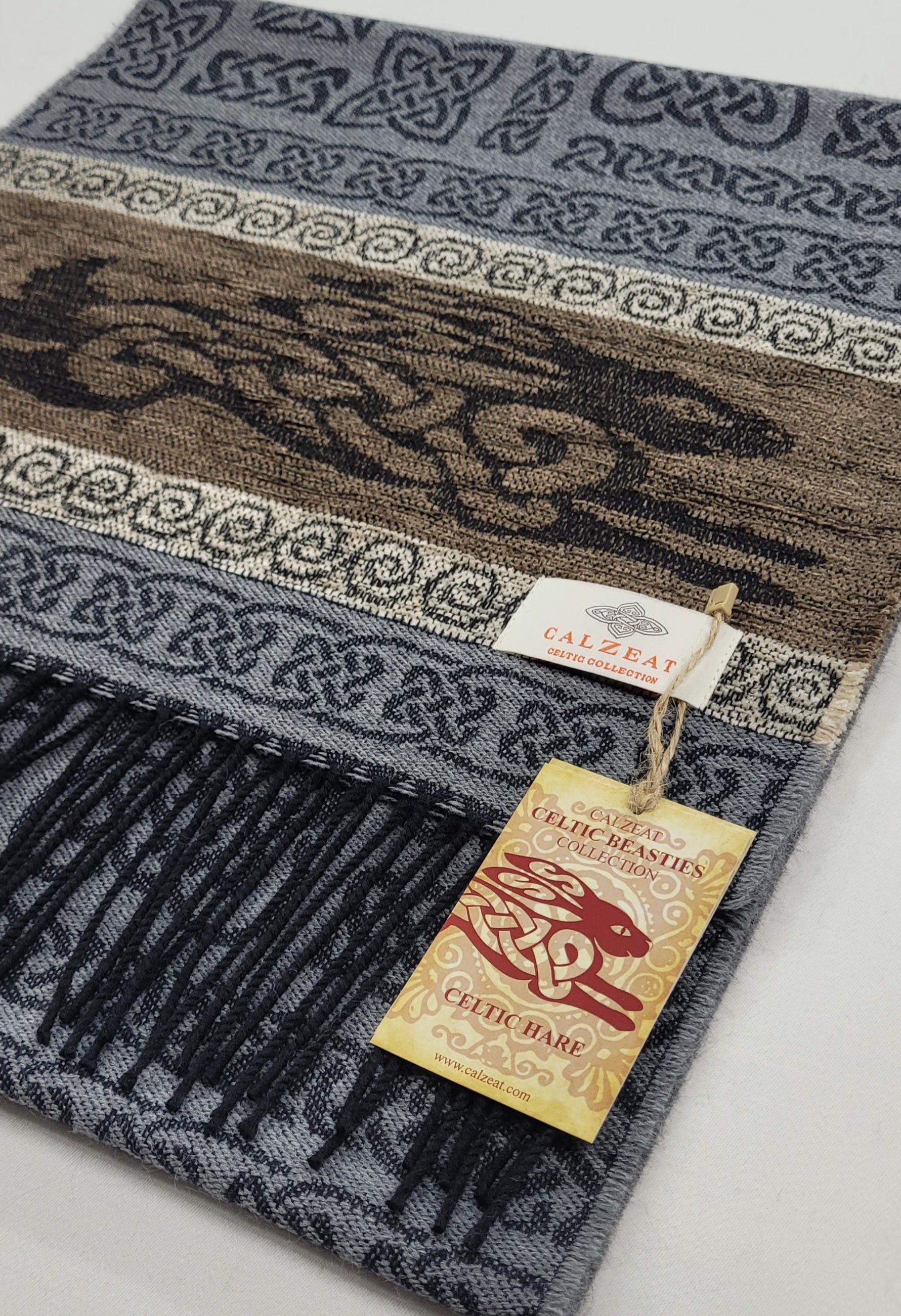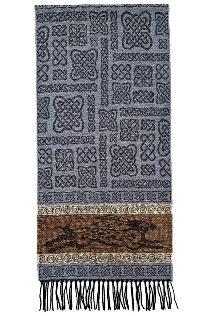 This fabulous scarf is woven in silver grey with a border of taupe and cream chenille depicting a beautiful Celtic hare.
