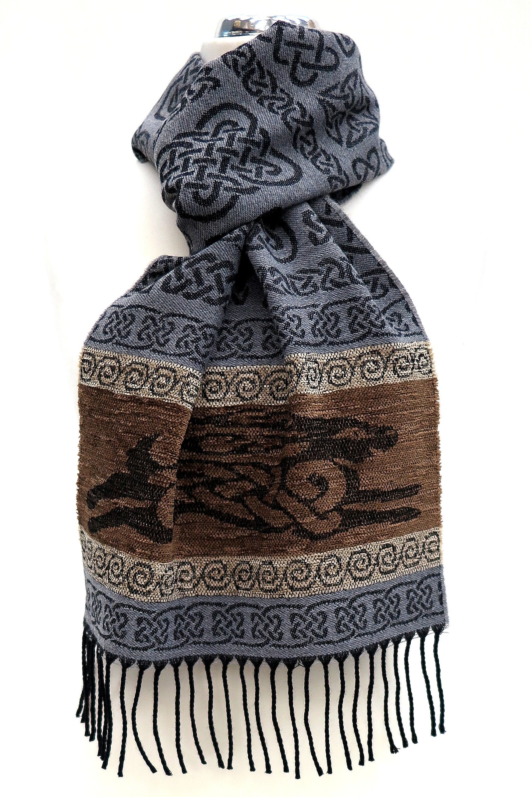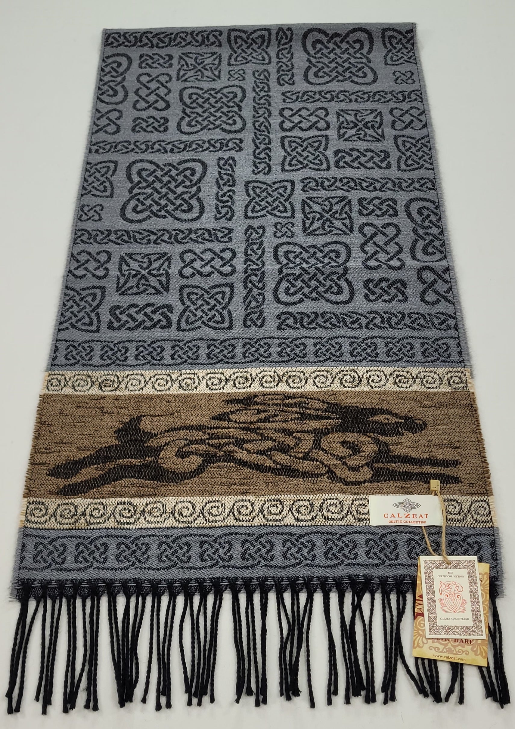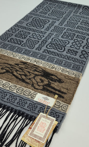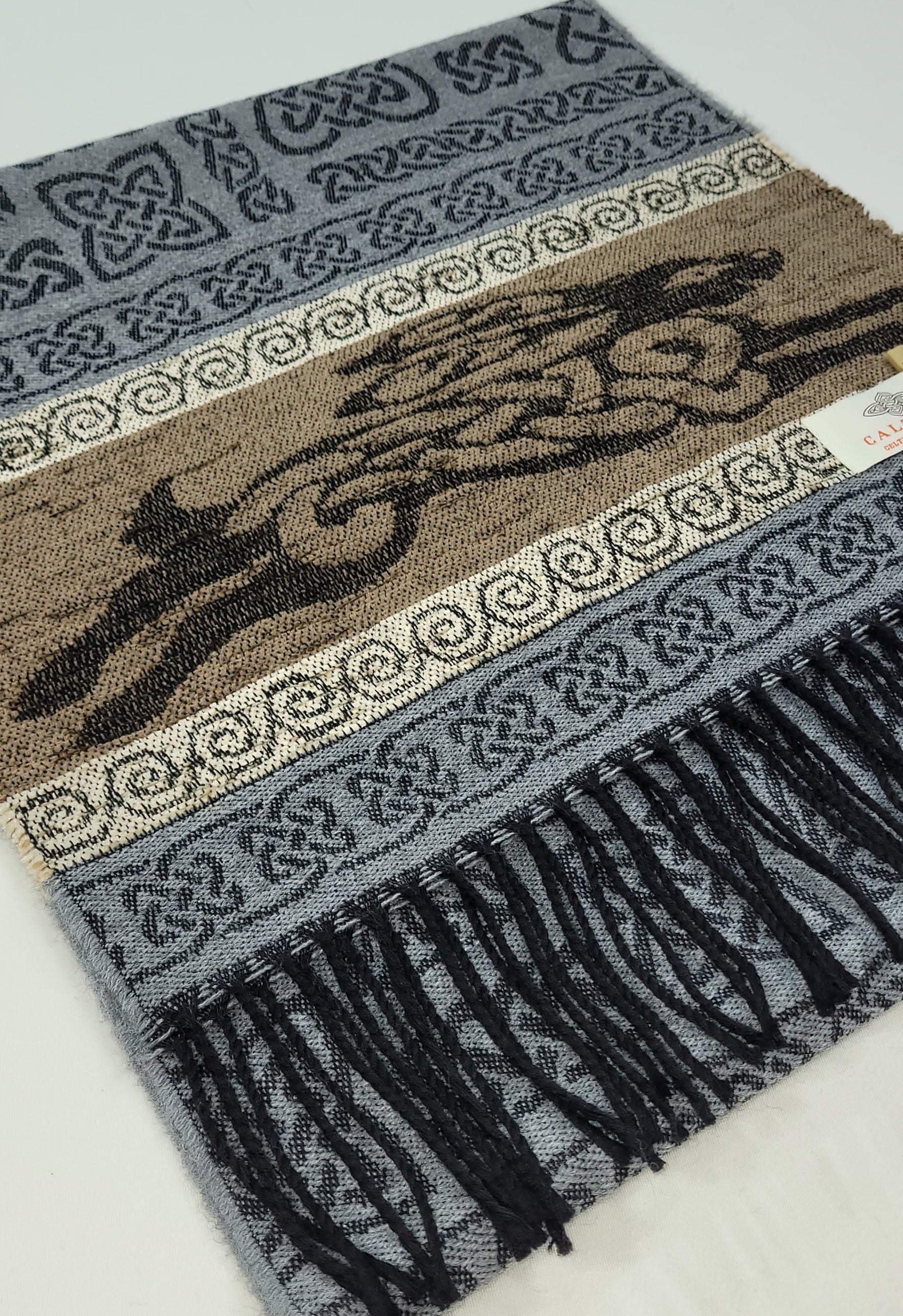 This fabulous scarf is woven in silver grey with a border of taupe and cream chenille depicting a beautiful Celtic hare.