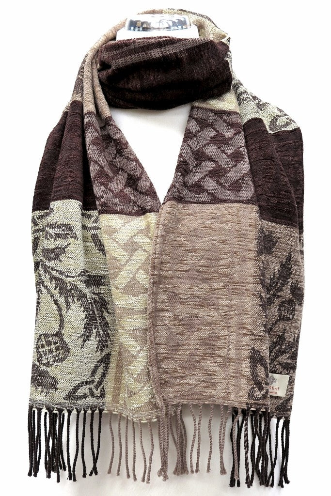 This Thistle Chocolate scarf is a combination of Chocolate , Taupe and Cream. Our scarves are made from our beautiful throws so colour block placement may vary.