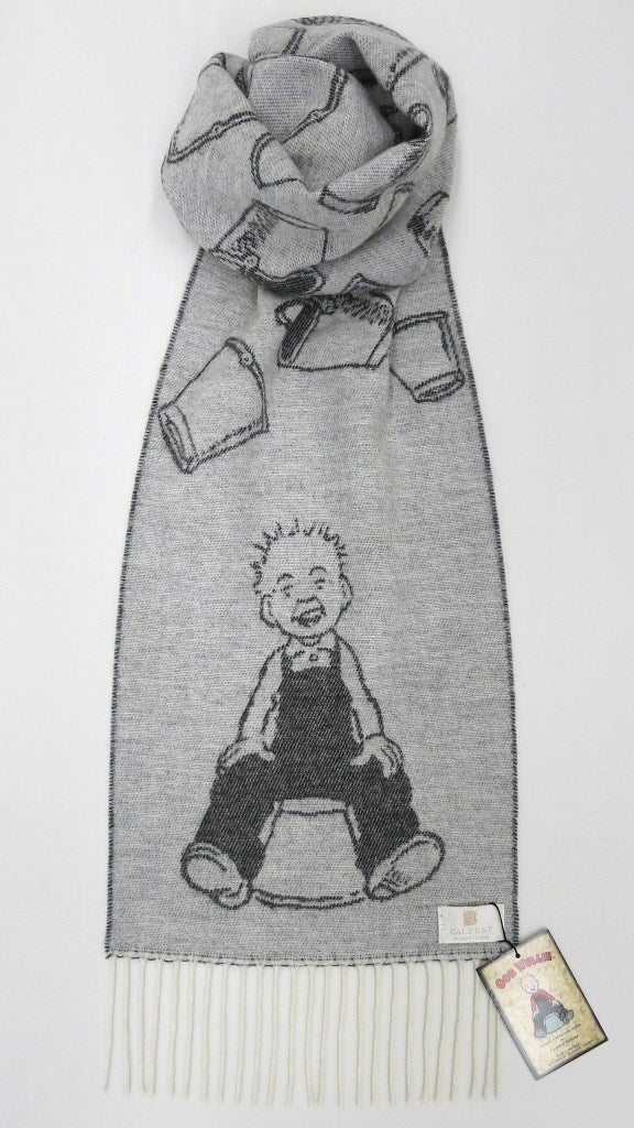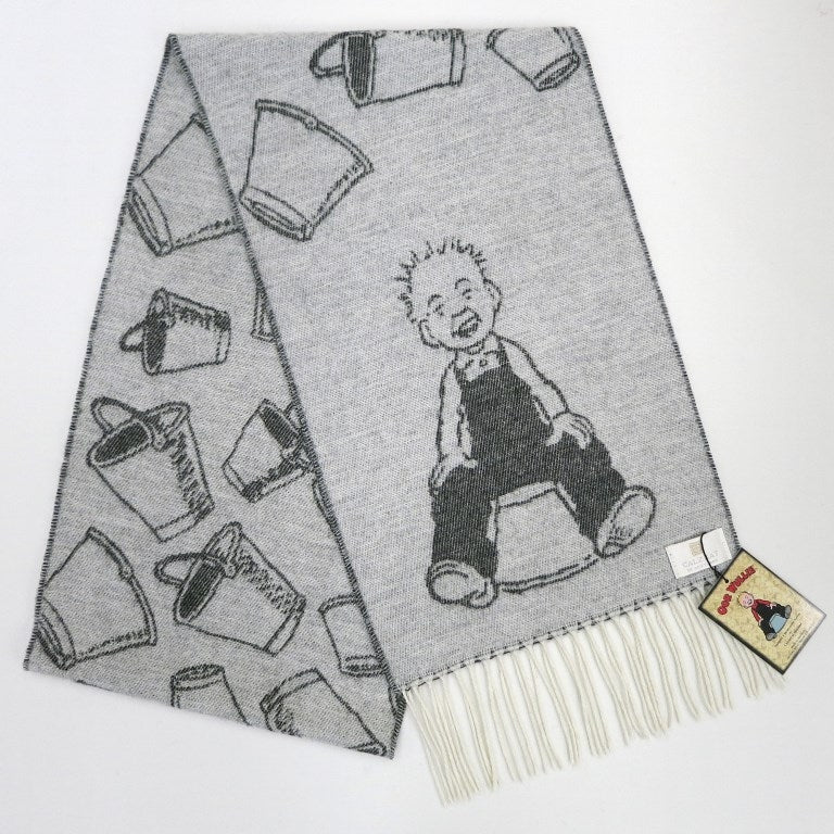 Oor Wullie is one of Scotland's most recognised national treasures and this beautifully soft cashmere blend scarf depicts Wullie sitting on his upturned bucket at each end while the centre of the scarf is filled with many more iconic buckets.
