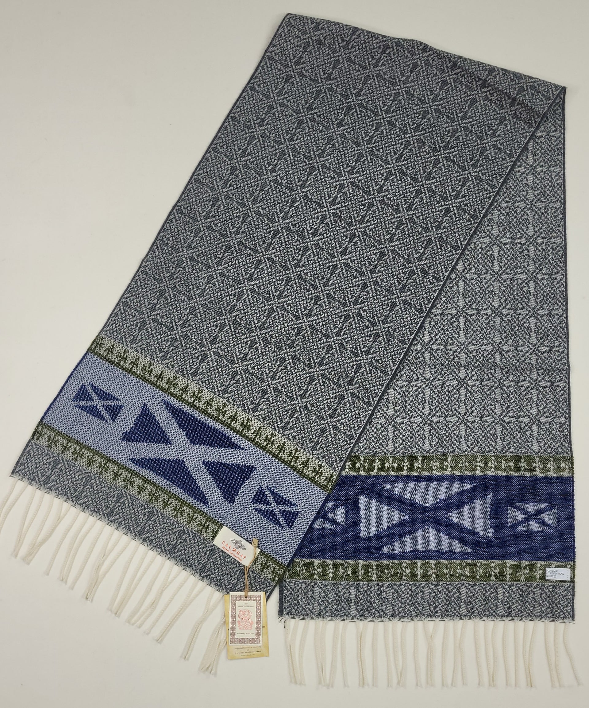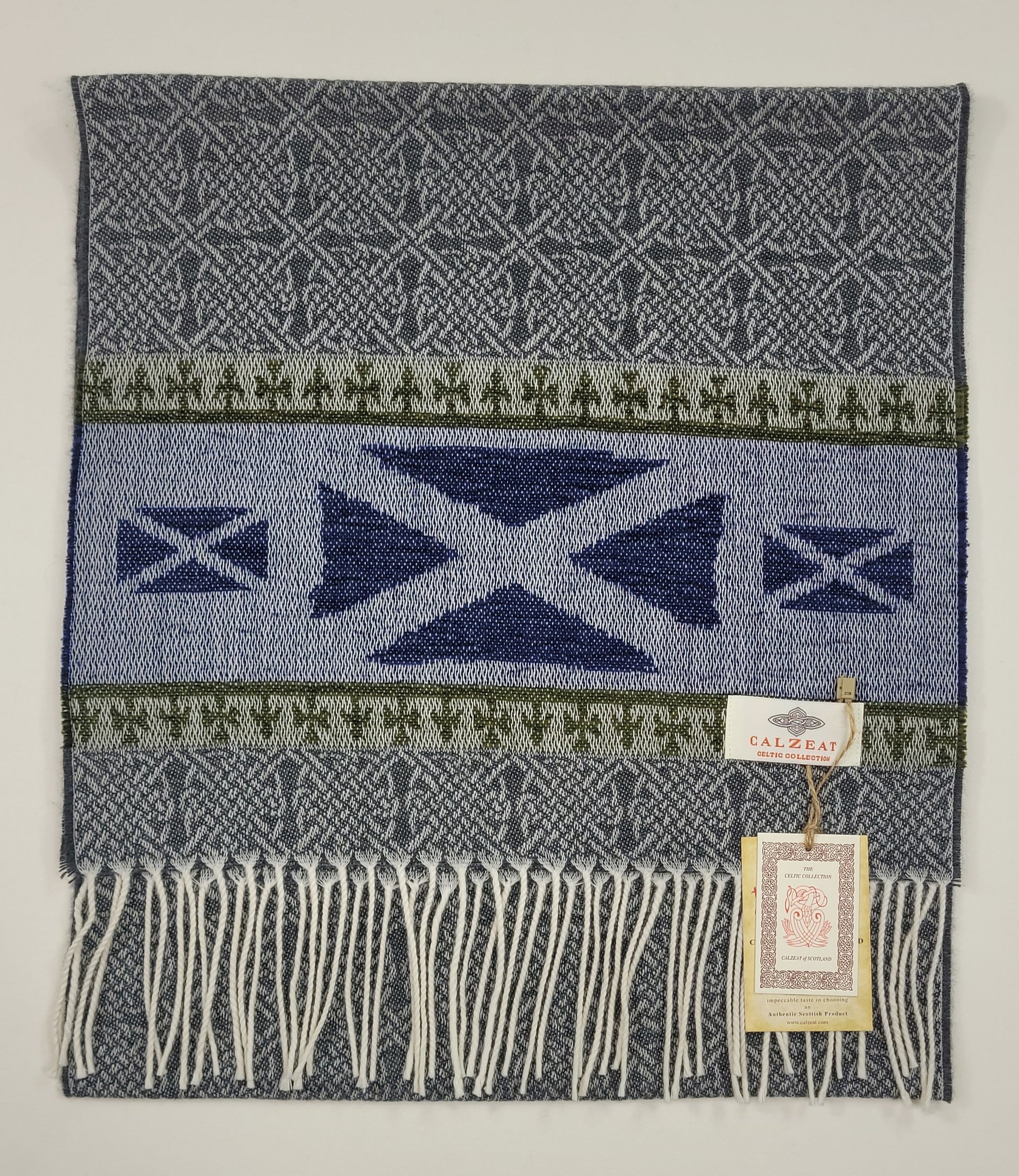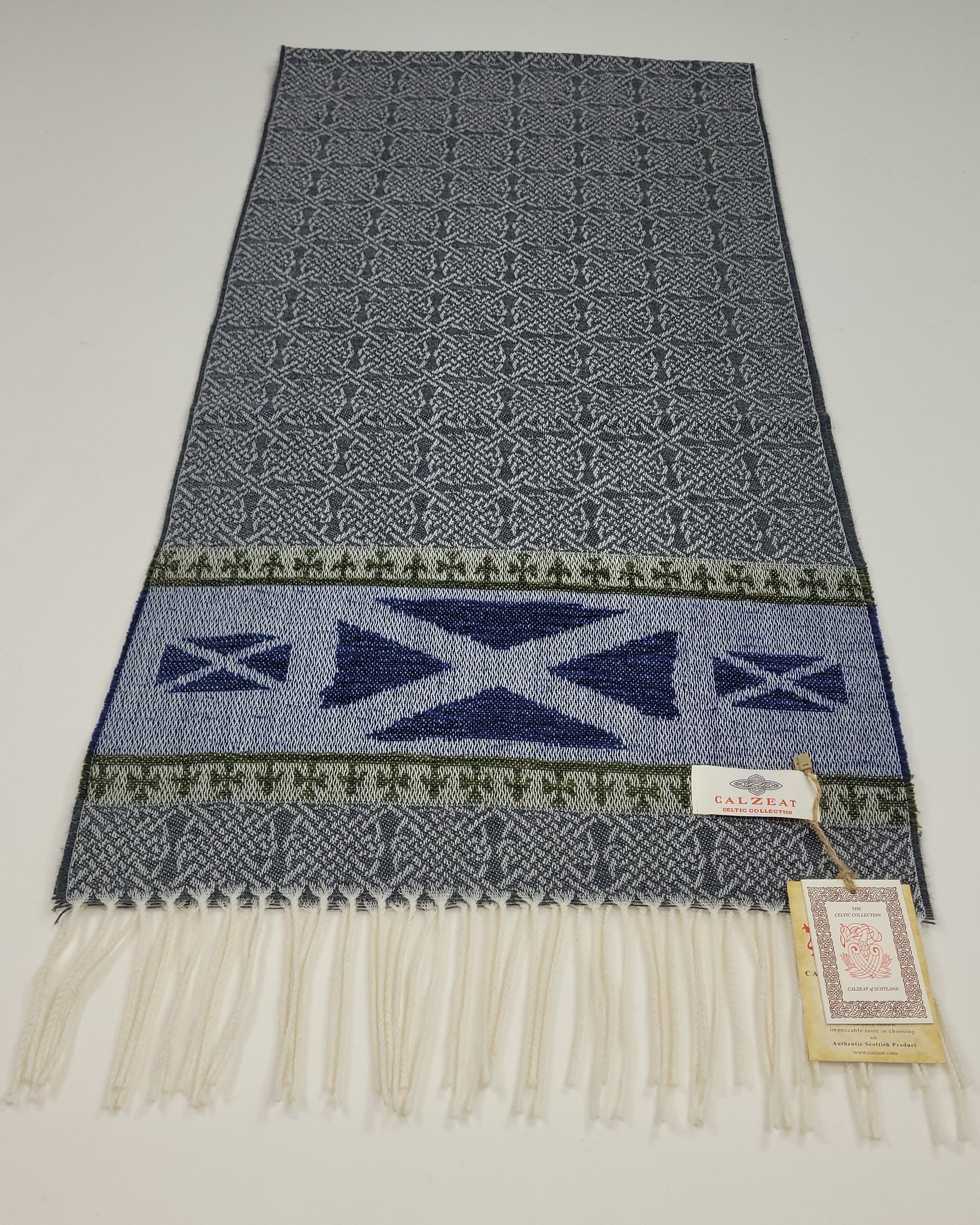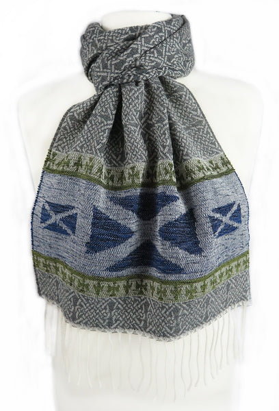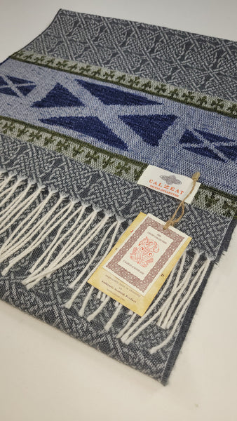 Celtic Alba Saltire Jacquard Scarf The word ‘Saltire’ by definition means “a diagonal cross as a heraldic ordinary” and is the defining factor of Scottish national flag. First hoisted in 1512, the Saltire is thought to be the oldest in Europe. Its white diagonal cross on a blue background is represented in the chennile border of this scarf. An authentic Scottish product exclusively designed and woven by Calzeat of Scotland. |