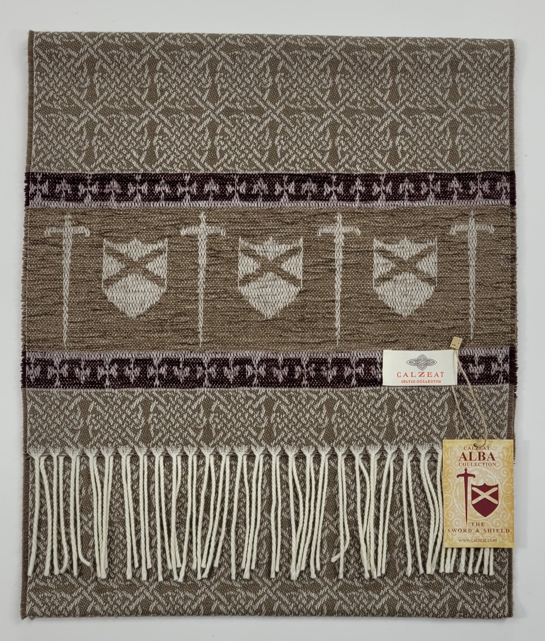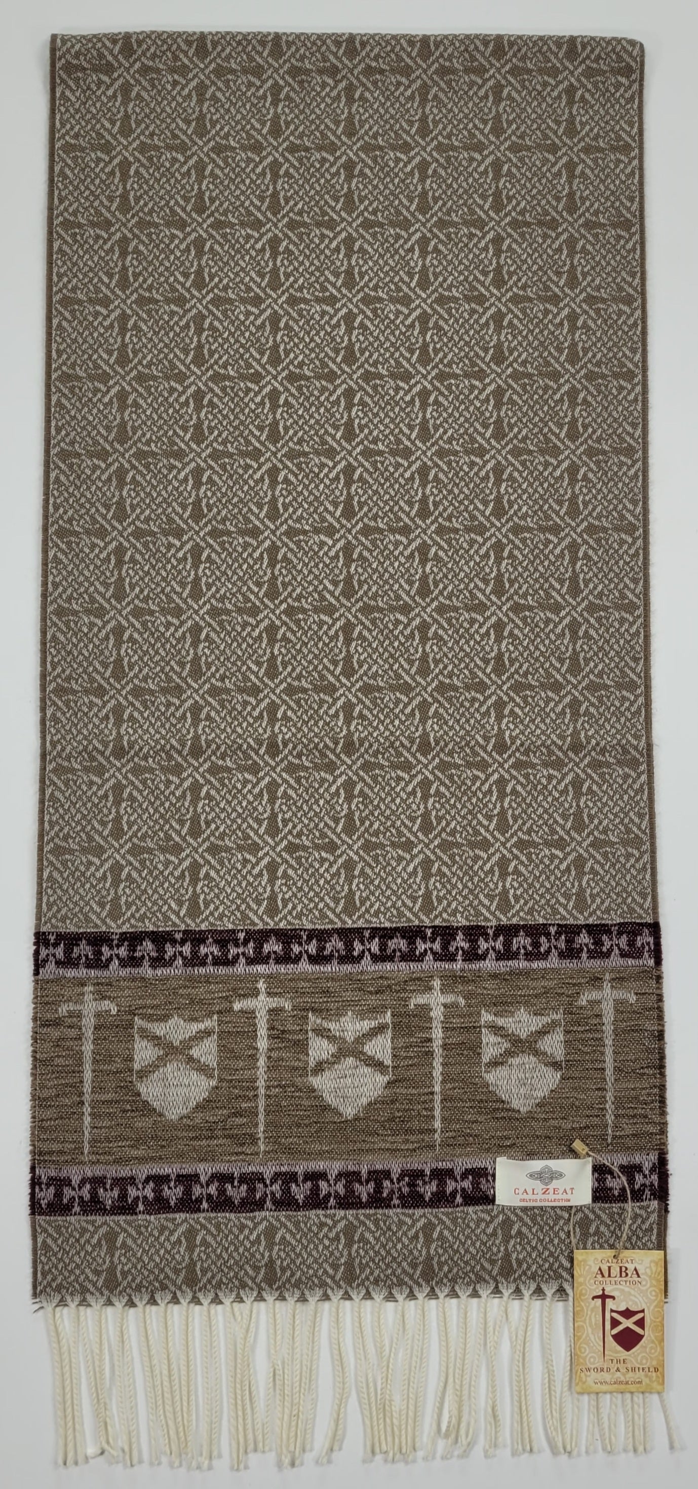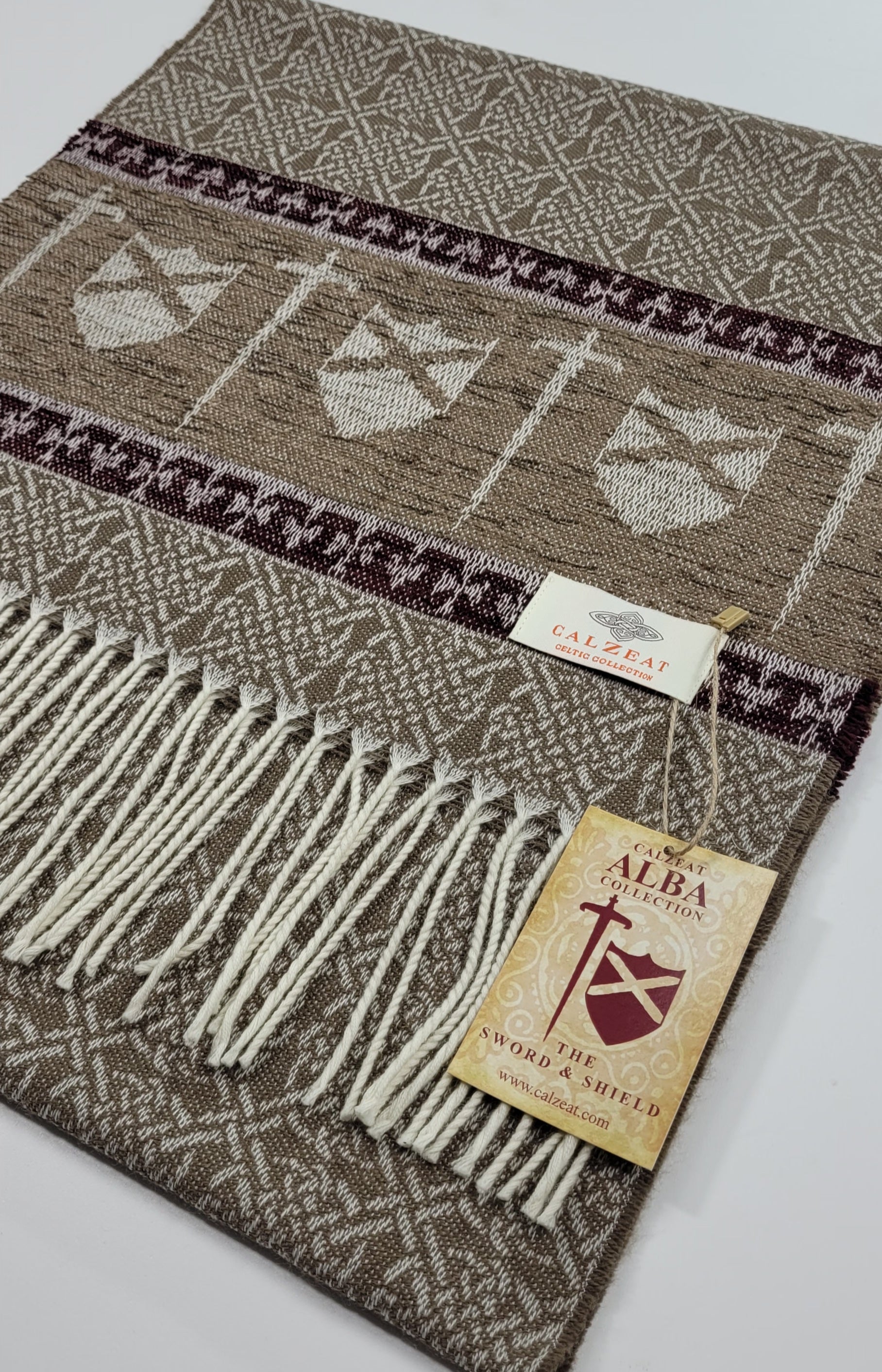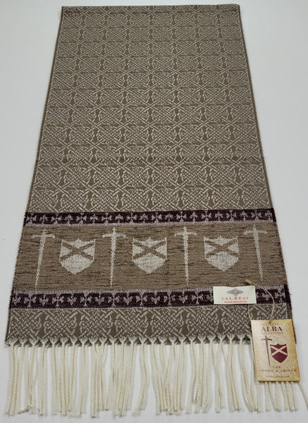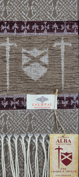 Celtic Alba Sword & Shield Jacquard Scarf This celtic inspired scarf is woven in warm tones of taupe brown and deep red it features a border of luxurious chenille depicting a sword and shield. An authentic Scottish product exclusively designed and woven by Calzeat of Scotland. |