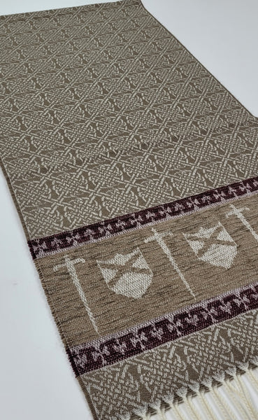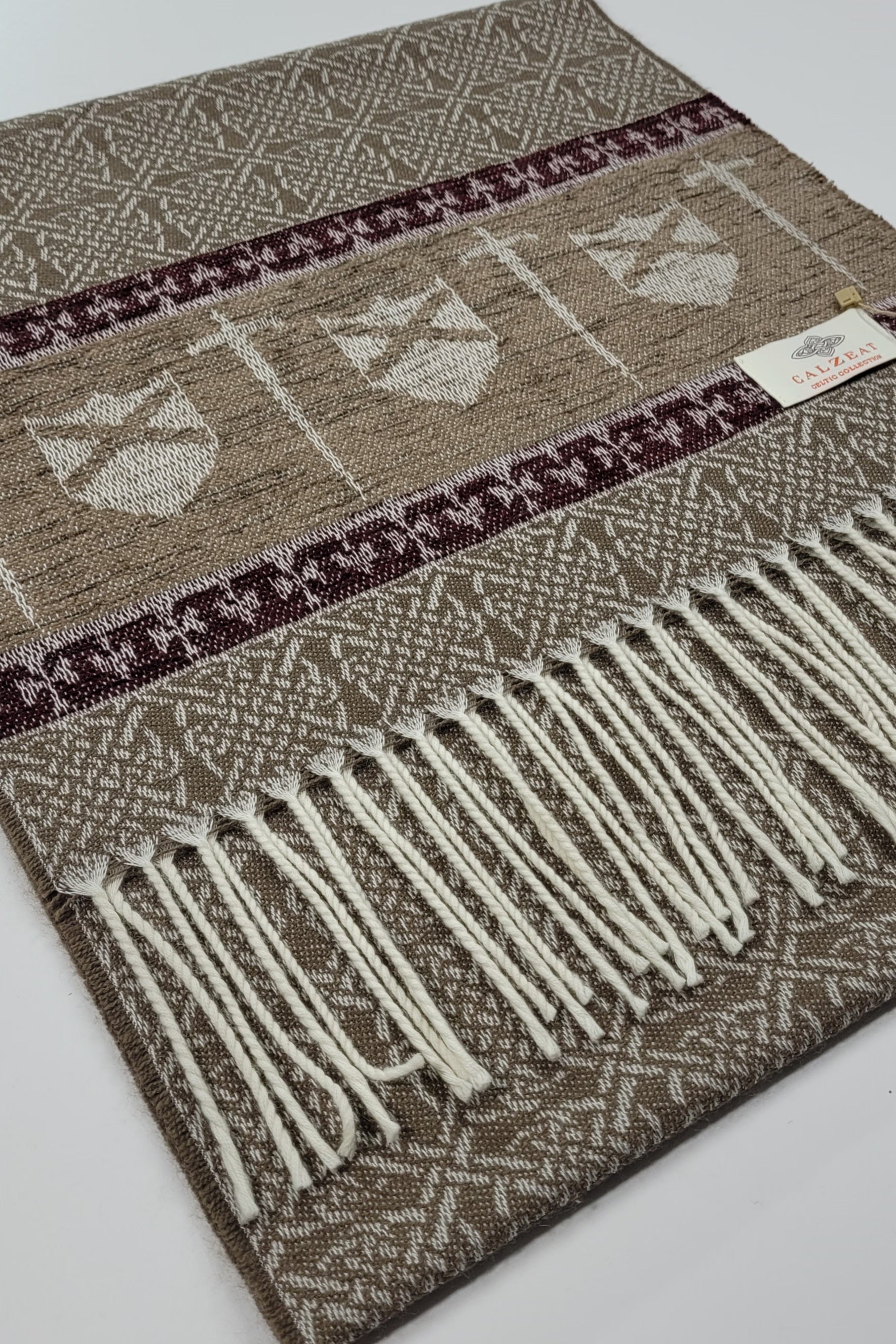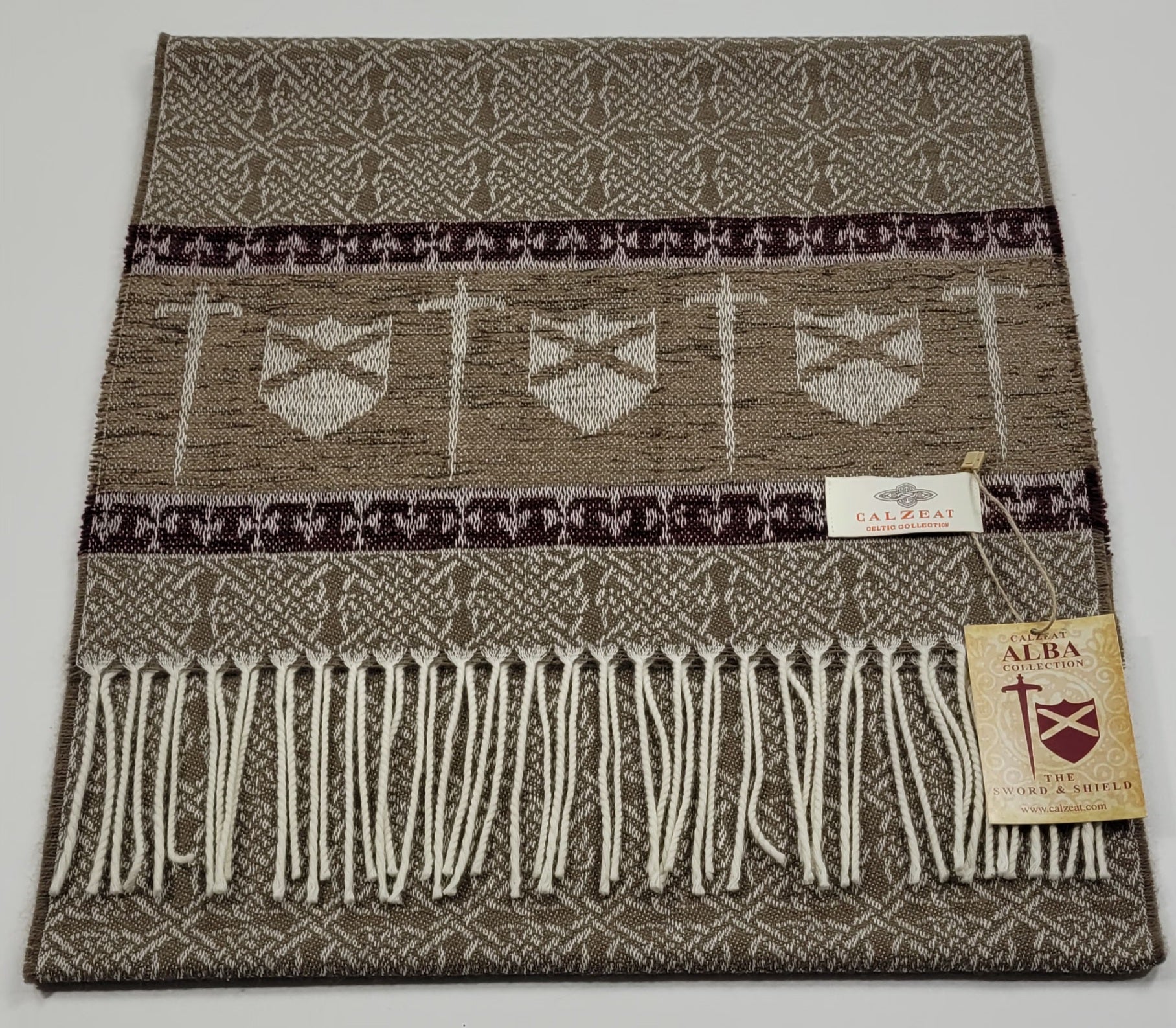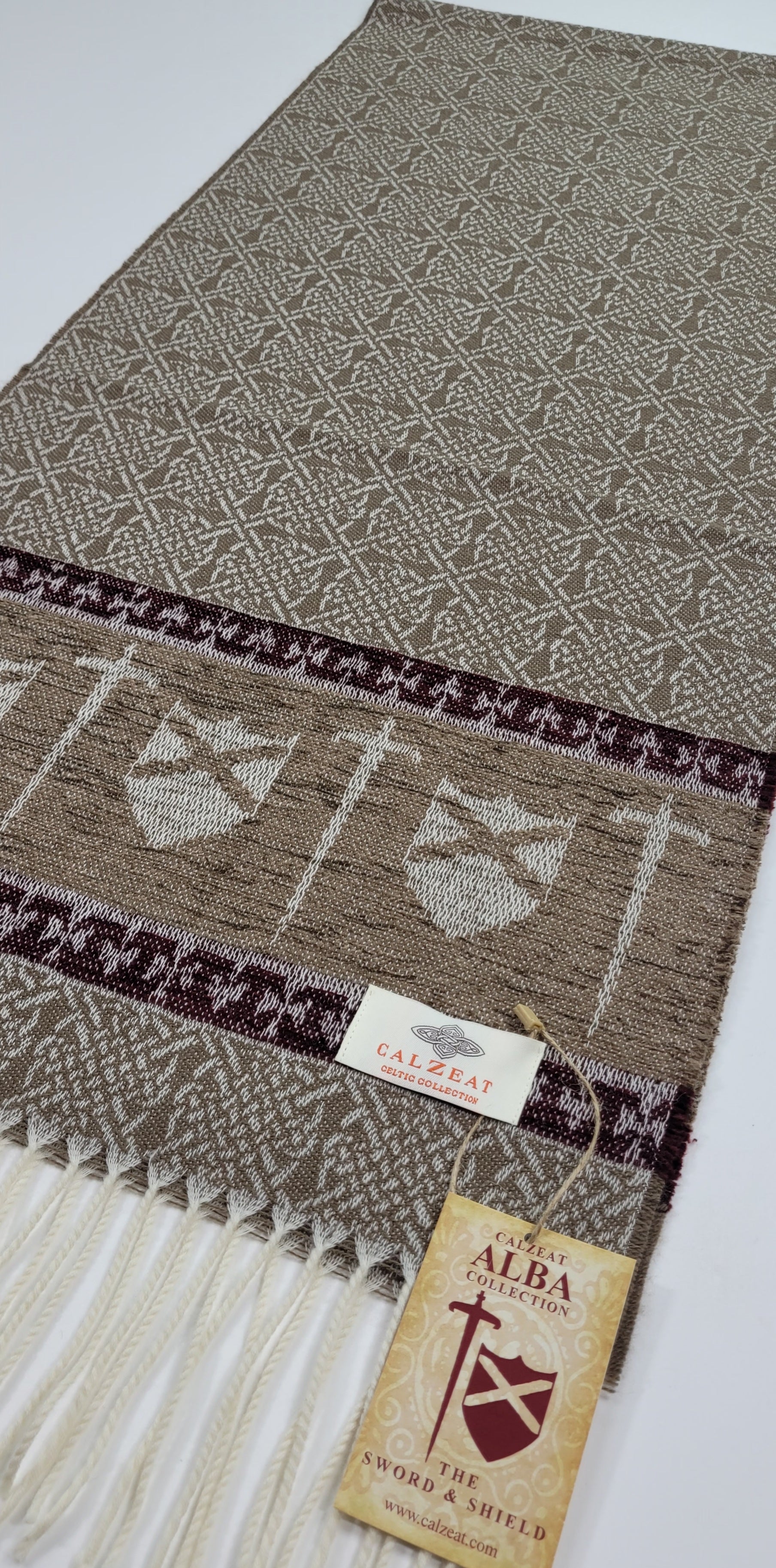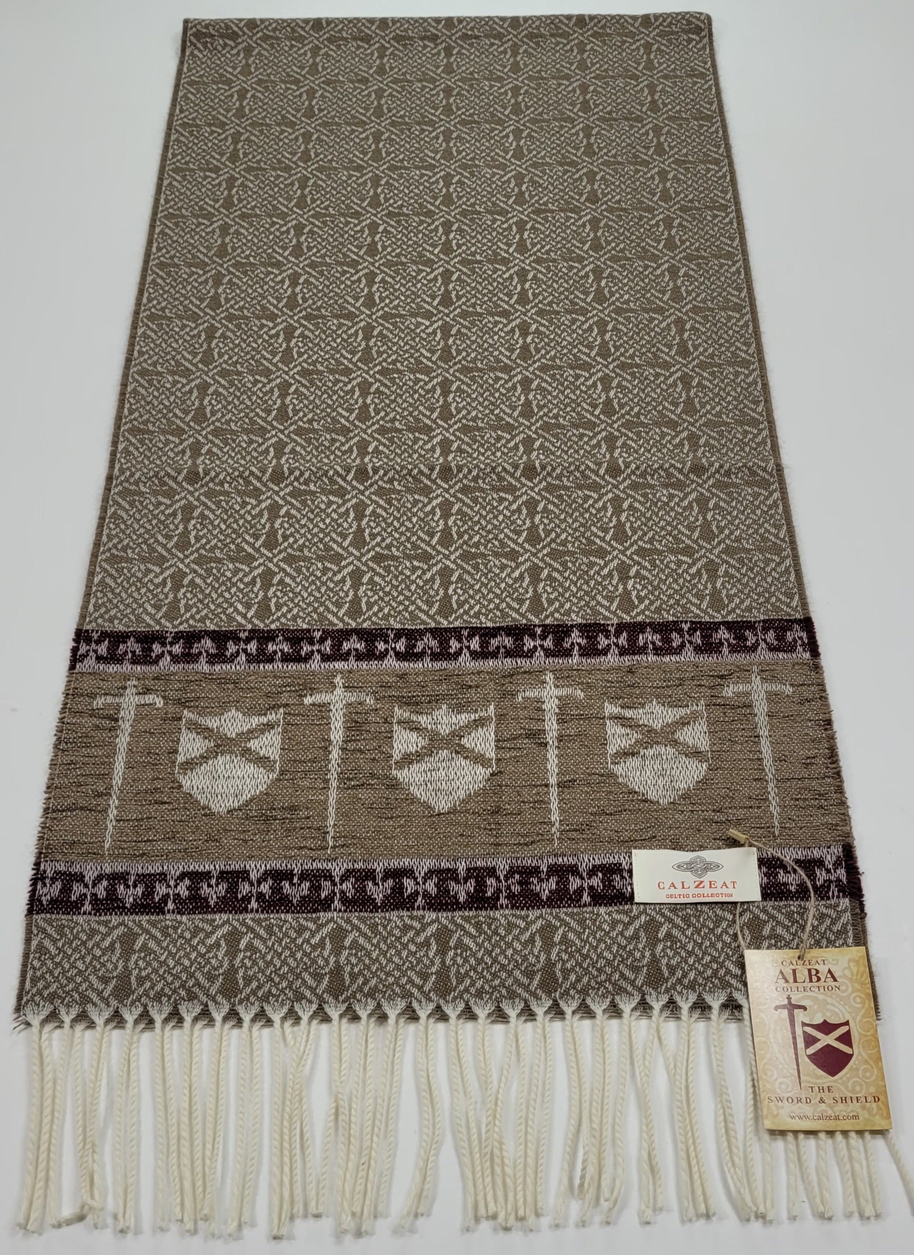 Celtic Alba Sword & Shield Jacquard Scarf This celtic inspired scarf is woven in warm tones of taupe brown and deep red it features a border of luxurious chenille depicting a sword and shield. An authentic Scottish product exclusively designed and woven by Calzeat of Scotland. |