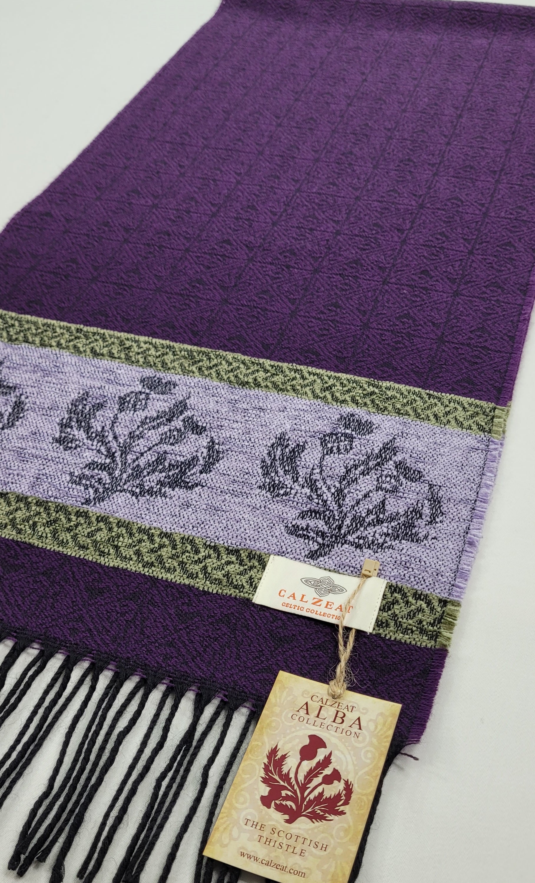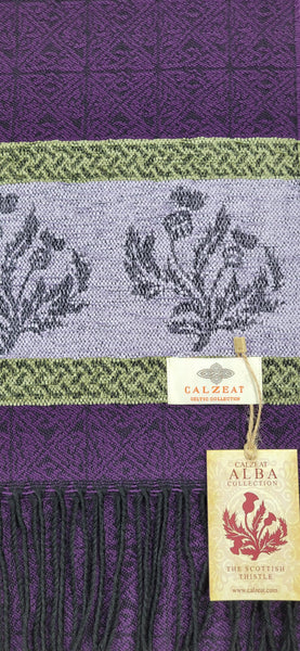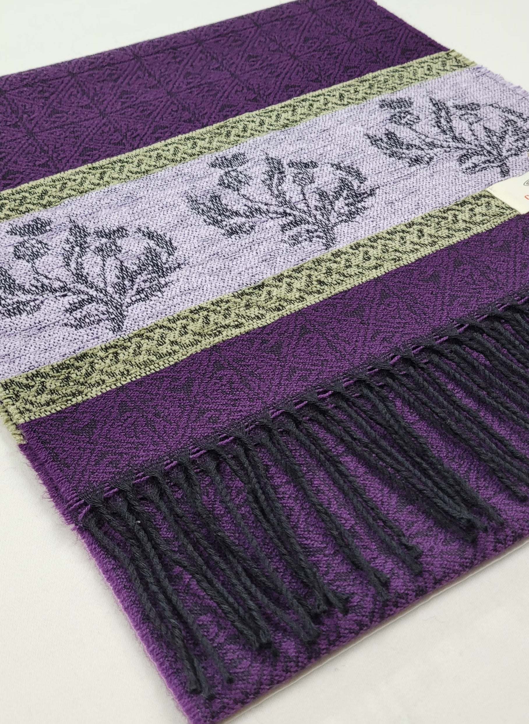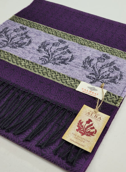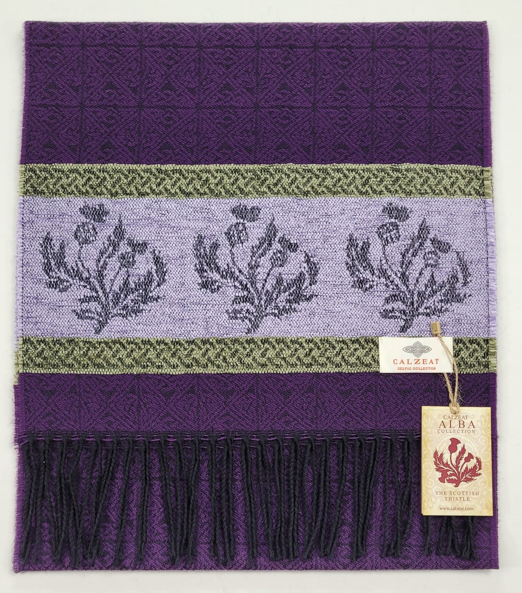 Celtic Thistle Purple woven scarf in Worsted Wool and luxurious Chenille. Dimensions: 35 x 170 cms Including Fringes Composition: 45% Wool/55% Chenille An authentic Scottish product exclusively designed and woven by Calzeat of Scotland |
