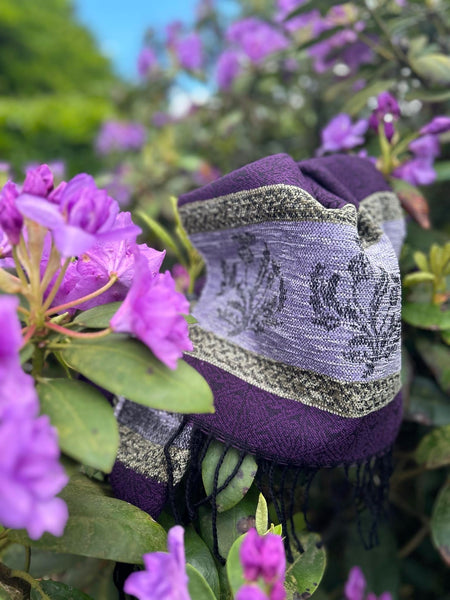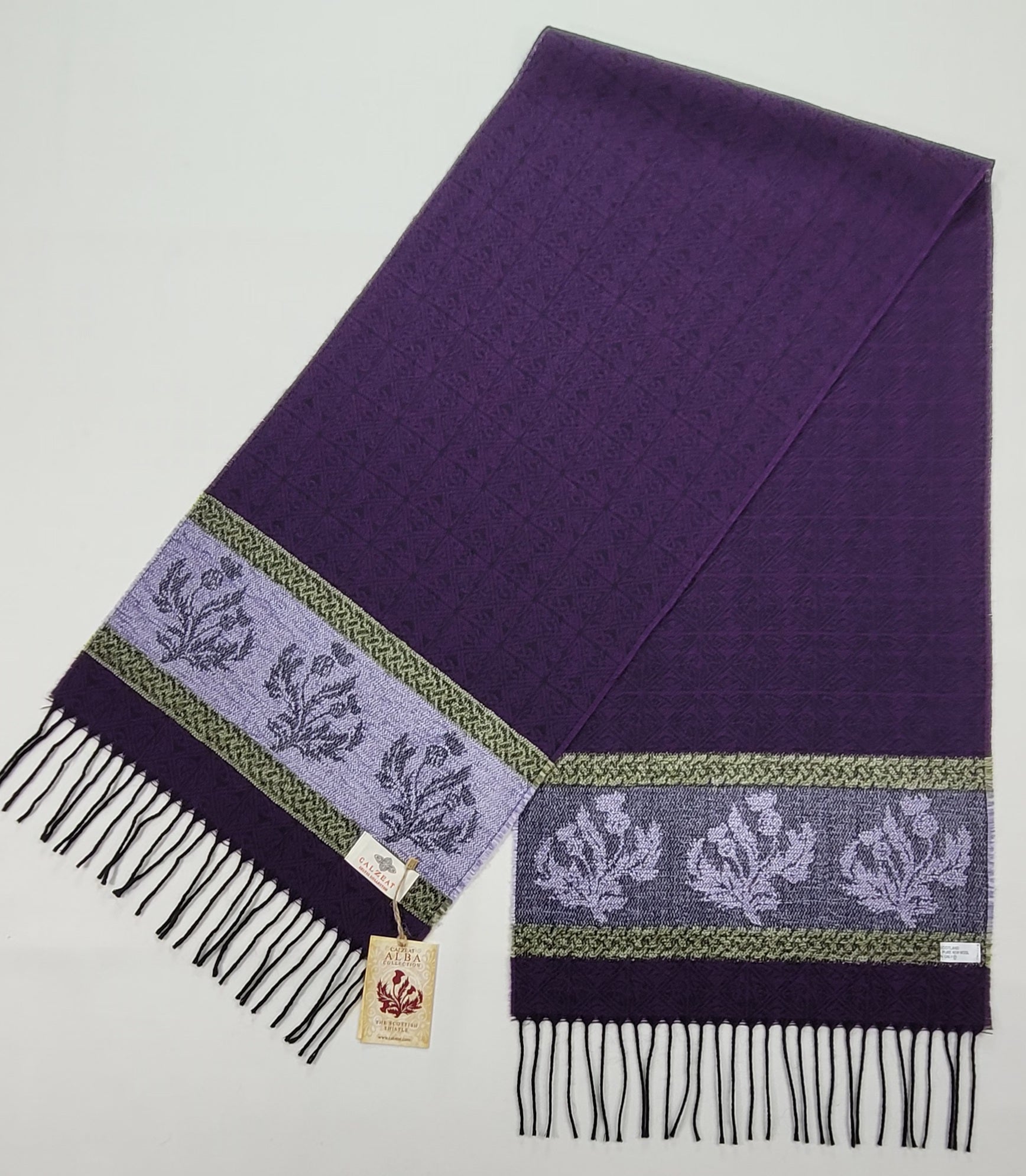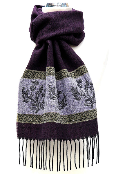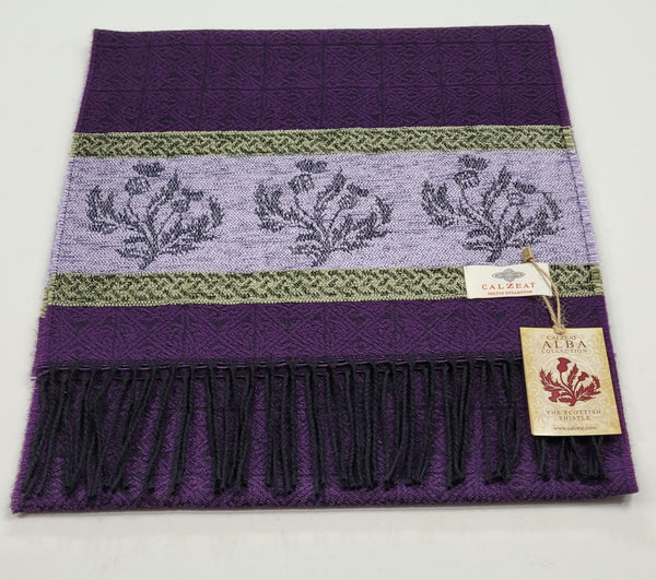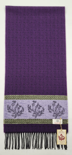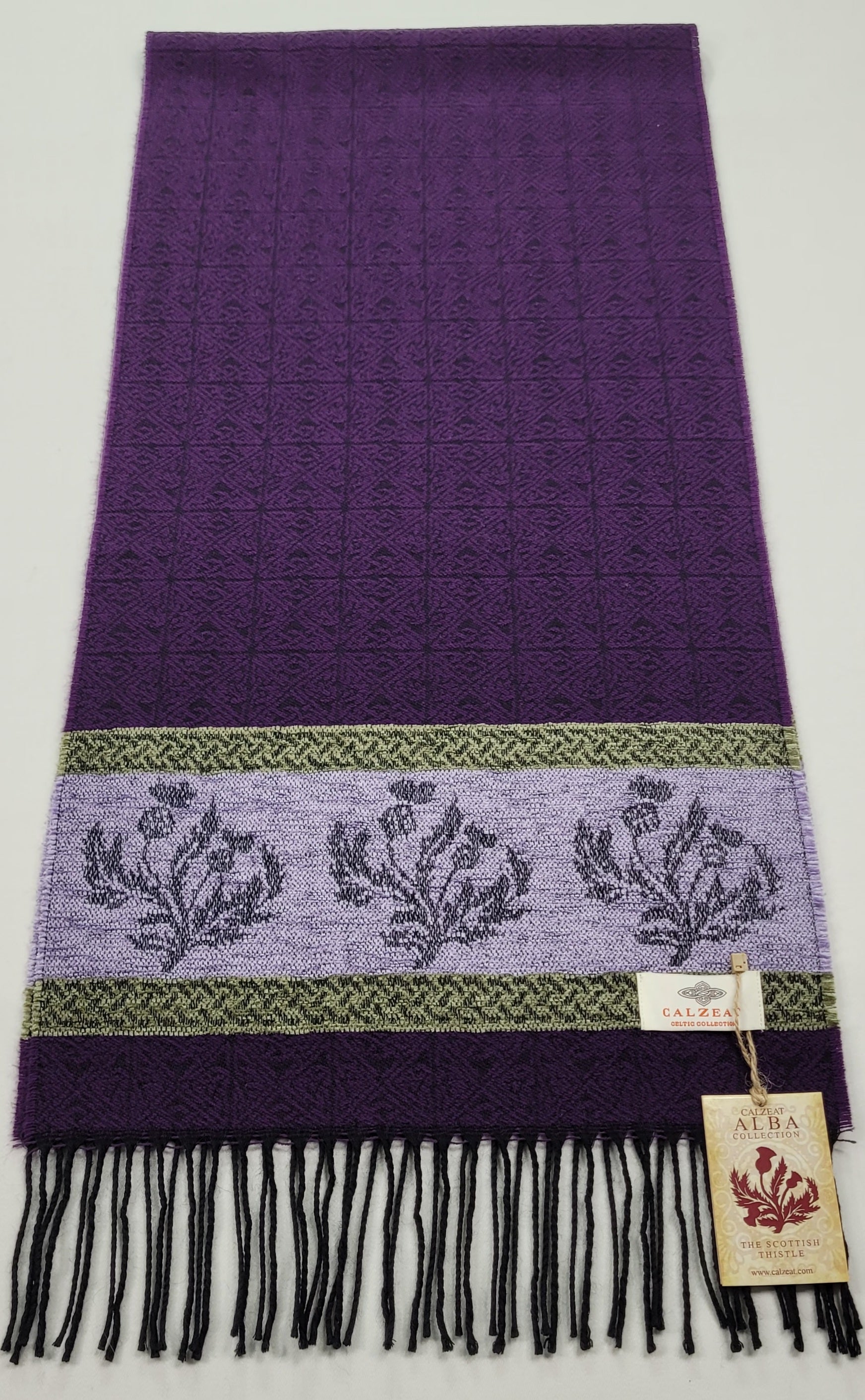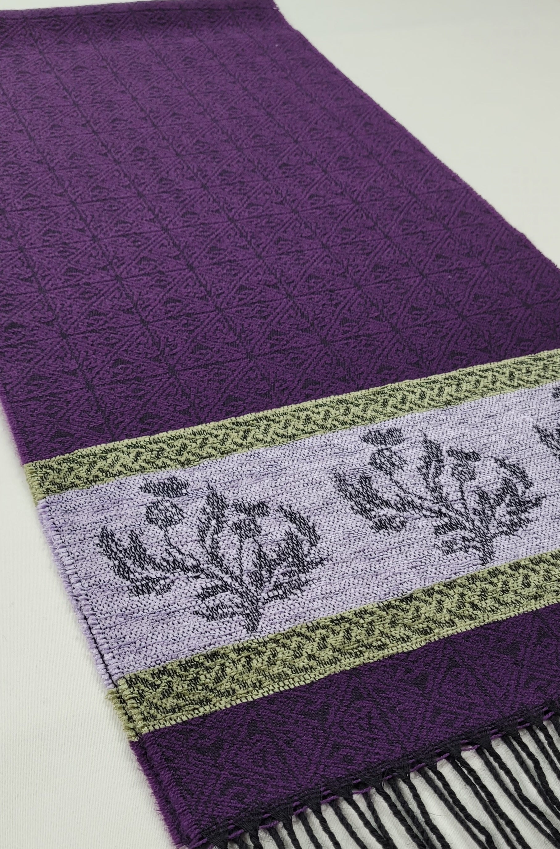 Celtic Thistle Purple woven scarf in Worsted Wool and luxurious Chenille. Dimensions: 35 x 170 cms Including Fringes Composition: 45% Wool/55% Chenille An authentic Scottish product exclusively designed and woven by Calzeat of Scotland |
