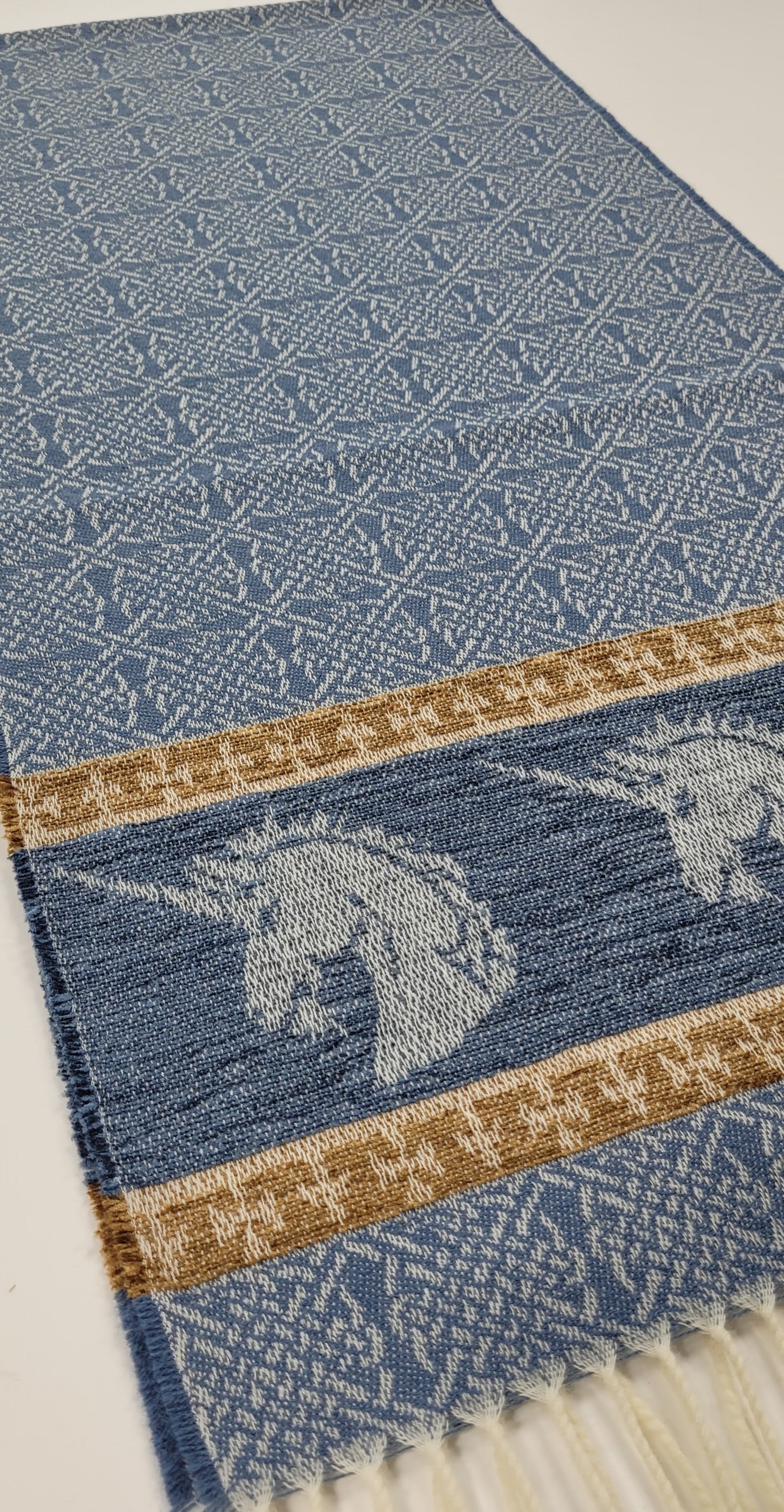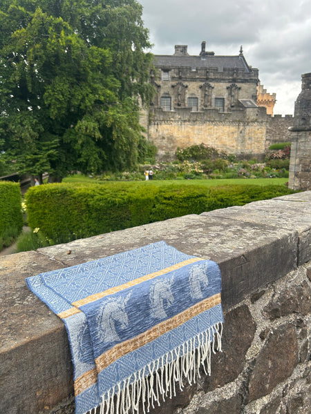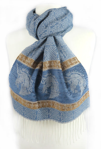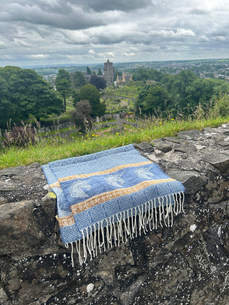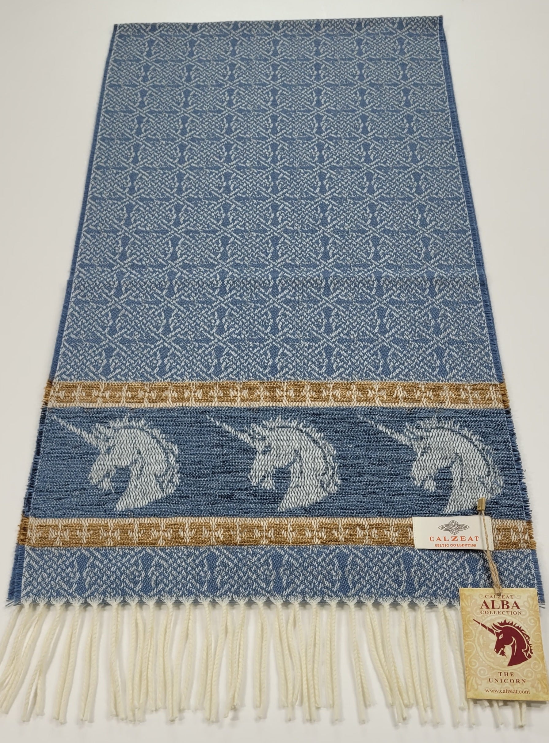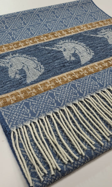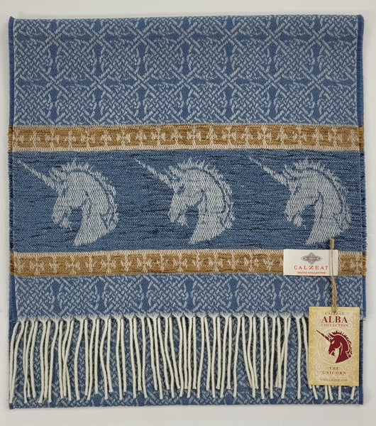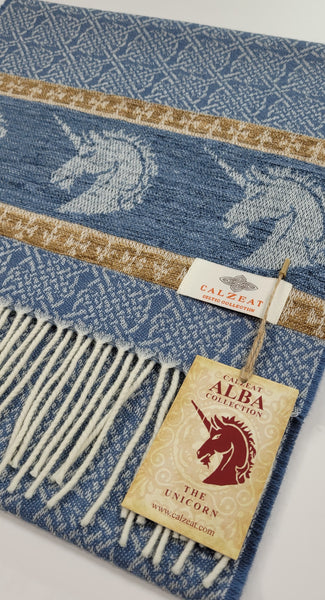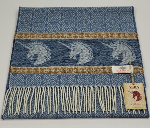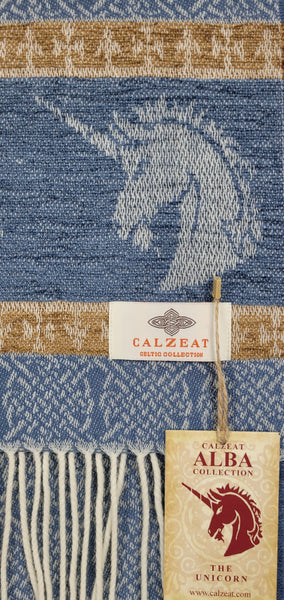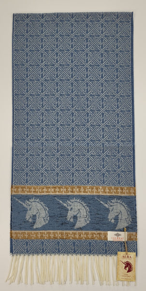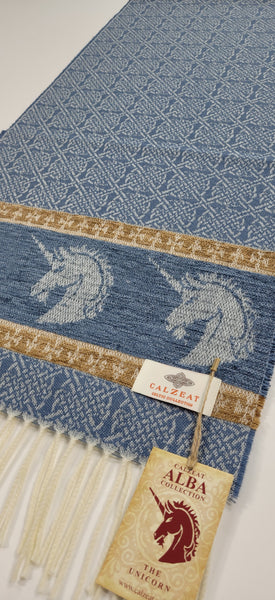 Celtic Alba Unicorn Jacquard Scarf In Celtic mythology the unicorn was a symbol of purity and innocence, as well as masculinity and power. A unicorns head can be found bordering our scarf in a luxurious rich blue chenille. Tales of dominance and chivalry surround the unicorn and we belive for these reasons it was chosen as Scotland’s national animal. An authentic Scottish product exclusively designed and woven by Calzeat of Scotland. |
