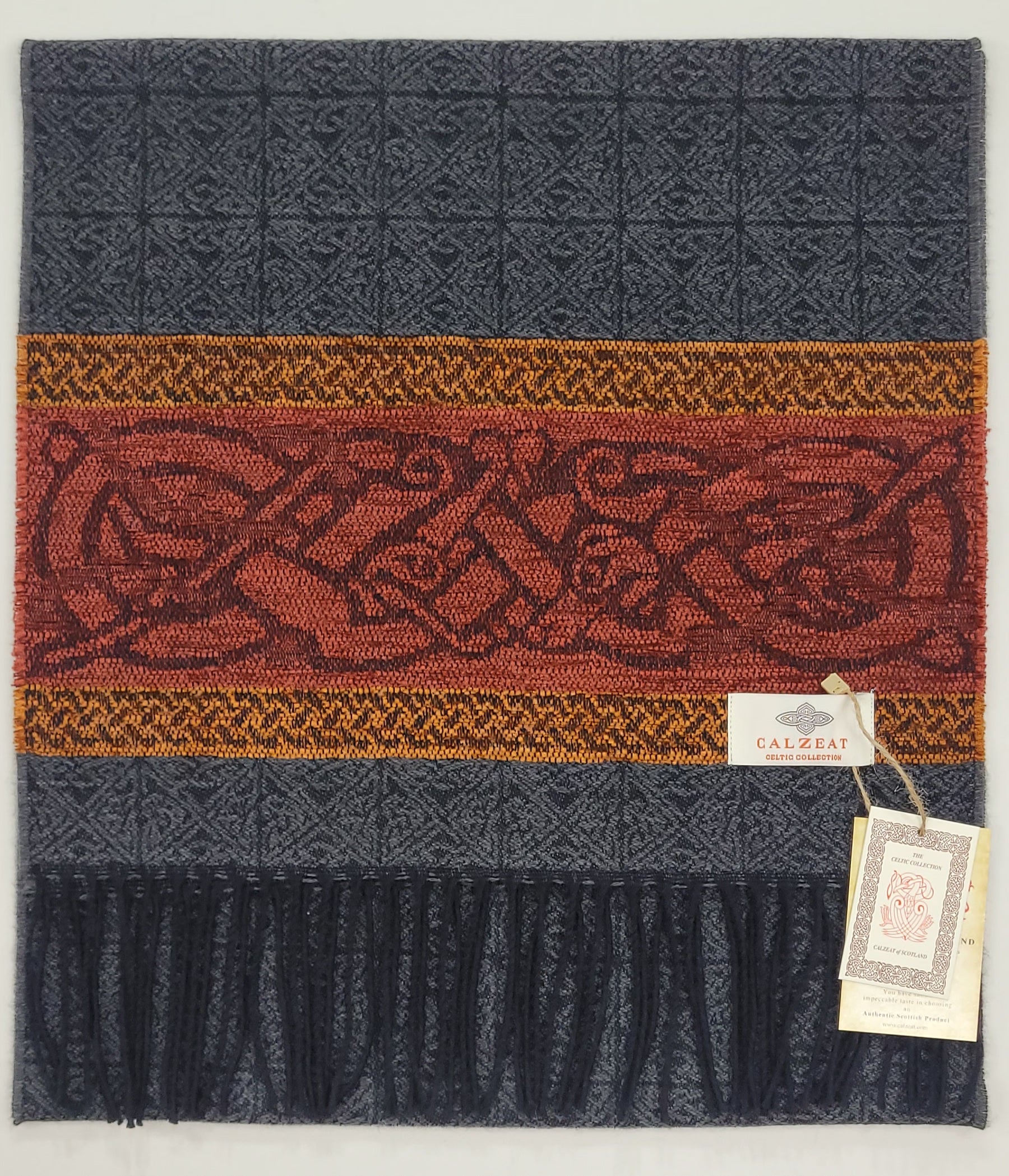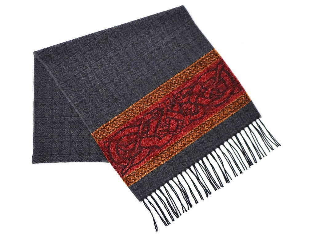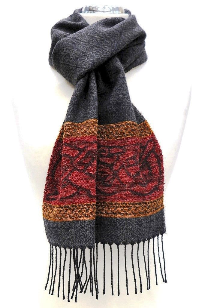 Celtic Dog Charcoal Jacquard woven scarf in Worsted Wool and luxurious Chenille. Dimensions: 35 x 170 cms including Fringes Composition: 45% Wool/55% Chenille An authentic Scottish product exclusively designed and woven by Calzeat of Scotland. |