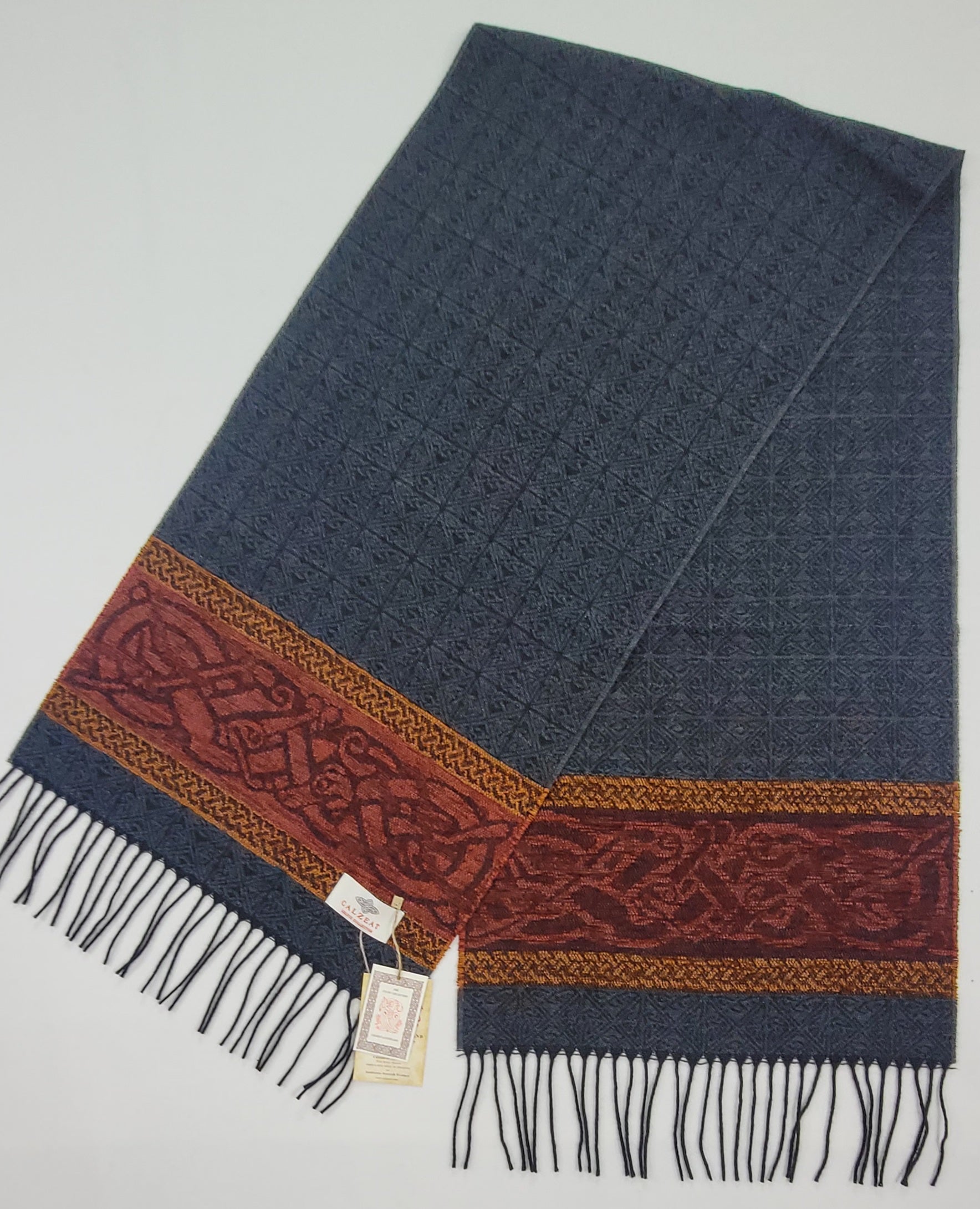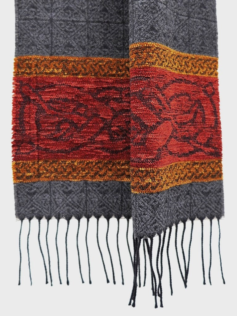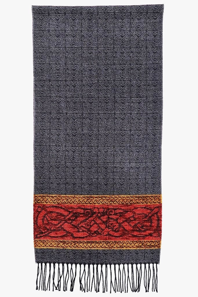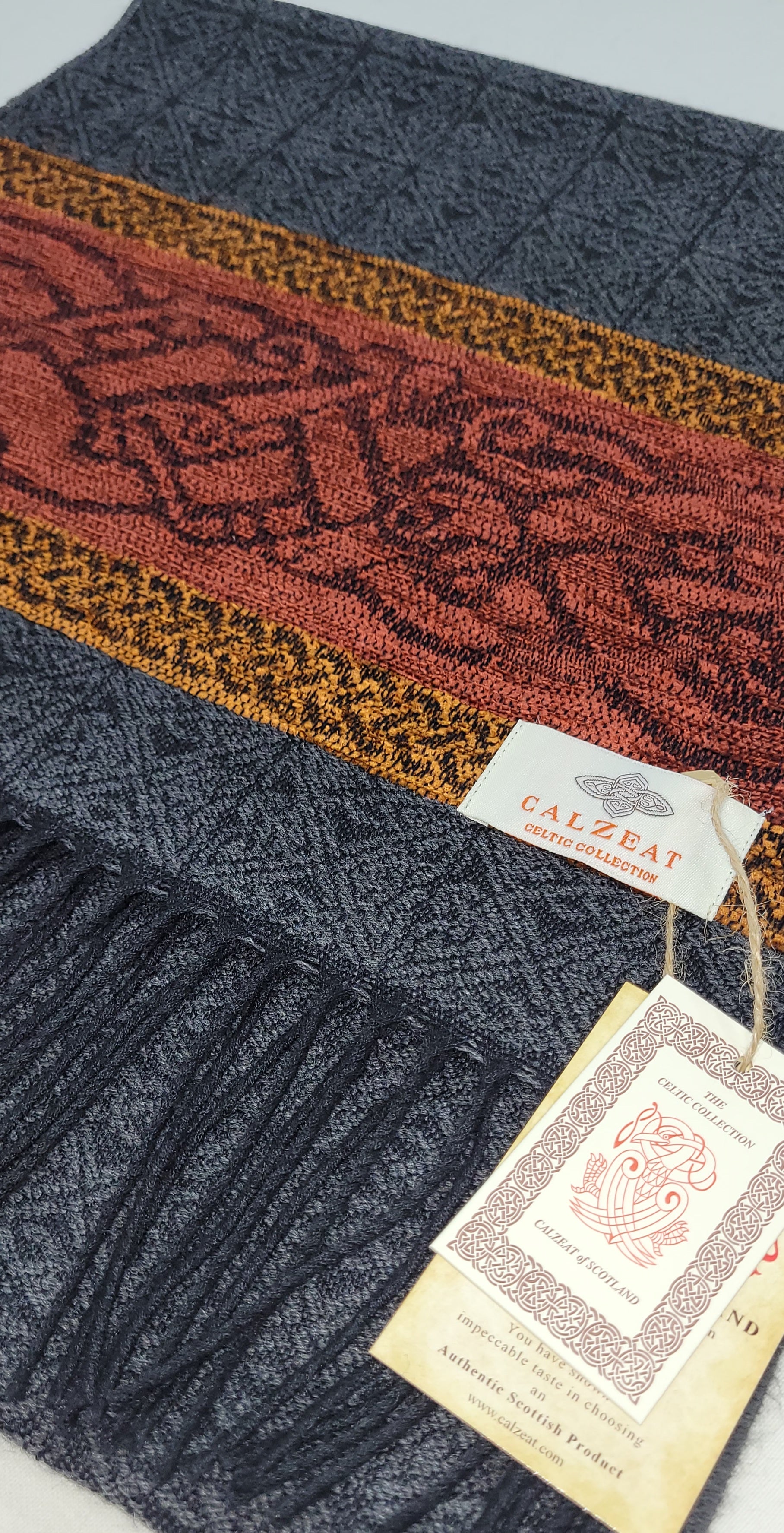 Celtic Dog Charcoal Jacquard woven scarf in Worsted Wool and luxurious Chenille. Dimensions: 35 x 170 cms including Fringes Composition: 45% Wool/55% Chenille An authentic Scottish product exclusively designed and woven by Calzeat of Scotland. |