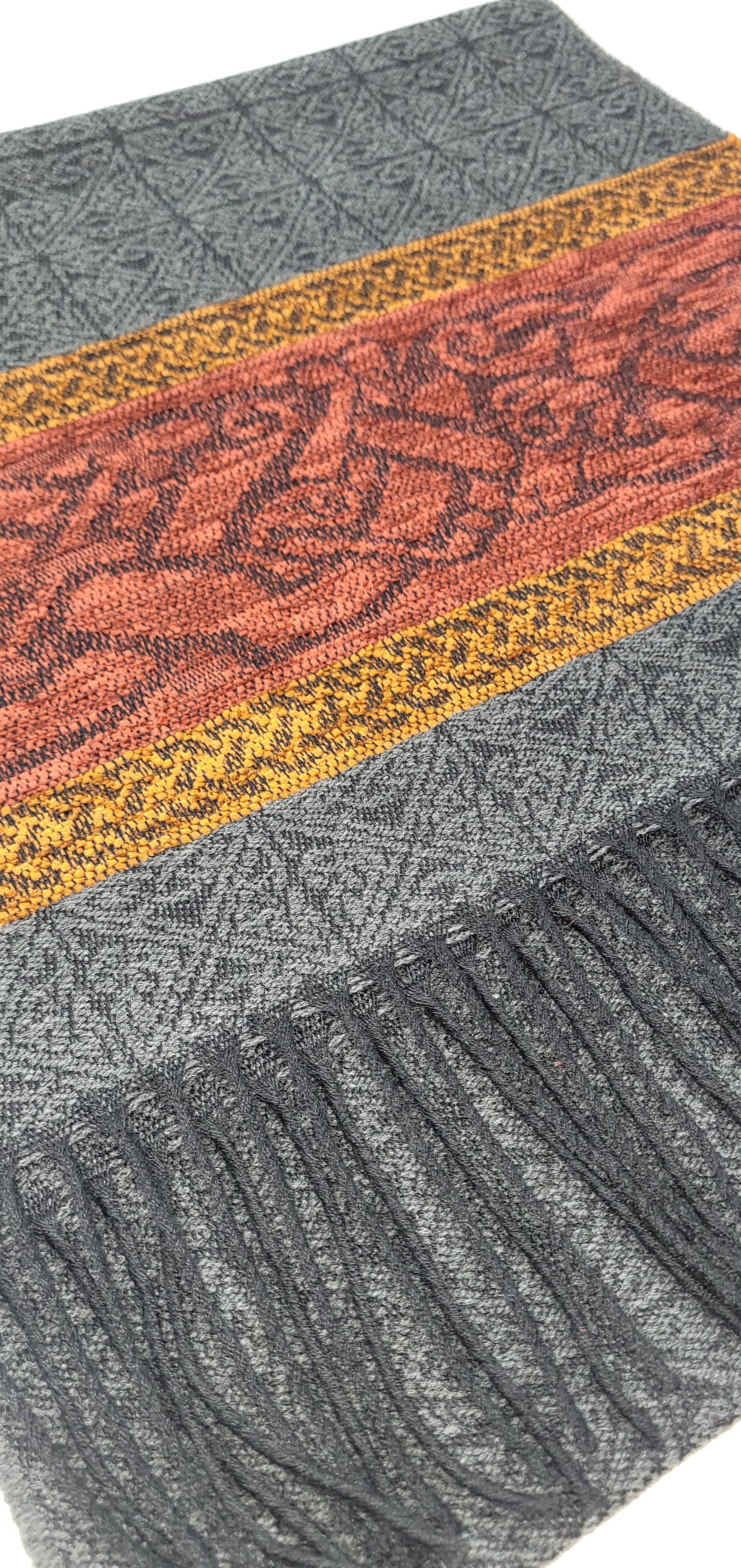 This timeless popular scarf is a classic combination of charcoal with a madras and russet chenille border.
