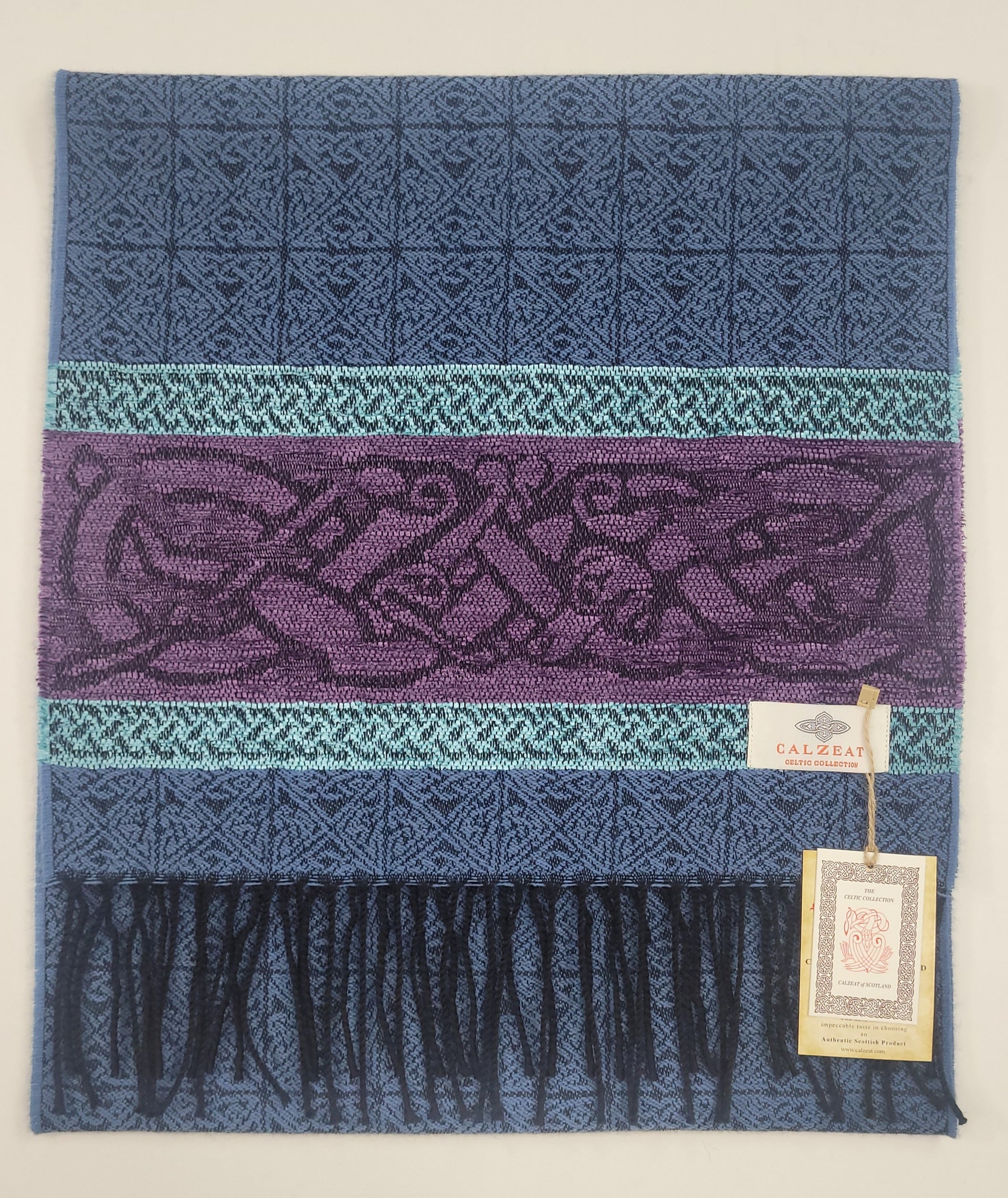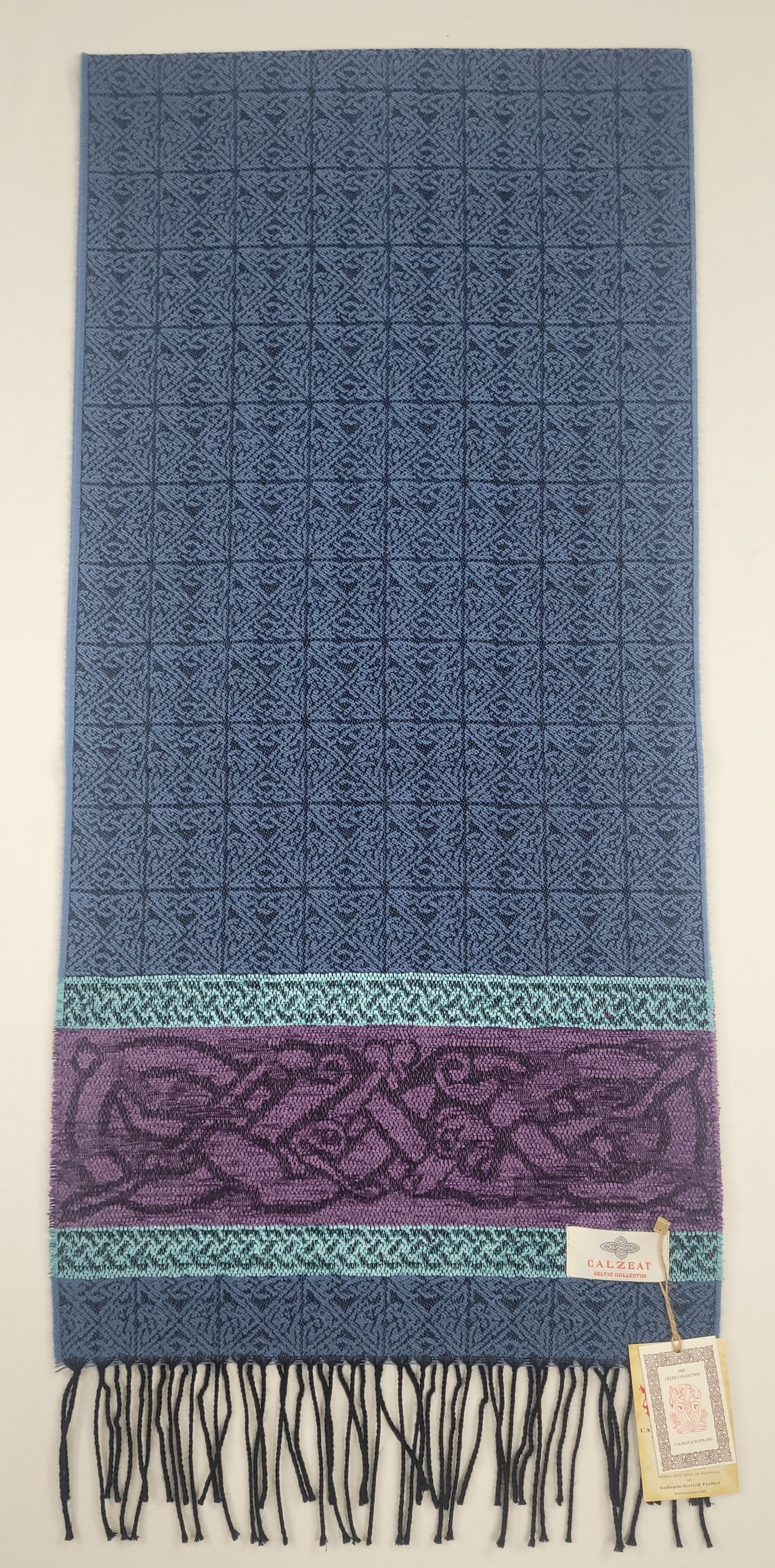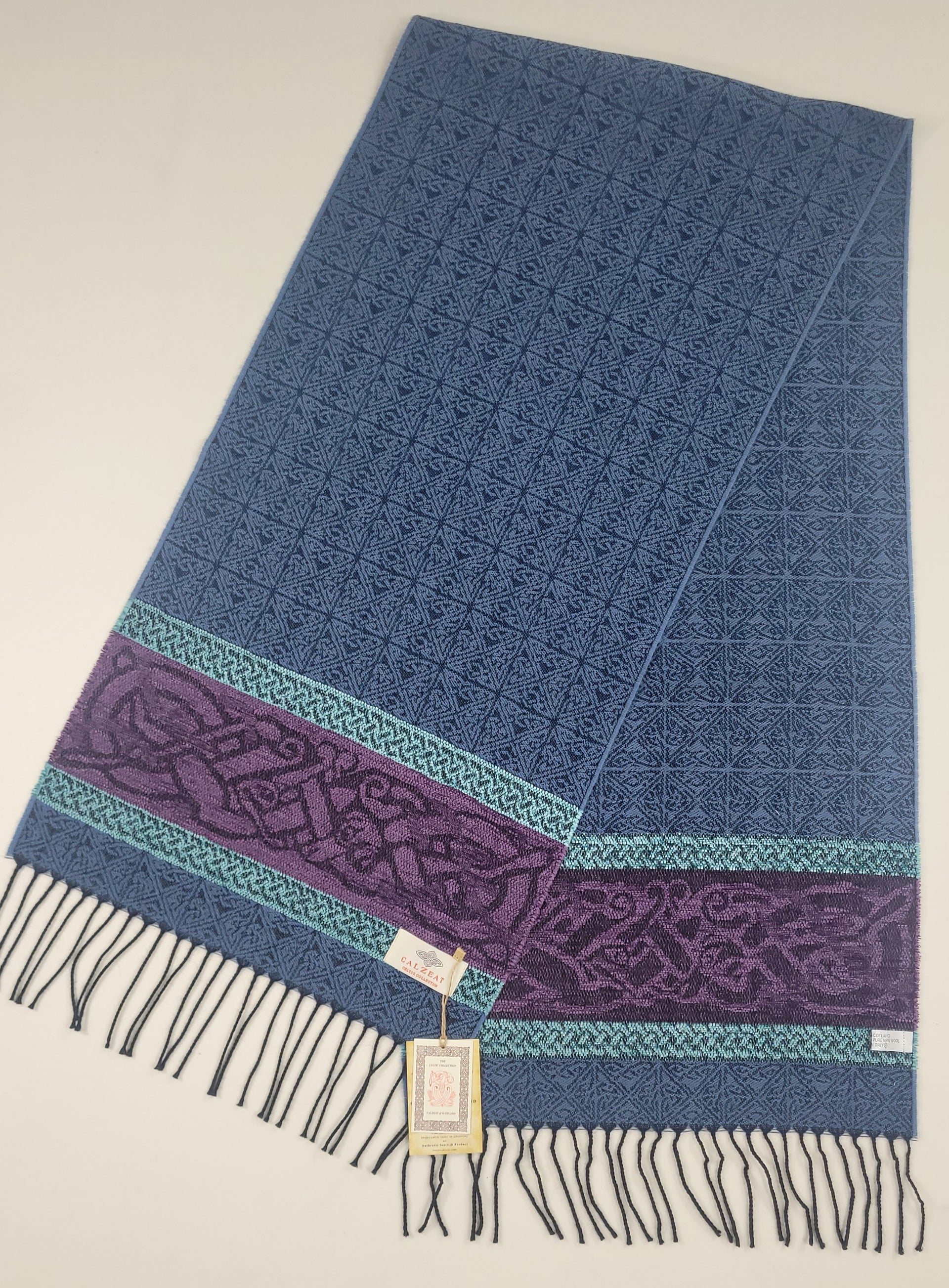 The Celtic Dog design is a square knot woven jacquard motif, ending with a chenille border depicting the Celtic Dog. In Celtic mythology the dog was very highly regarded. It symbolized loyalty and the strong bond of companionship felt between human and animal. The dog was also considered to be good luck in the celtic village and the symbol of the dog is commonly found in the decor clothing and jewellery. The Lagoon colourway is an ocean blue ground with a purple and duck egg blue chenille border that makes this a very desirable scarf. An authentic Scottish product exclusively designed and woven by Calzeat of Scotland. |