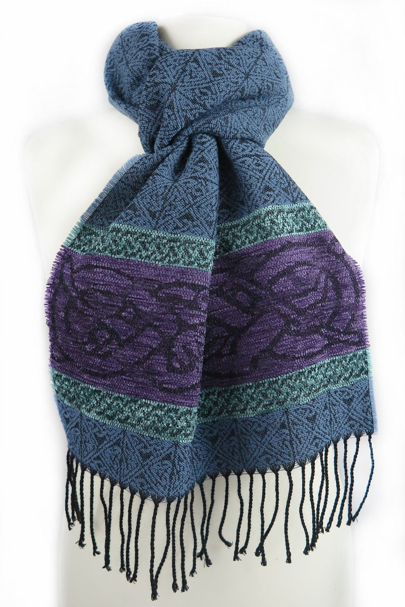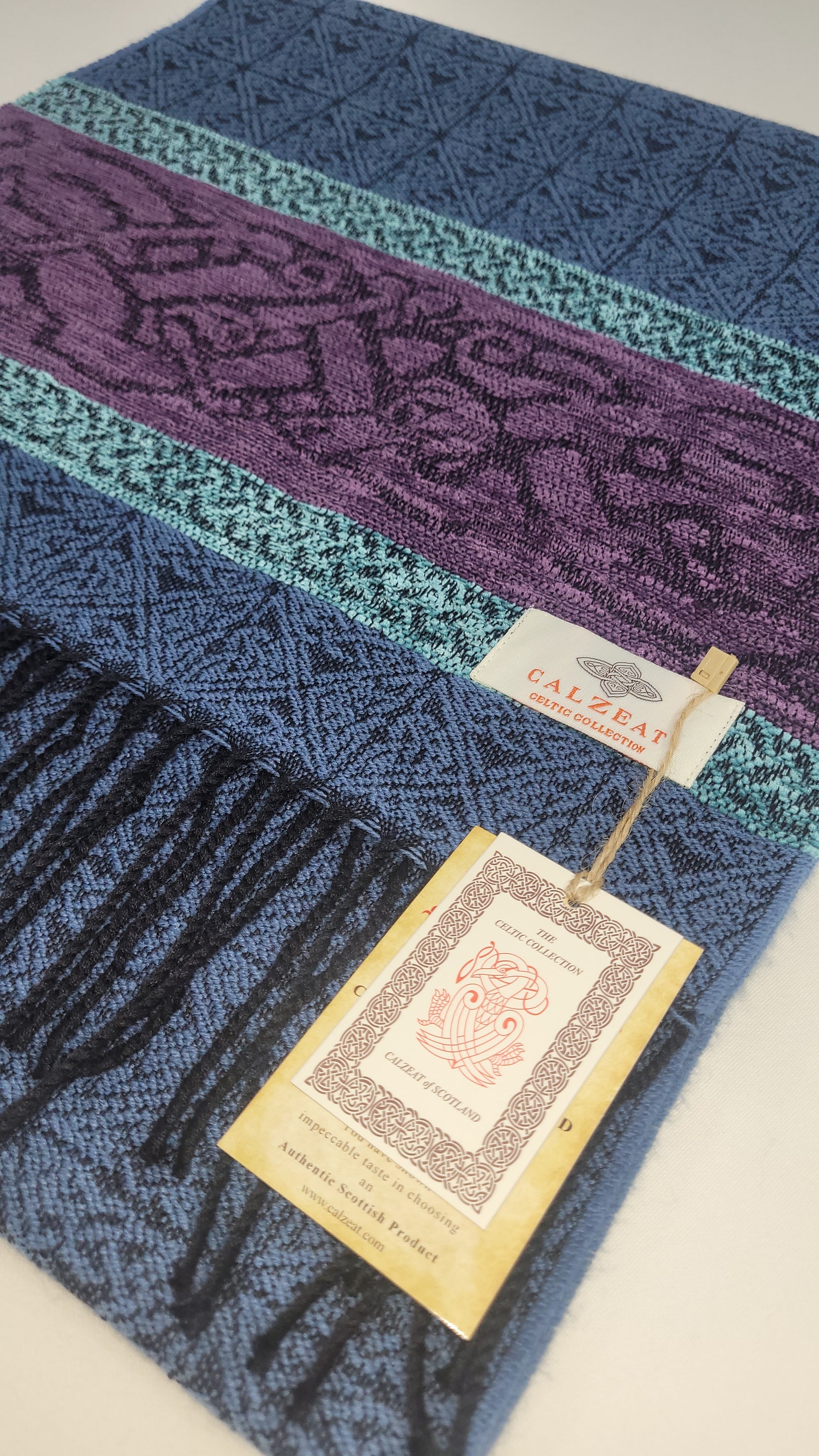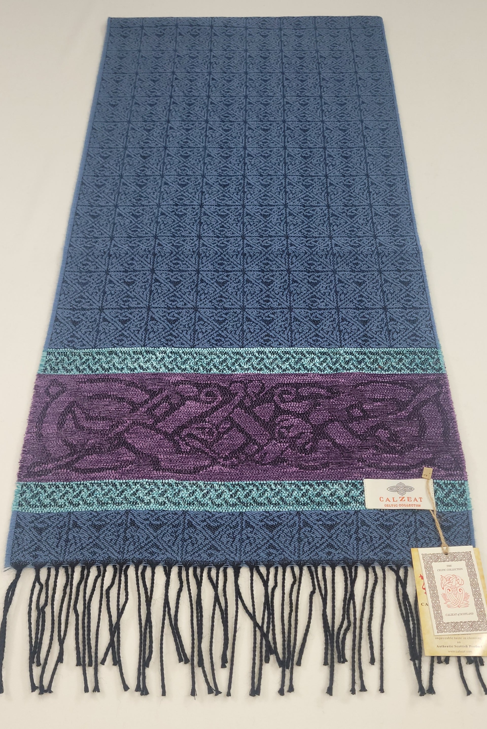 The Celtic Dog design is a square knot woven jacquard motif, ending with a chenille border depicting the Celtic Dog. In Celtic mythology the dog was very highly regarded. It symbolized loyalty and the strong bond of companionship felt between human and animal. The dog was also considered to be good luck in the celtic village and the symbol of the dog is commonly found in the decor clothing and jewellery. The Lagoon colourway is an ocean blue ground with a purple and duck egg blue chenille border that makes this a very desirable scarf. An authentic Scottish product exclusively designed and woven by Calzeat of Scotland. |