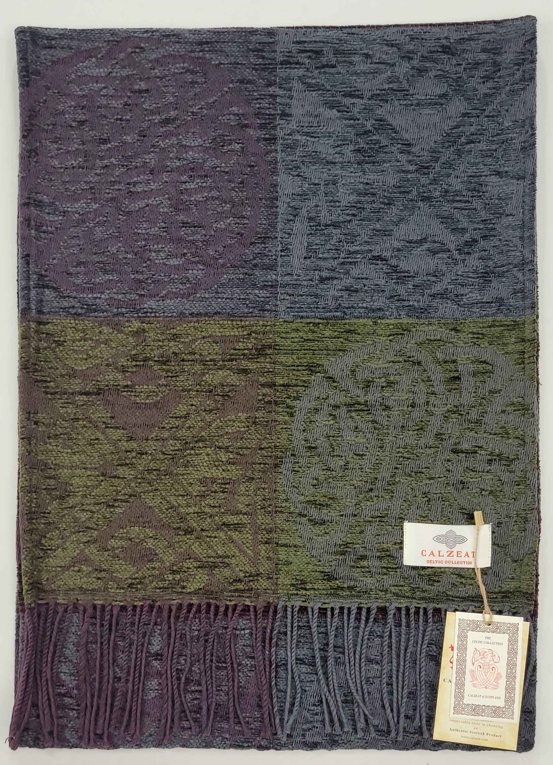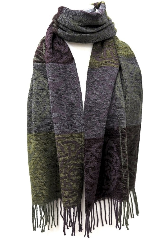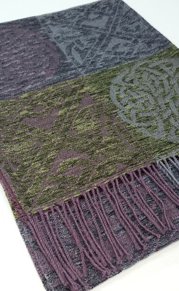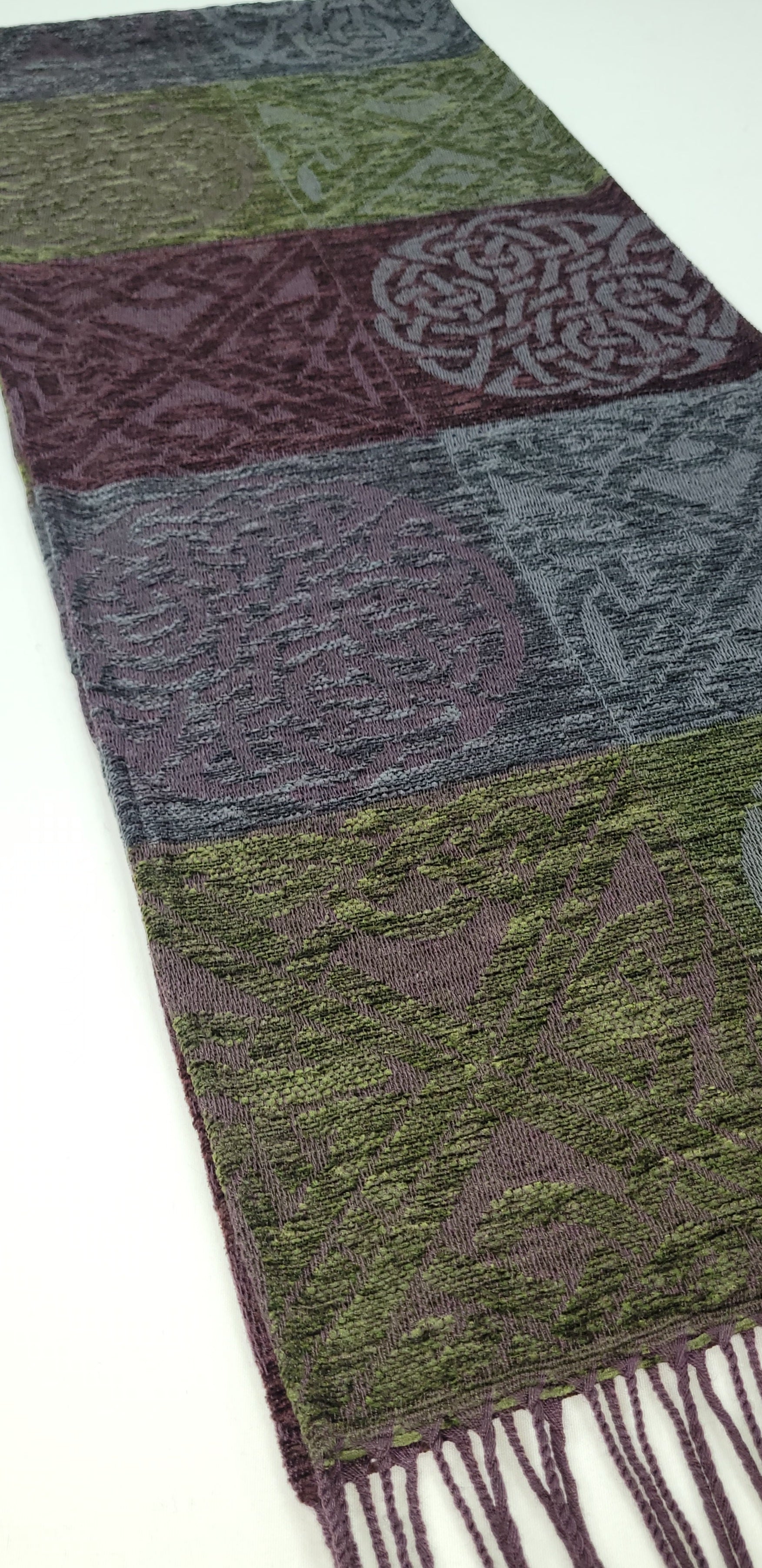 The Celtic Knot Nightshade is a colour combination of Khaki, Plum and Grey. Our scarves are made from our beautiful throws so colour block placement may vary.