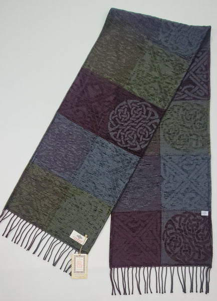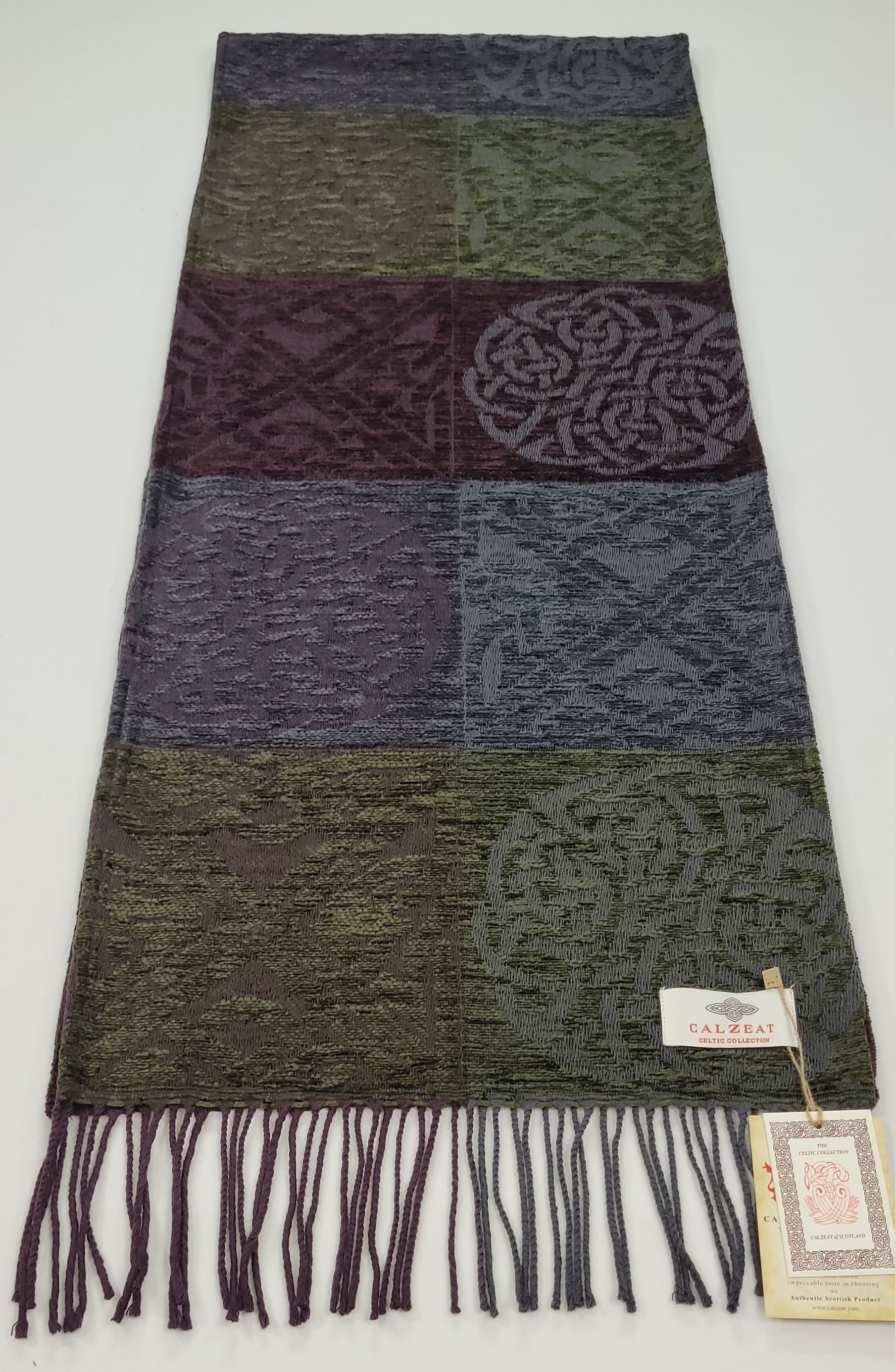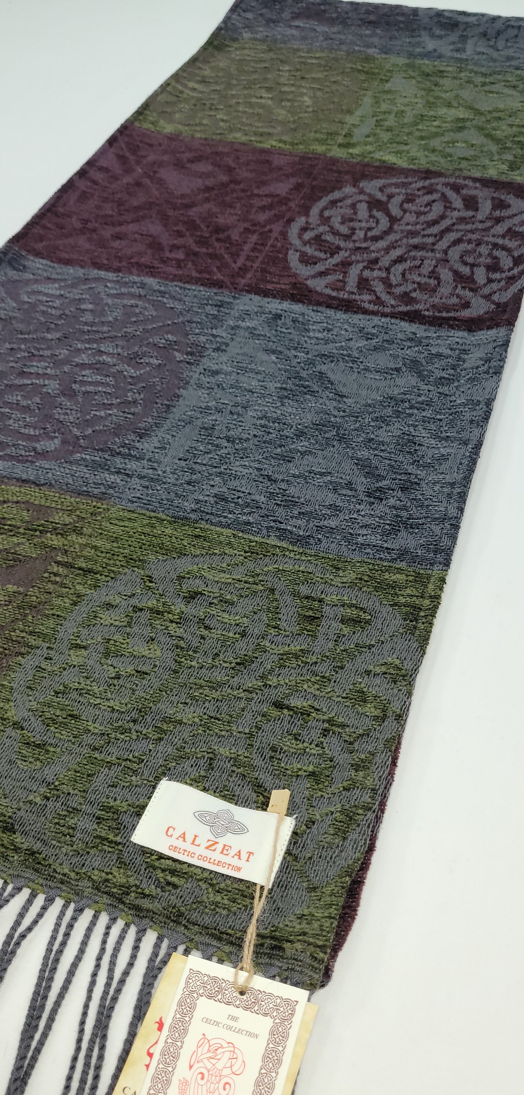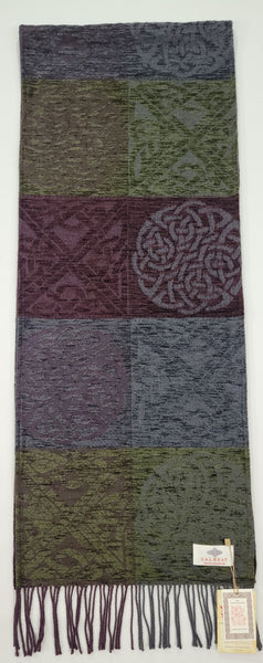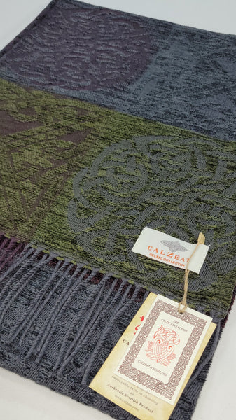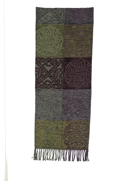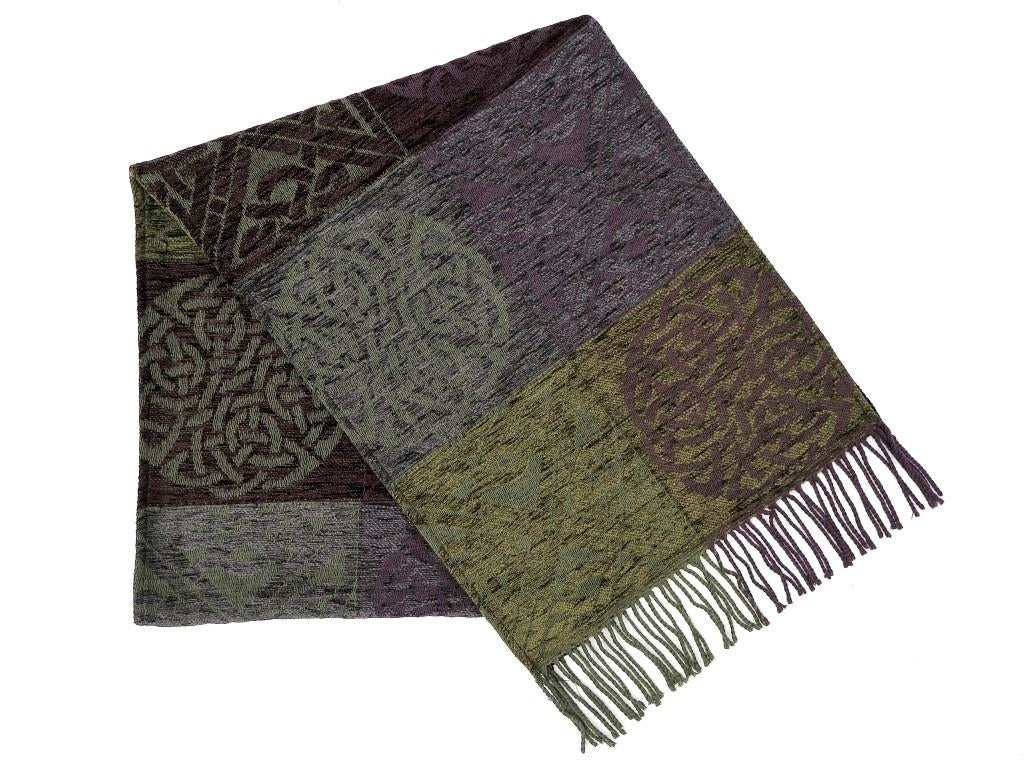 The Celtic Knot Nightshade is a colour combination of Khaki, Plum and Grey. Our scarves are made from our beautiful throws so colour block placement may vary.