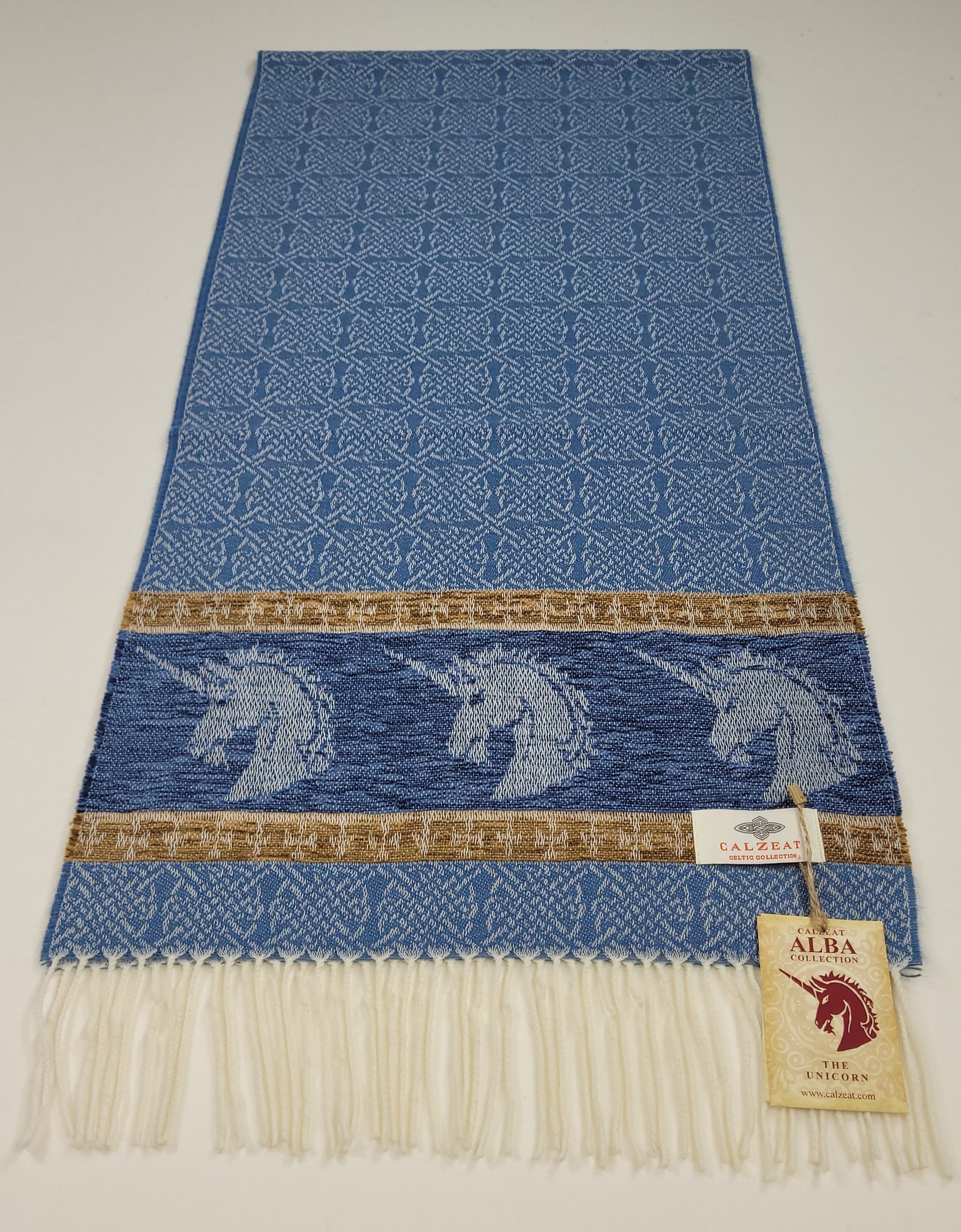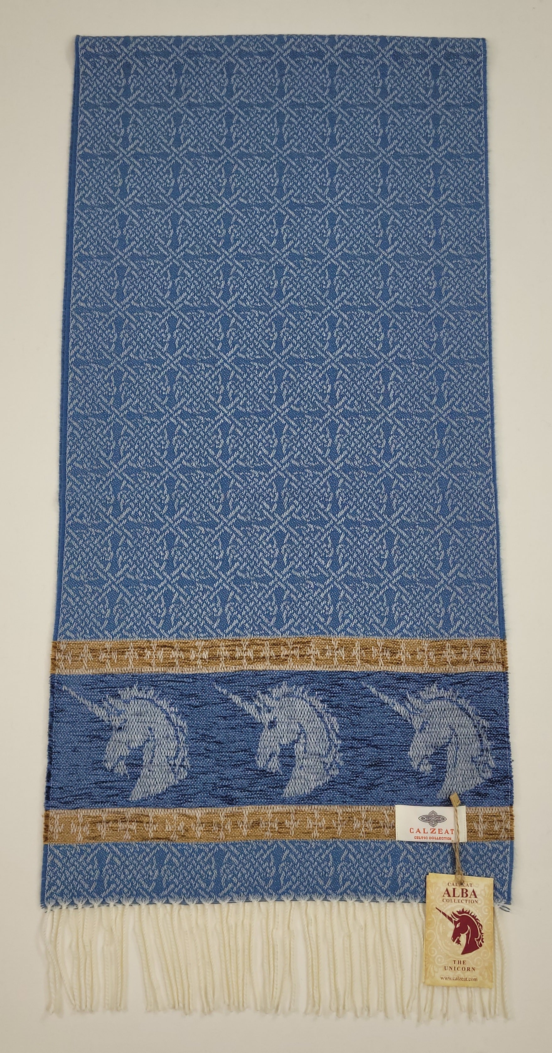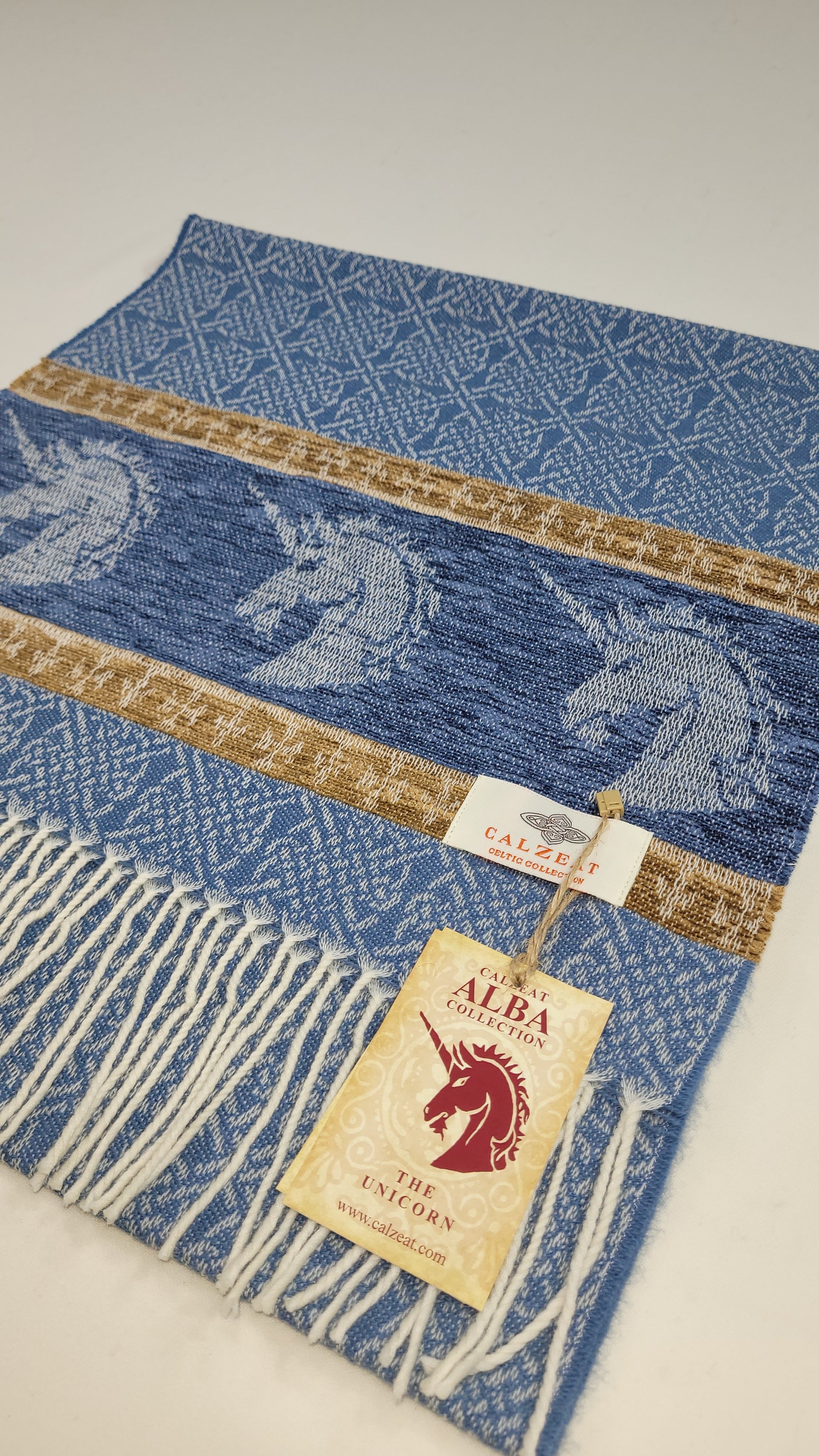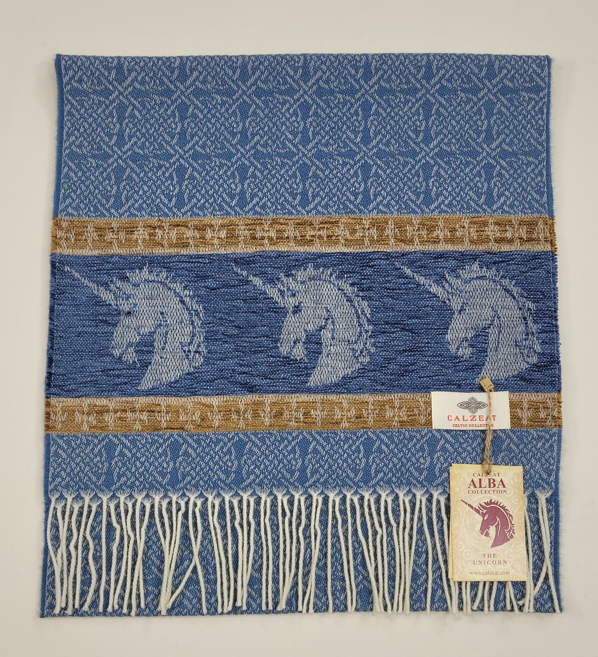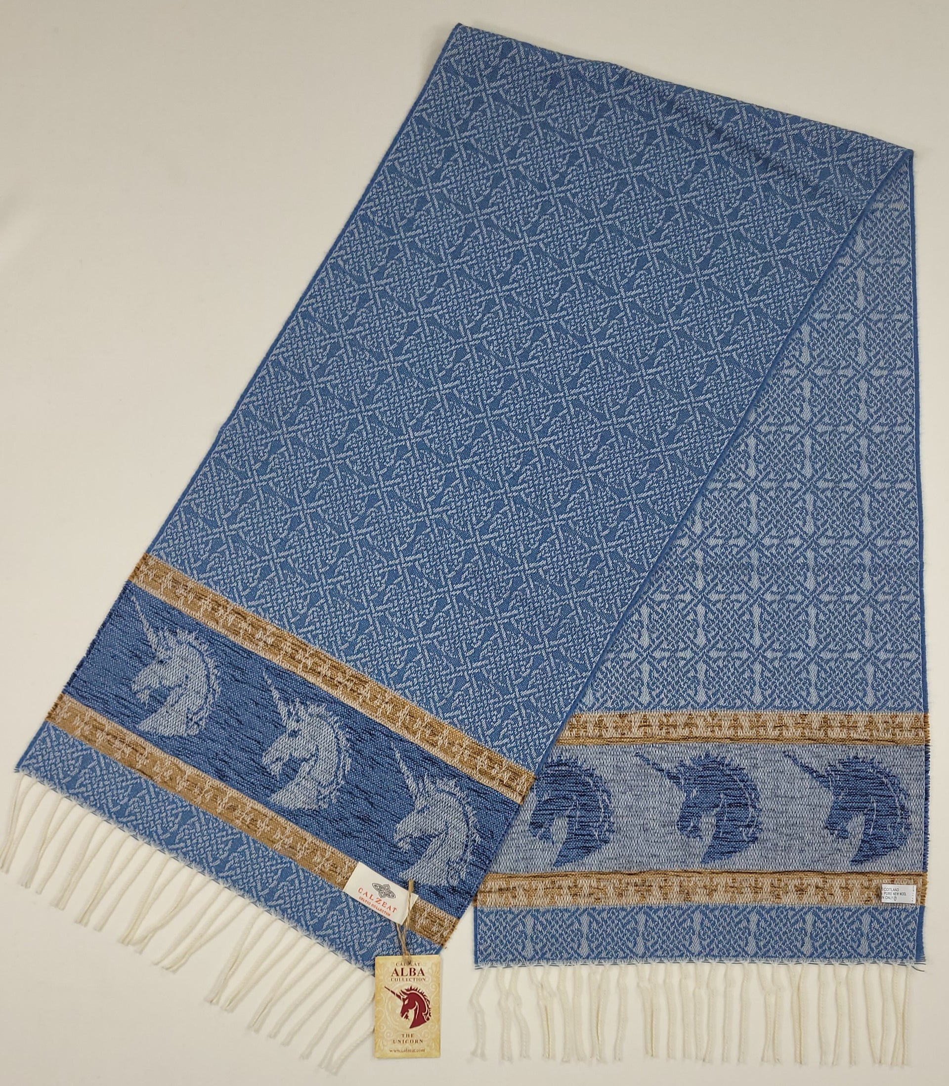 Celtic Alba Unicorn Jacquard Scarf In Celtic mythology the unicorn was a symbol of purity and innocence, as well as masculinity and power. A unicorns head can be found bordering our scarf in a luxurious rich blue chenille. Tales of dominance and chivalry surround the unicorn and we belive for these reasons it was chosen as Scotland’s national animal. An authentic Scottish product exclusively designed and woven by Calzeat of Scotland. |