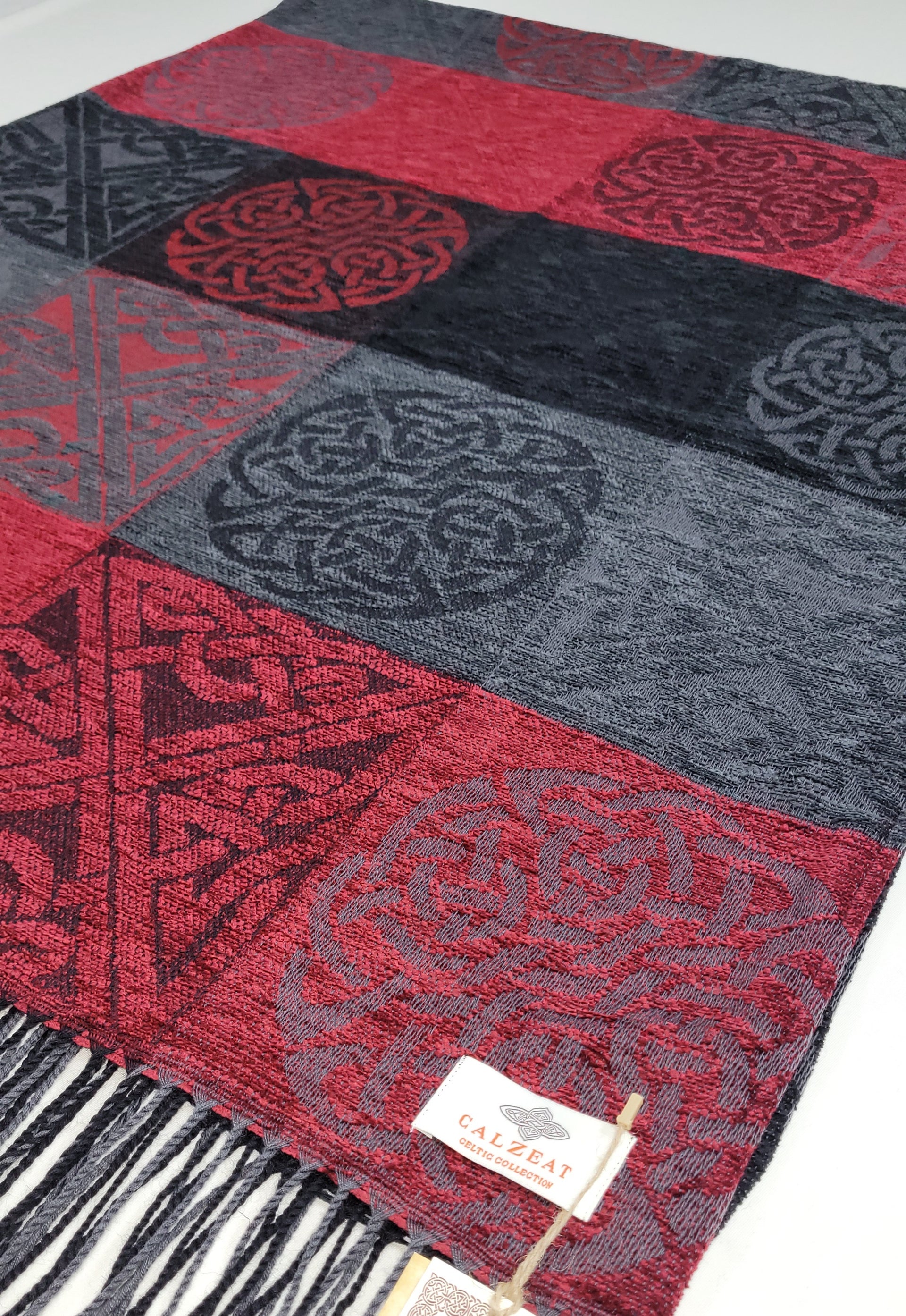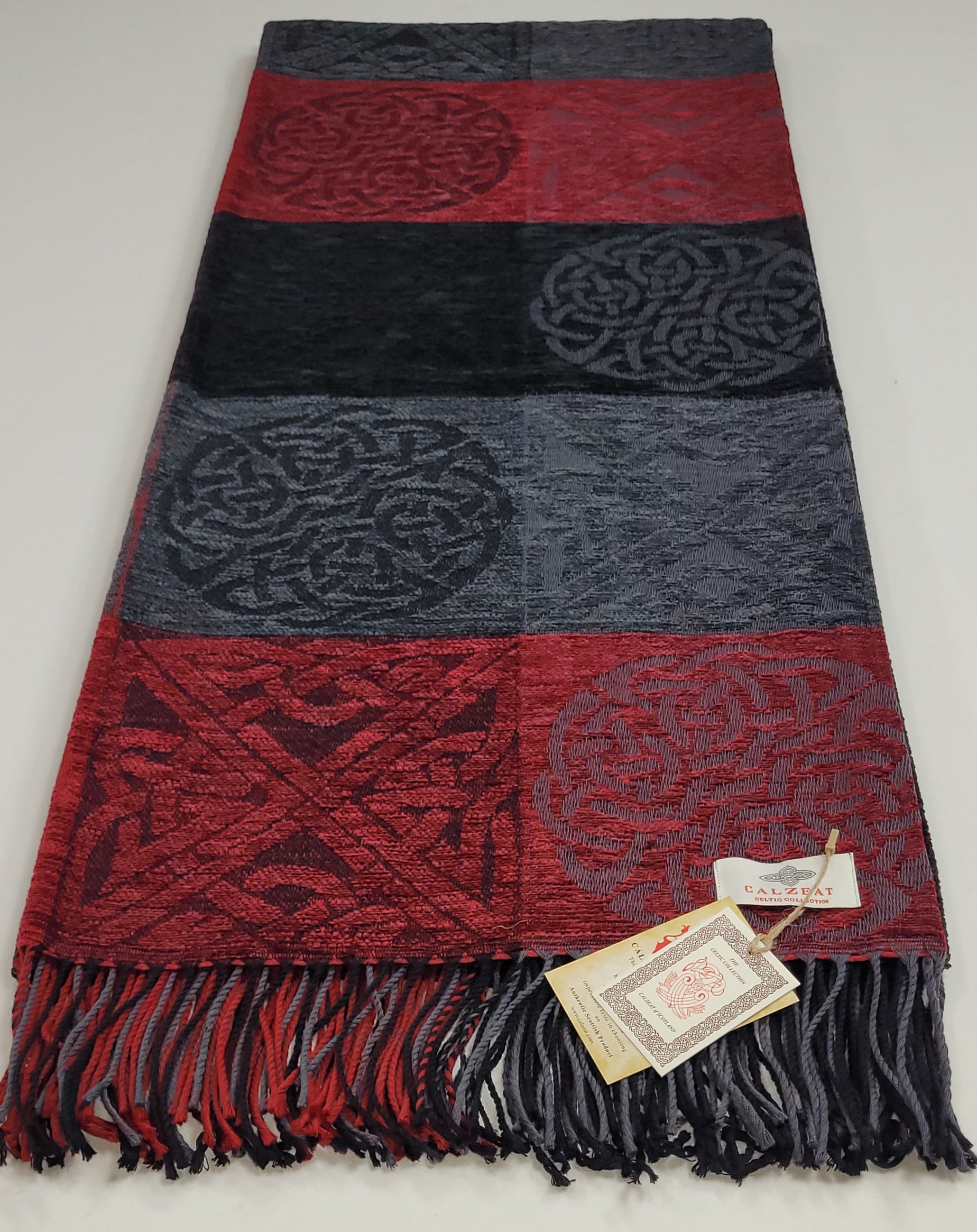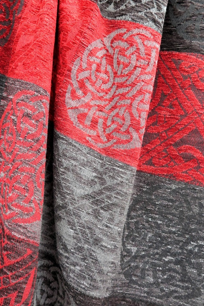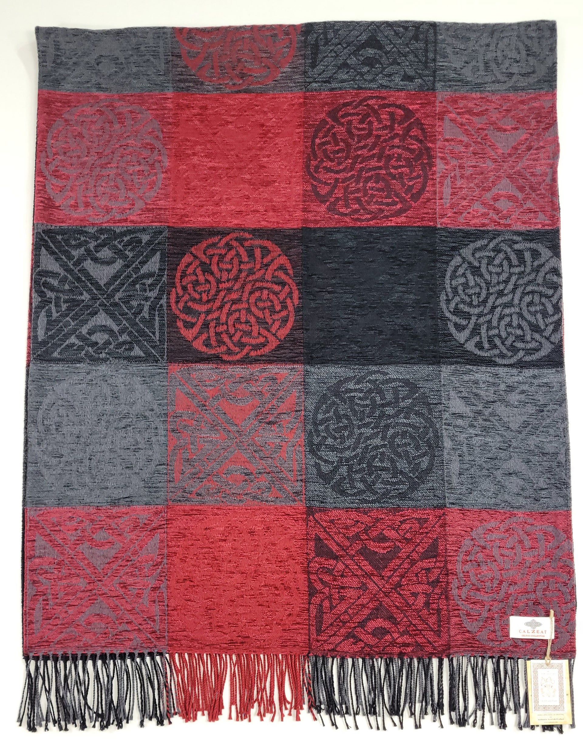 Celtic Knot Jacquard woven throw in a luxurious soft blend of Chenille and Pure New Wool. The Celtic Knot Flodden is a colour combination of Nimbus, Black and Battlefield Red. Dimensions: 150 x 200 cms Including Fringes Composition: 67% Chenille/33% Pure New Wool An authentic Scottish product exclusively designed and woven by Calzeat of Scotland. |