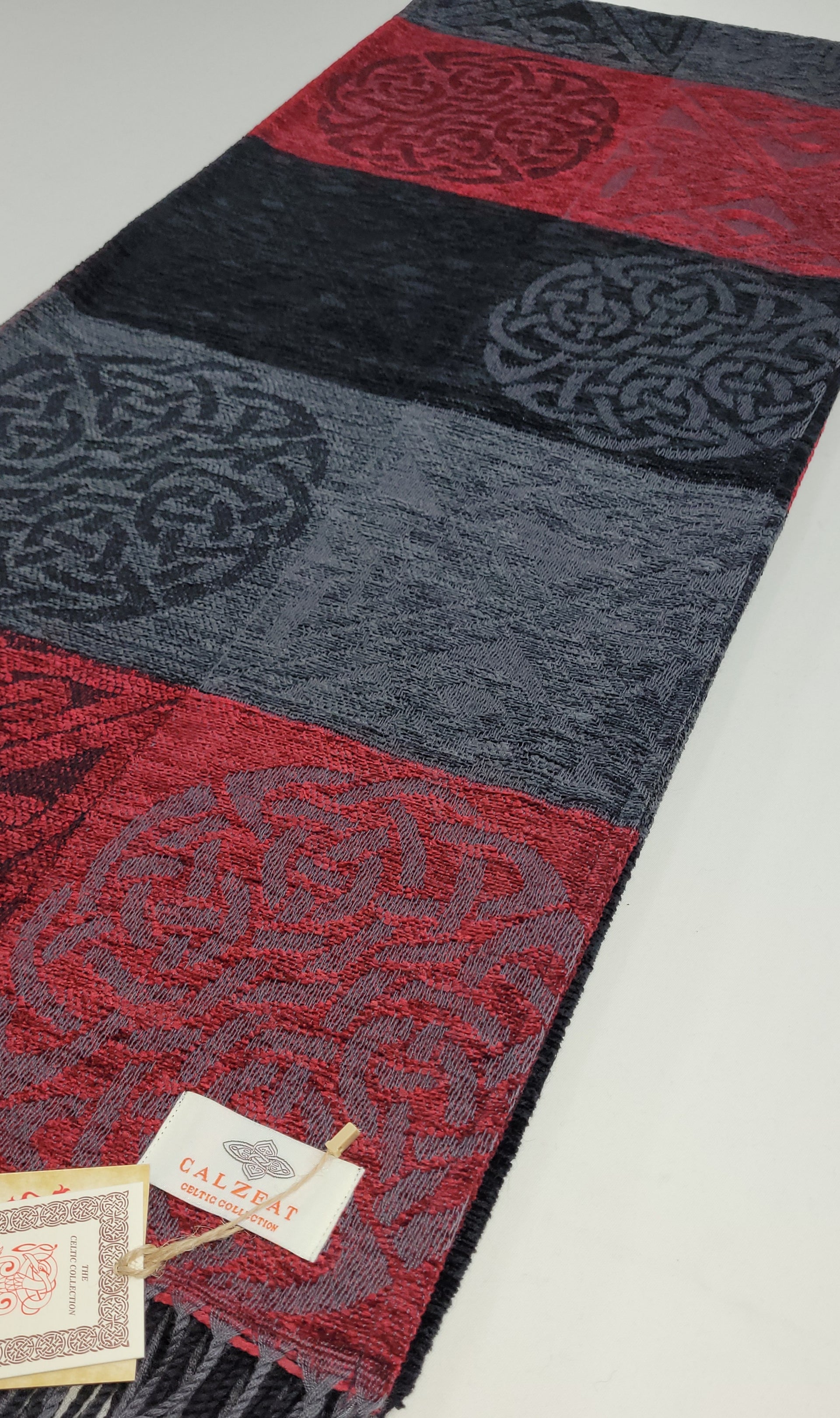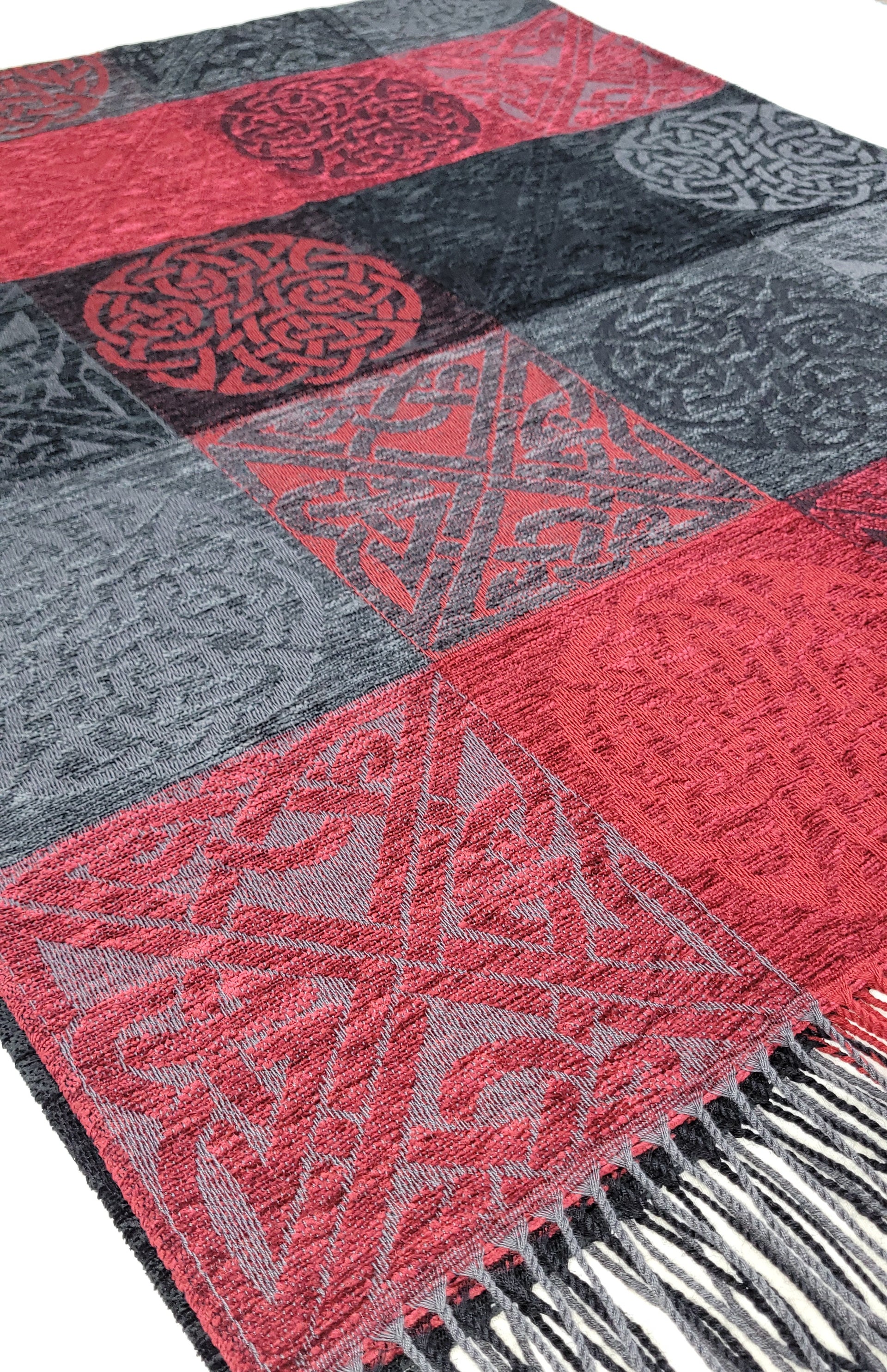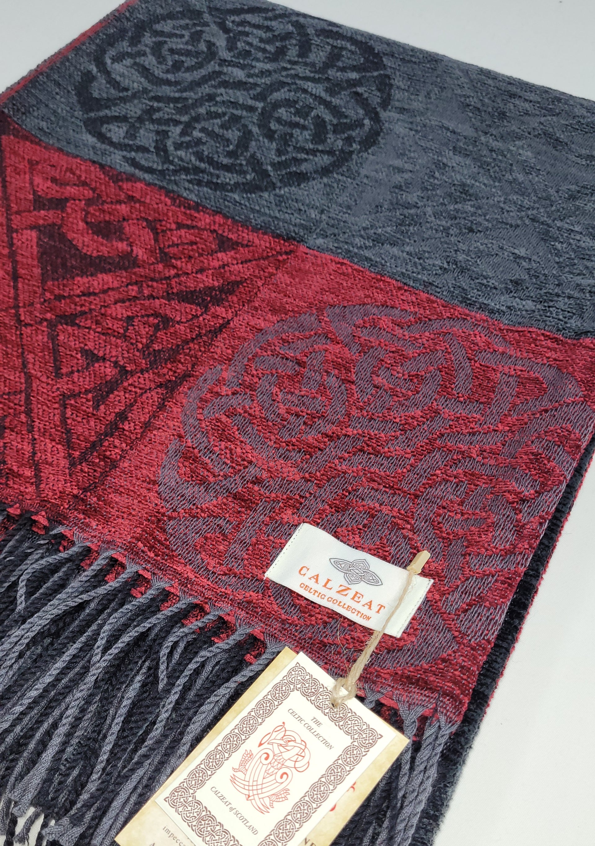 Celtic Knot Jacquard woven throw in a luxurious soft blend of Chenille and Pure New Wool. The Celtic Knot Flodden is a colour combination of Nimbus, Black and Battlefield Red. Dimensions: 150 x 200 cms Including Fringes Composition: 67% Chenille/33% Pure New Wool An authentic Scottish product exclusively designed and woven by Calzeat of Scotland. |
