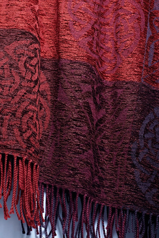 Celtic Knot Garnet Ruana in a luxurious soft blend of Chenille and Pure New Wool. The Garnet colourway is a rich array of Mulberry, Aubergine and Damson. Dimensions: One Size Fits All (150 x 200 cms Including Fringes) Composition: 67% Chenille/33% Pure New Wool |