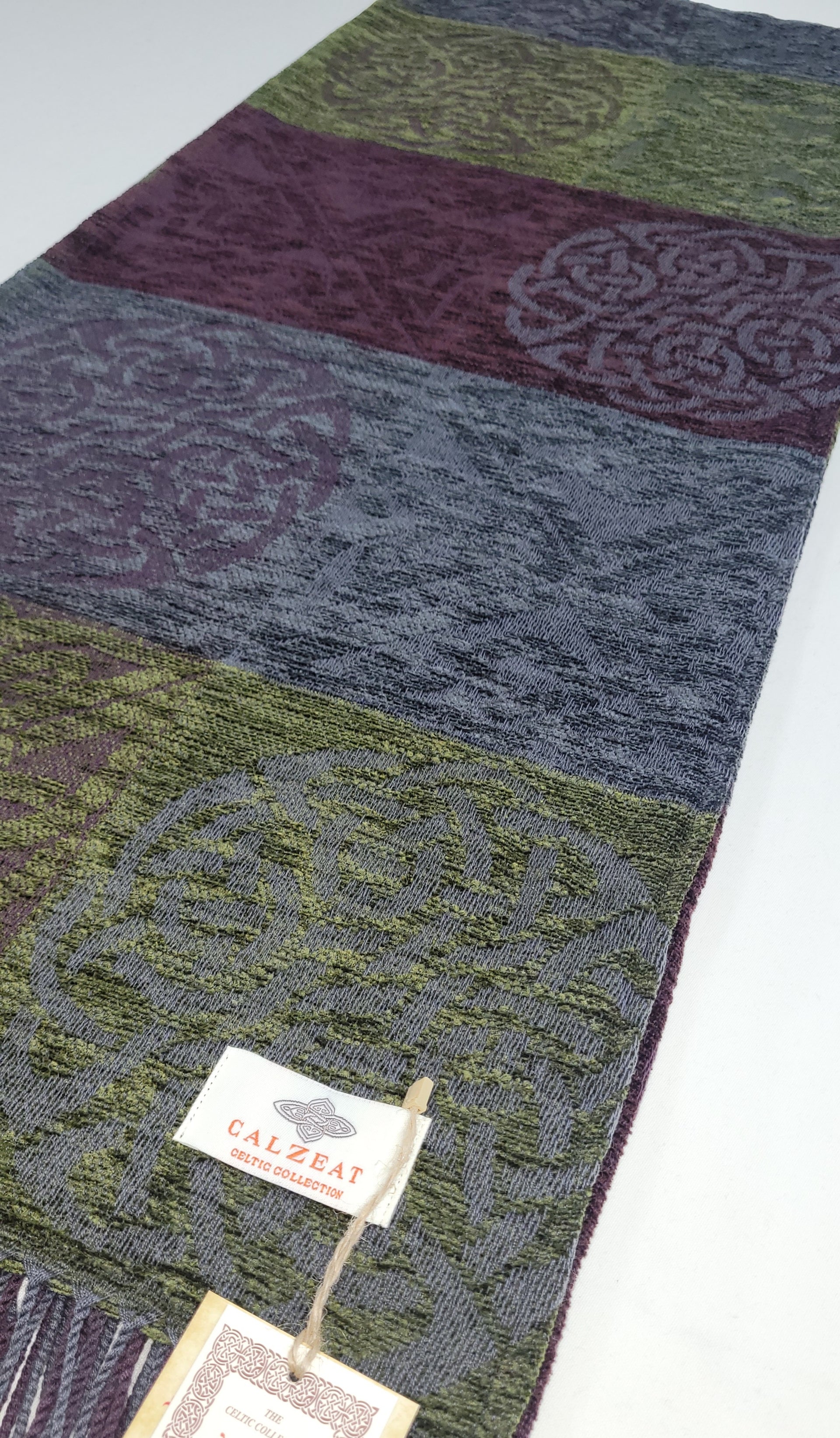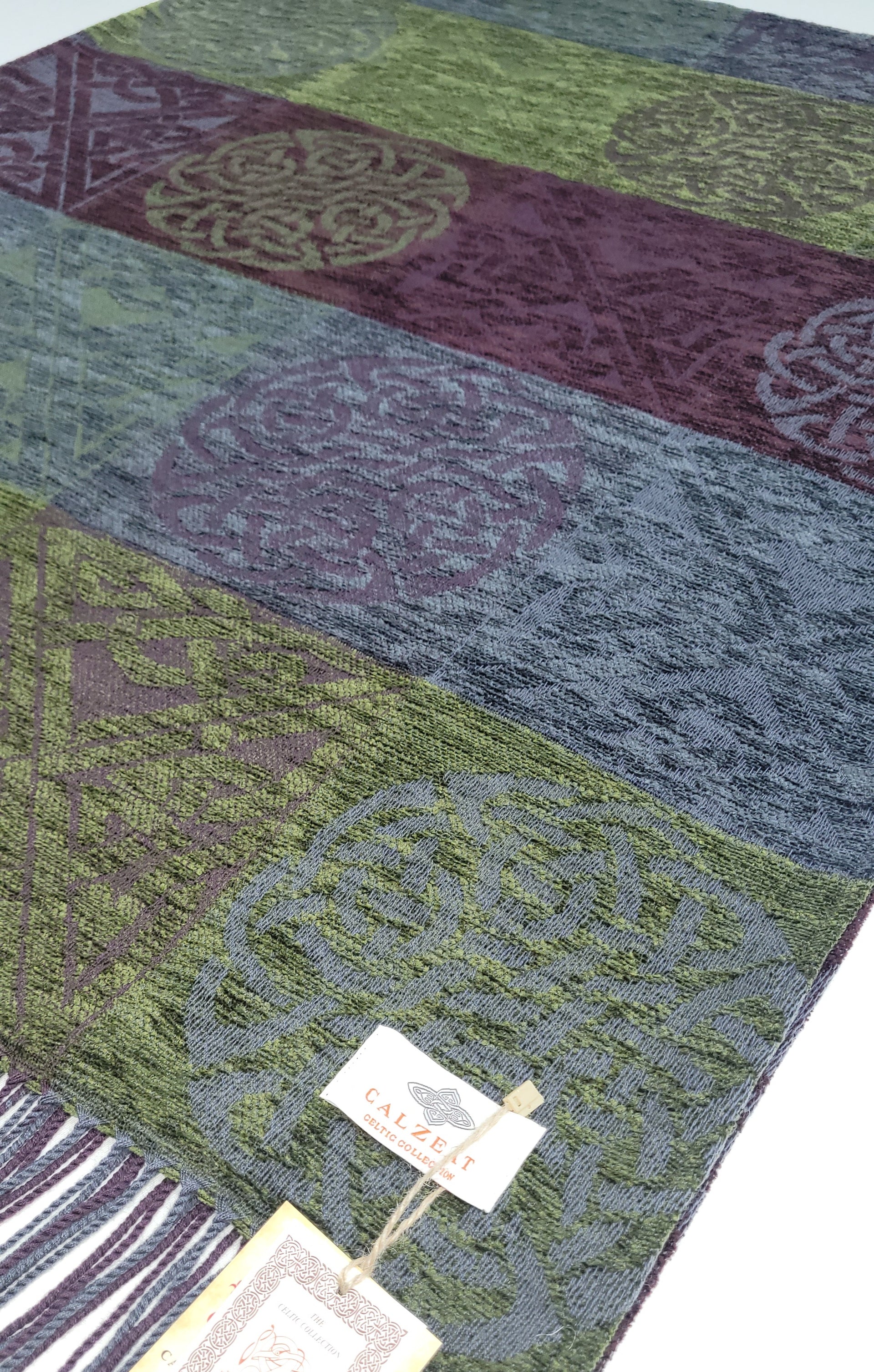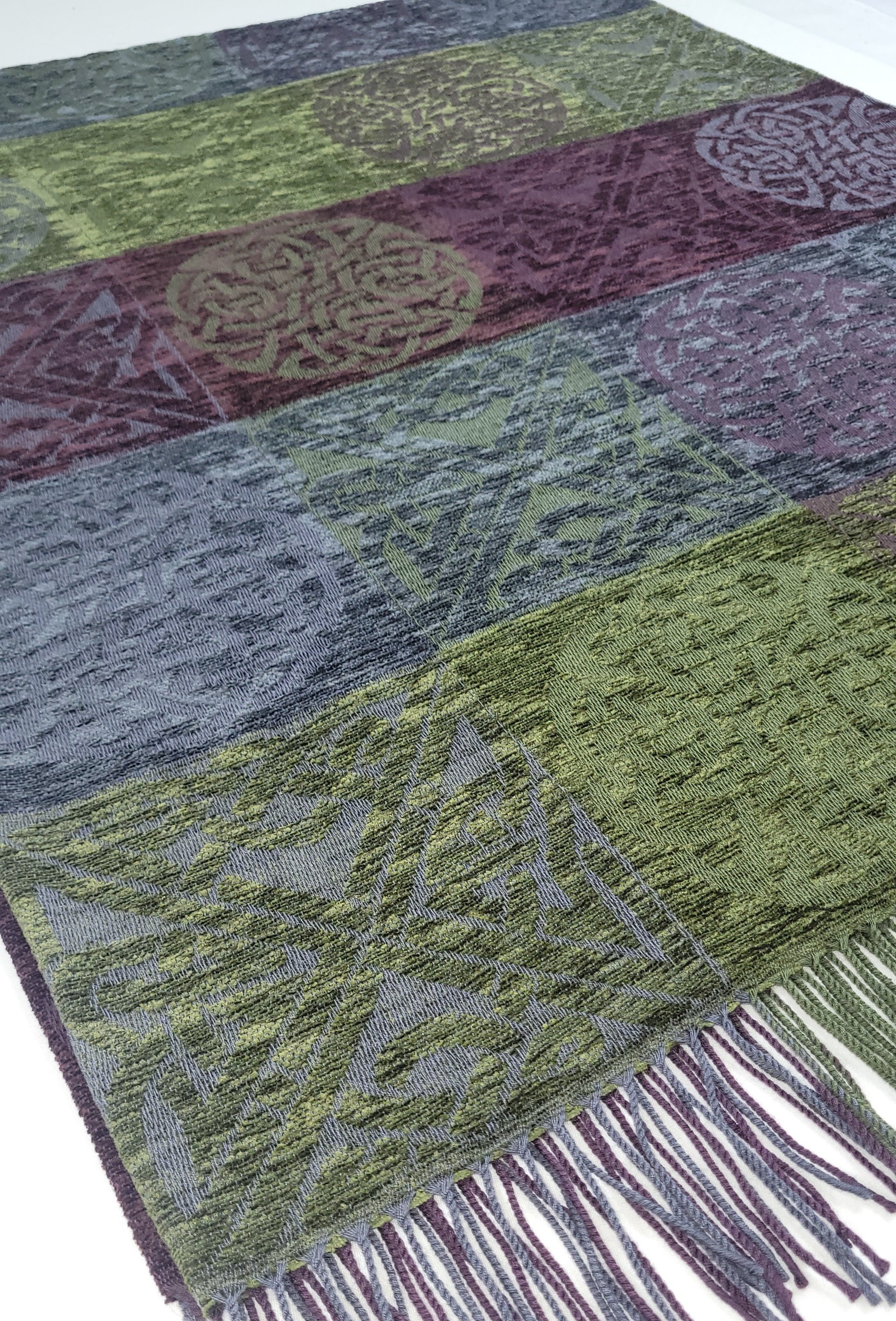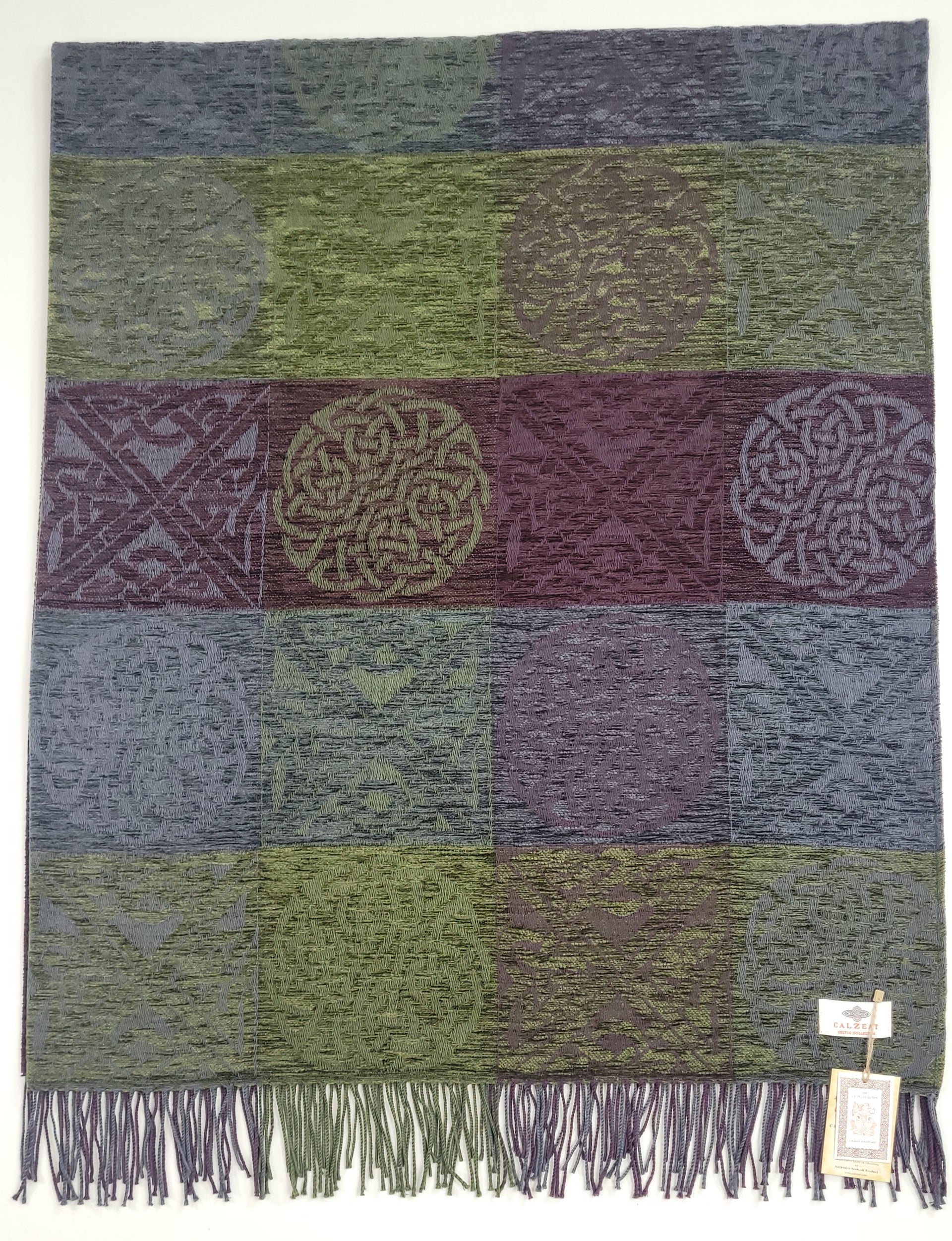 Celtic Knot Jacquard woven throw in a luxurious soft blend of Chenille and Pure New Wool. The Celtic Knot Nightshade is a colour combination of Khaki, Plum and Grey. Dimensions: 150 x 200 cms Including Fringes Composition: 67% Chenille/33% Pure New Wool |