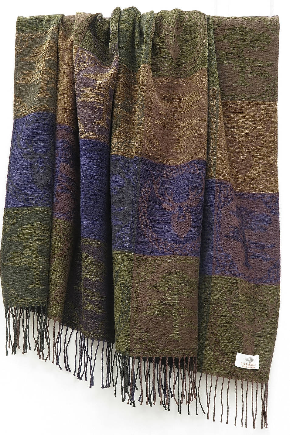 The Celtic Stag & Pine Caledonia Jacquard woven throw is a luxurious soft blend of Chenille and Pure New Wool in a beautiful combination of Olive Green, Imperial Purple and Taupe. Dimensions: 150 x 200 cms Including Fringes Composition: 67% Chenille/33% Pure New Wool An authentic Scottish product exclusively designed and woven by Calzeat of Scotland. |