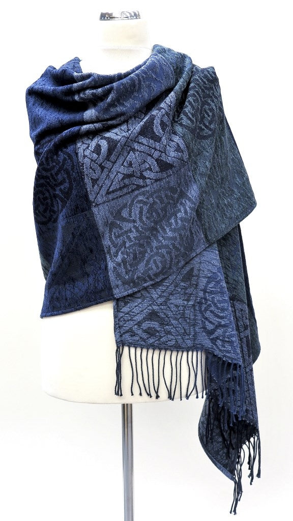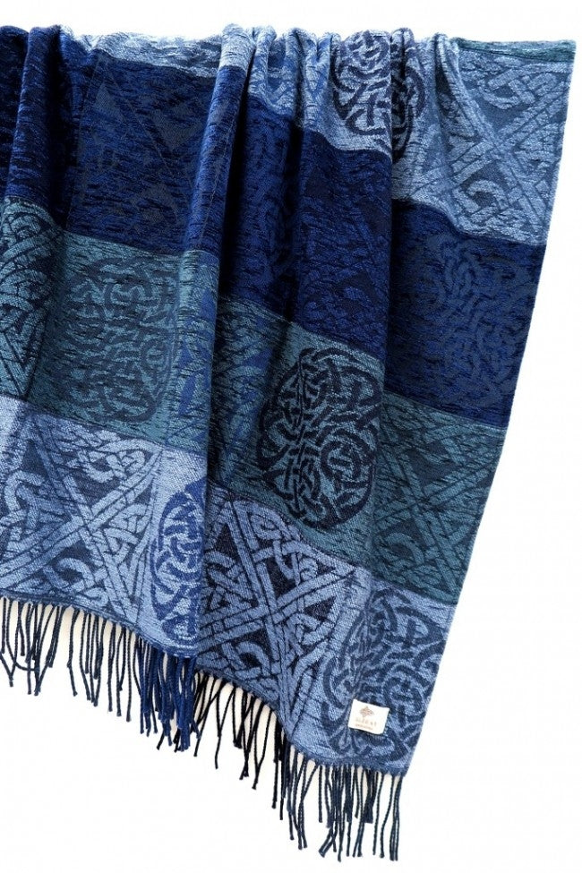You will see we have combined two different celtic knots in our Stirling design and used a sumptuous rich array of cloud blue, lagoon and royal blue. Our wraps are made from our beautiful throws so colour block placement may vary.