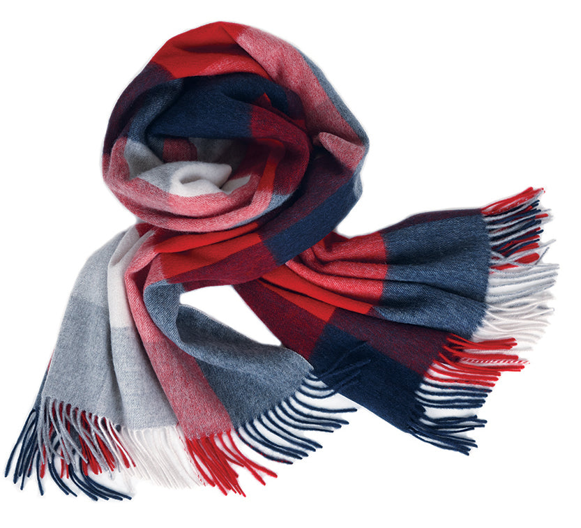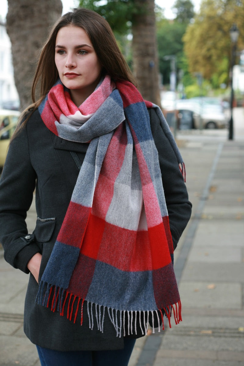 Description | Indulge yourself with the soft warm luxury of this pure 100% lambswool scarf. This beautiful over-sized scarf is made in the UK and is woven in a classic block check pattern of navy, red, white and grey. Wear draped over your shoulders as a shawl or tied around your neck as a scarf it is sure to add warmth & style to any outfit. |