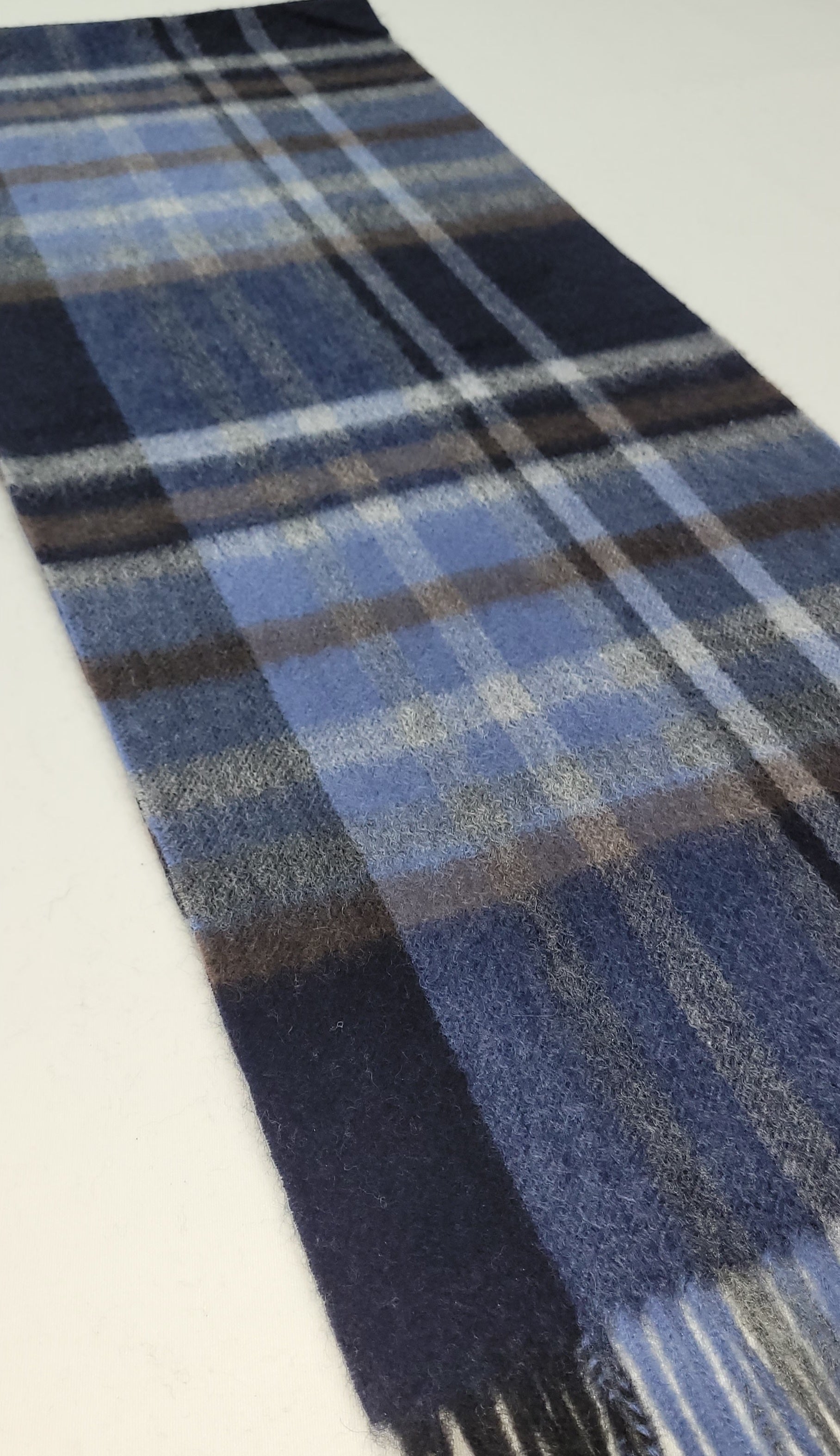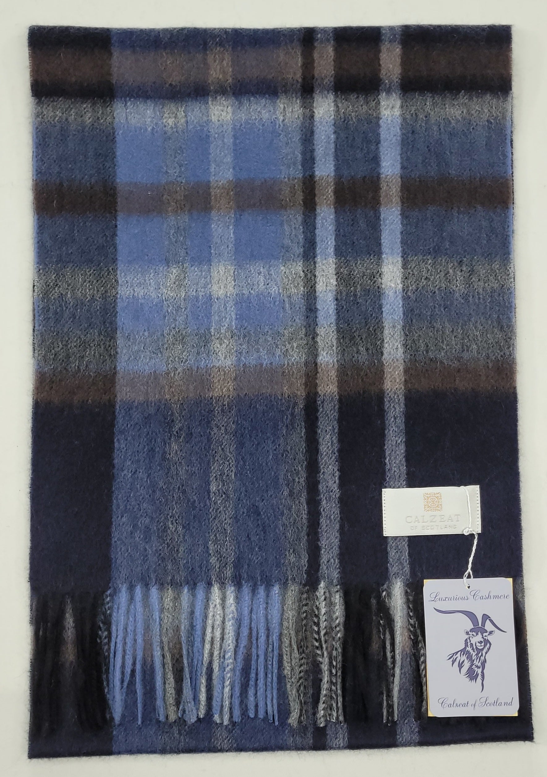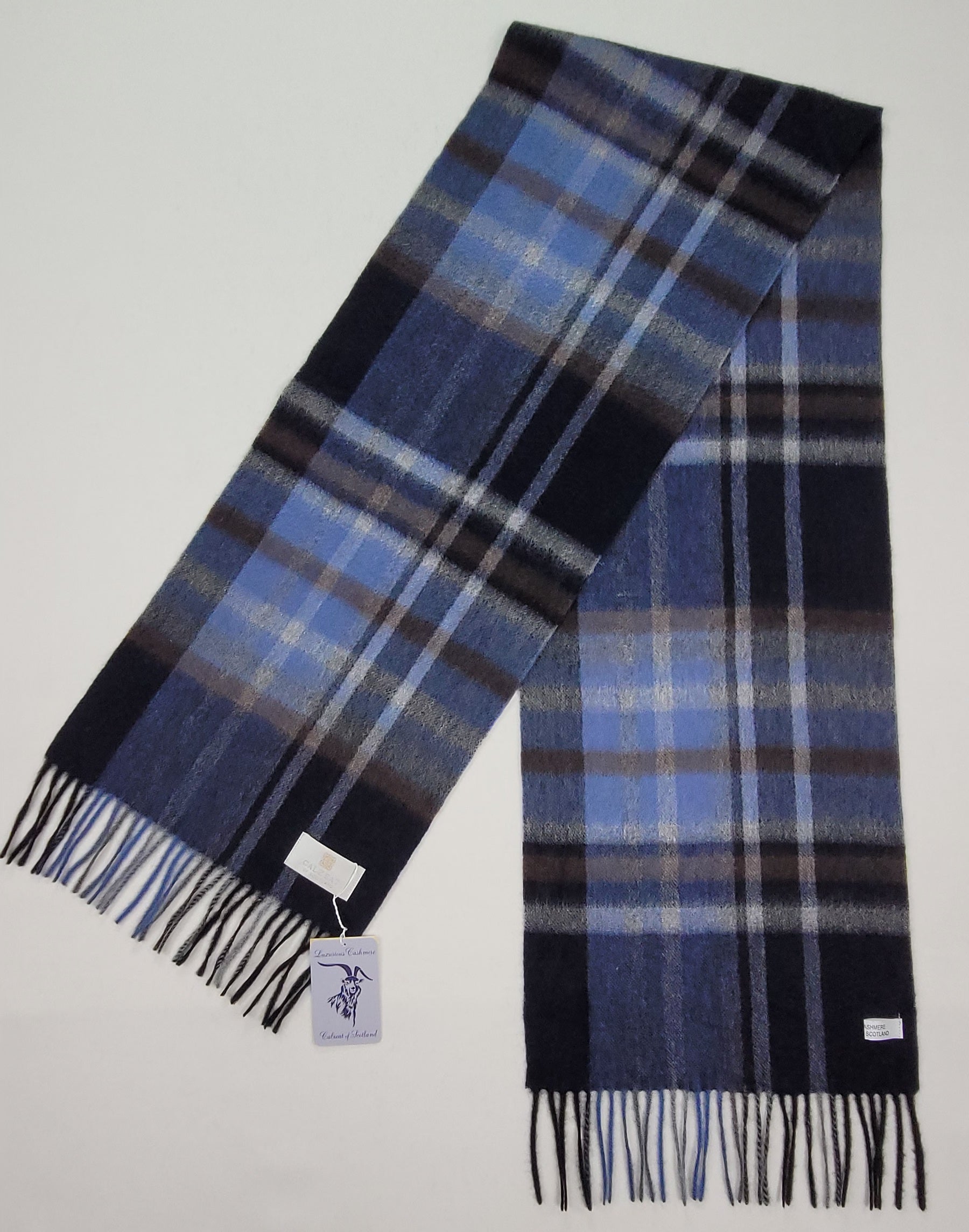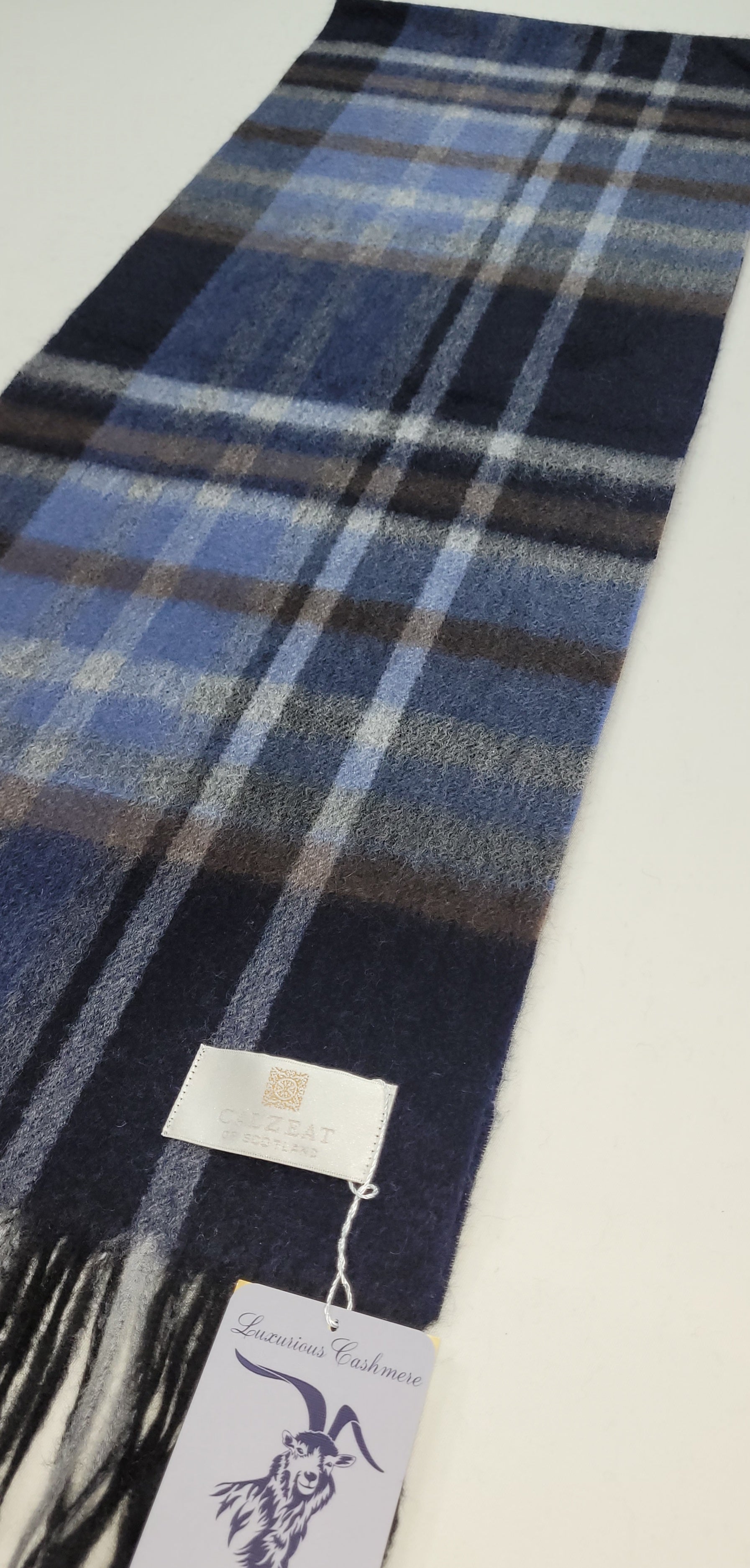 This pure cashmere scarf in shades of Navy, Blue, Grey & Brown, is a classic and timeless design perfect for both men and women alike.