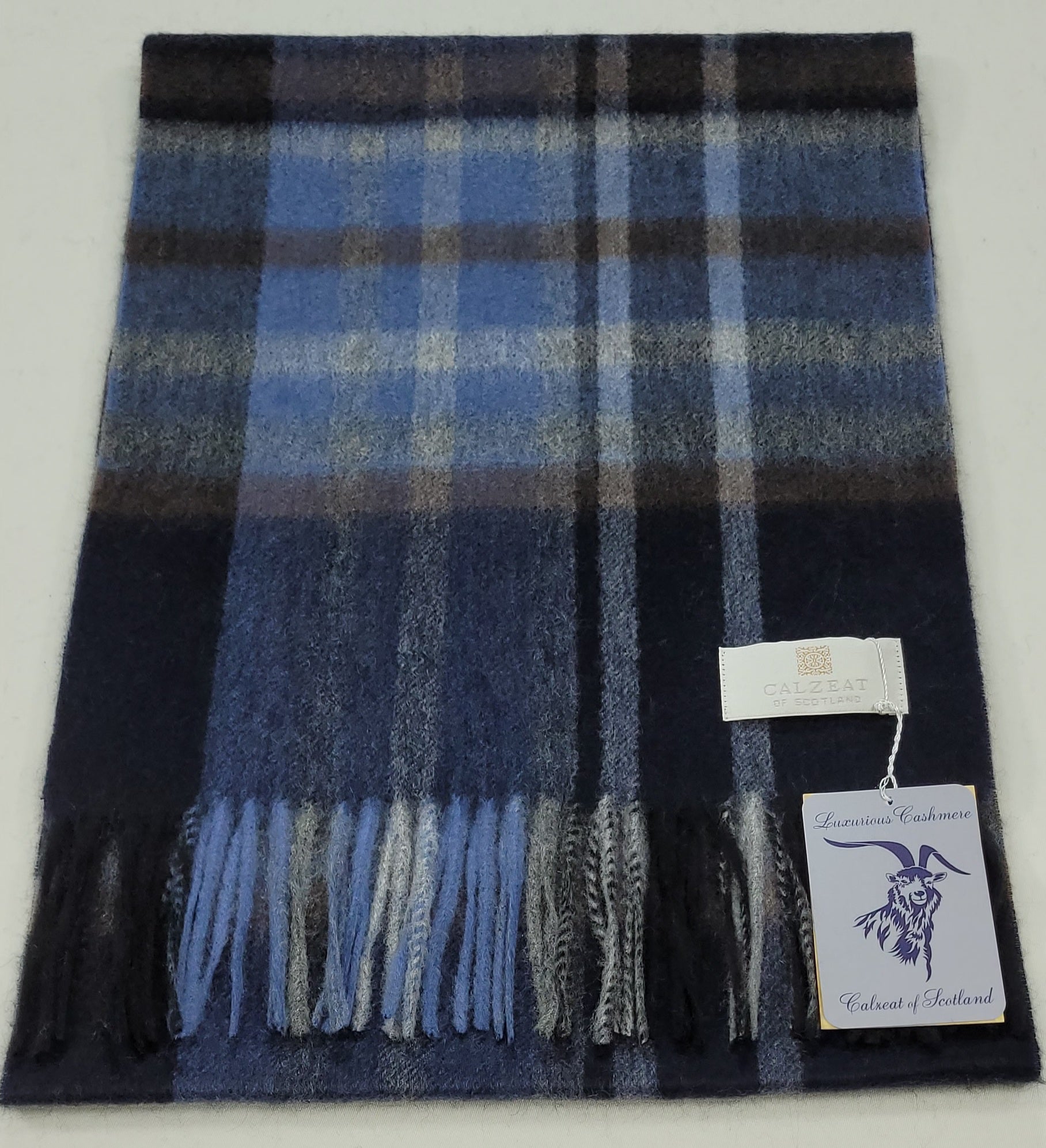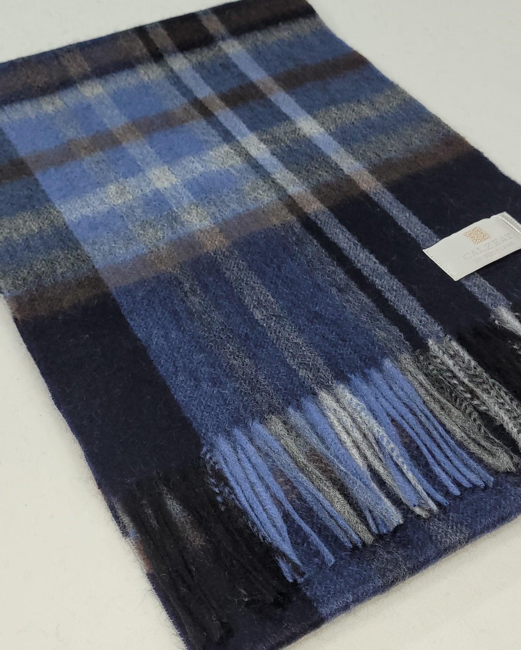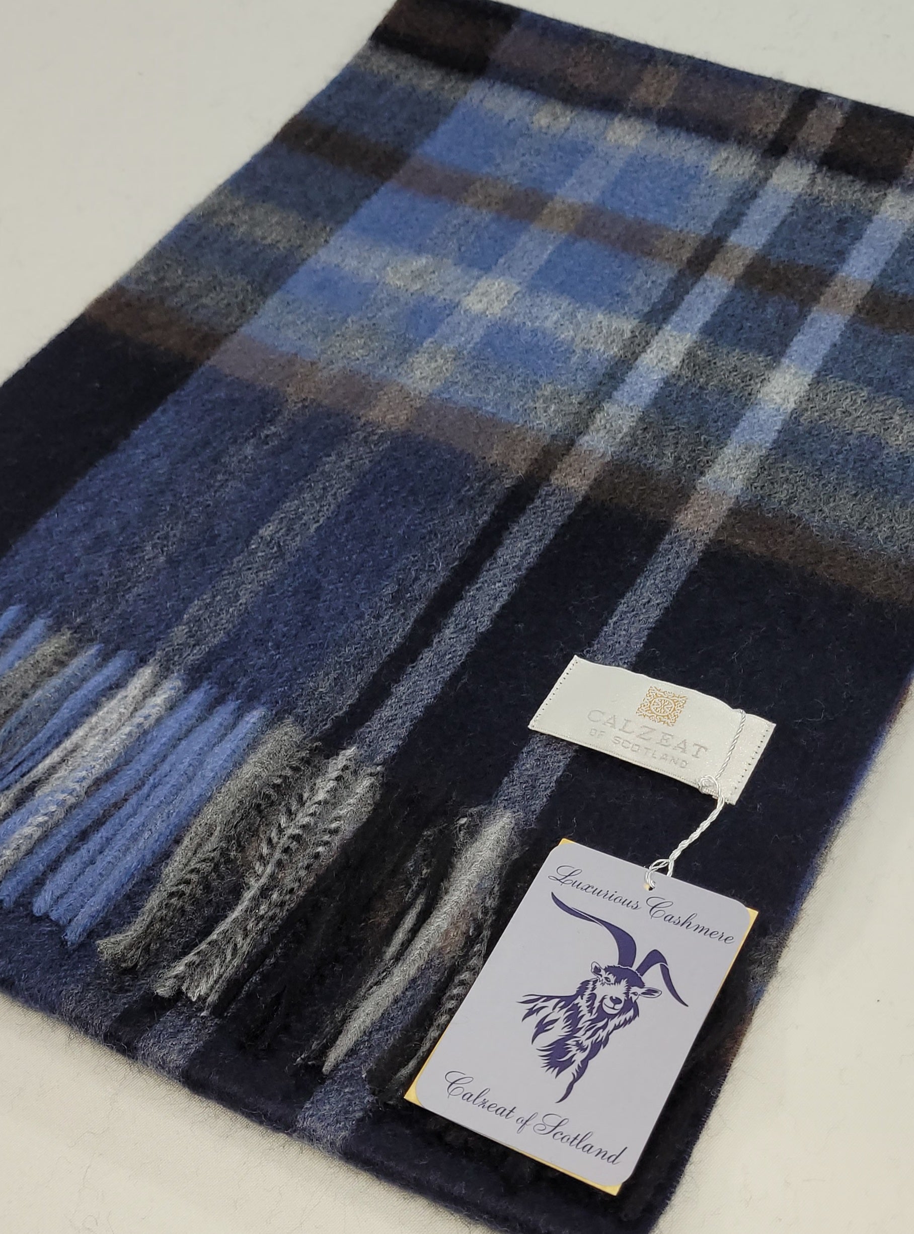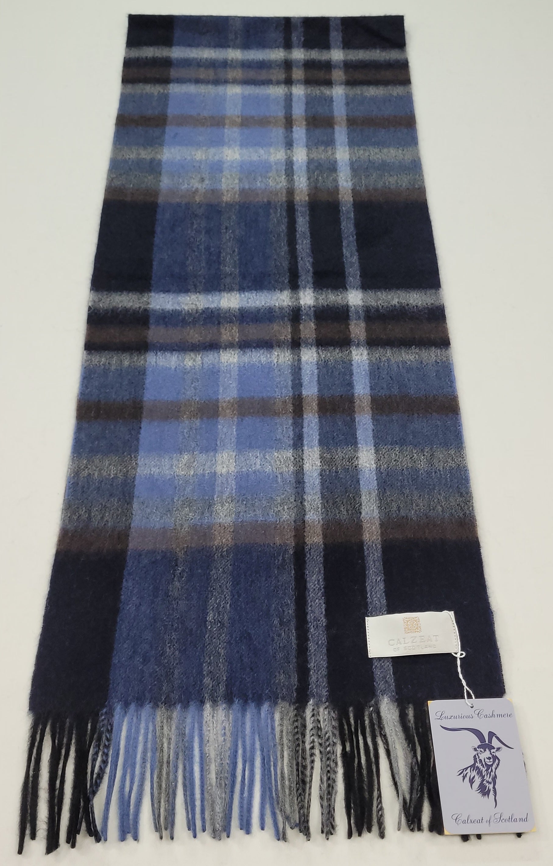 This pure cashmere scarf in shades of Navy, Blue, Grey & Brown, is a classic and timeless design perfect for both men and women alike.