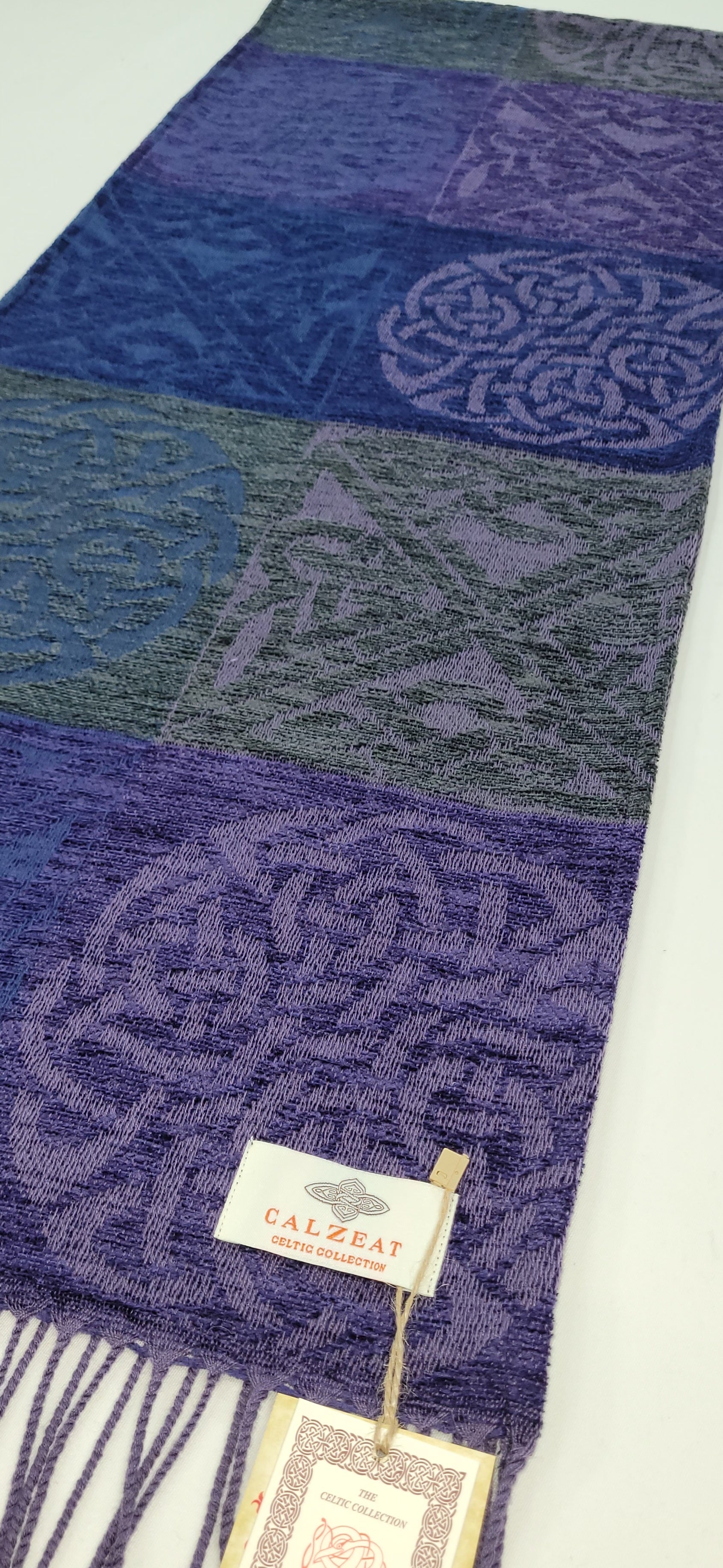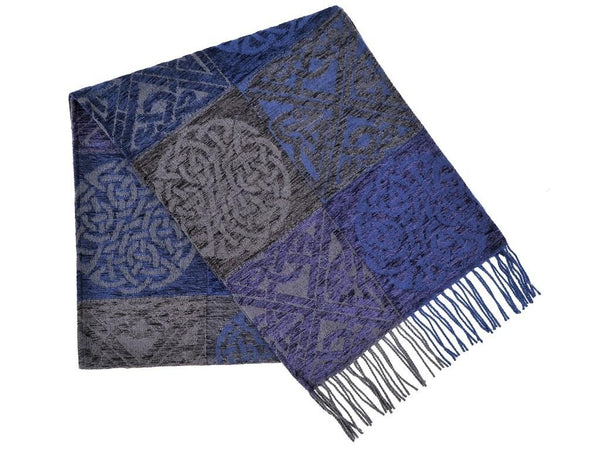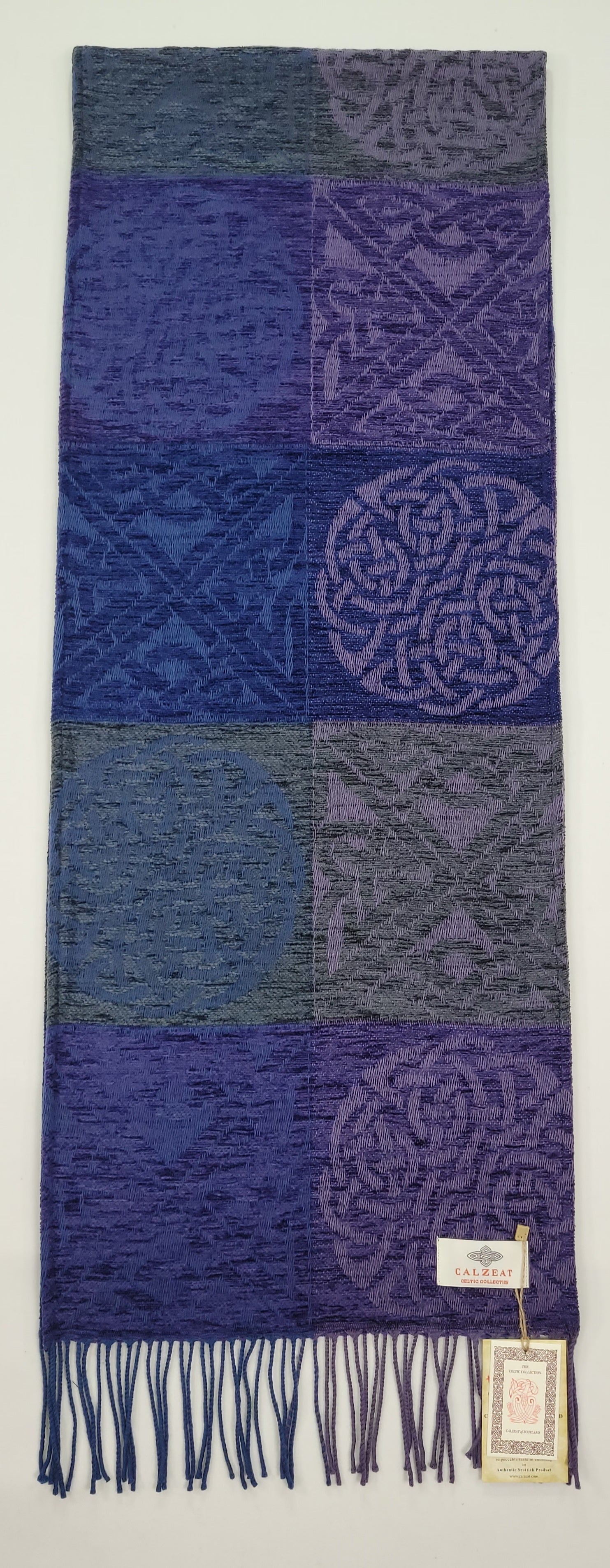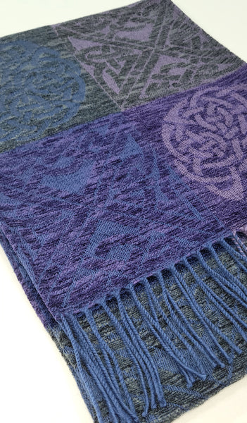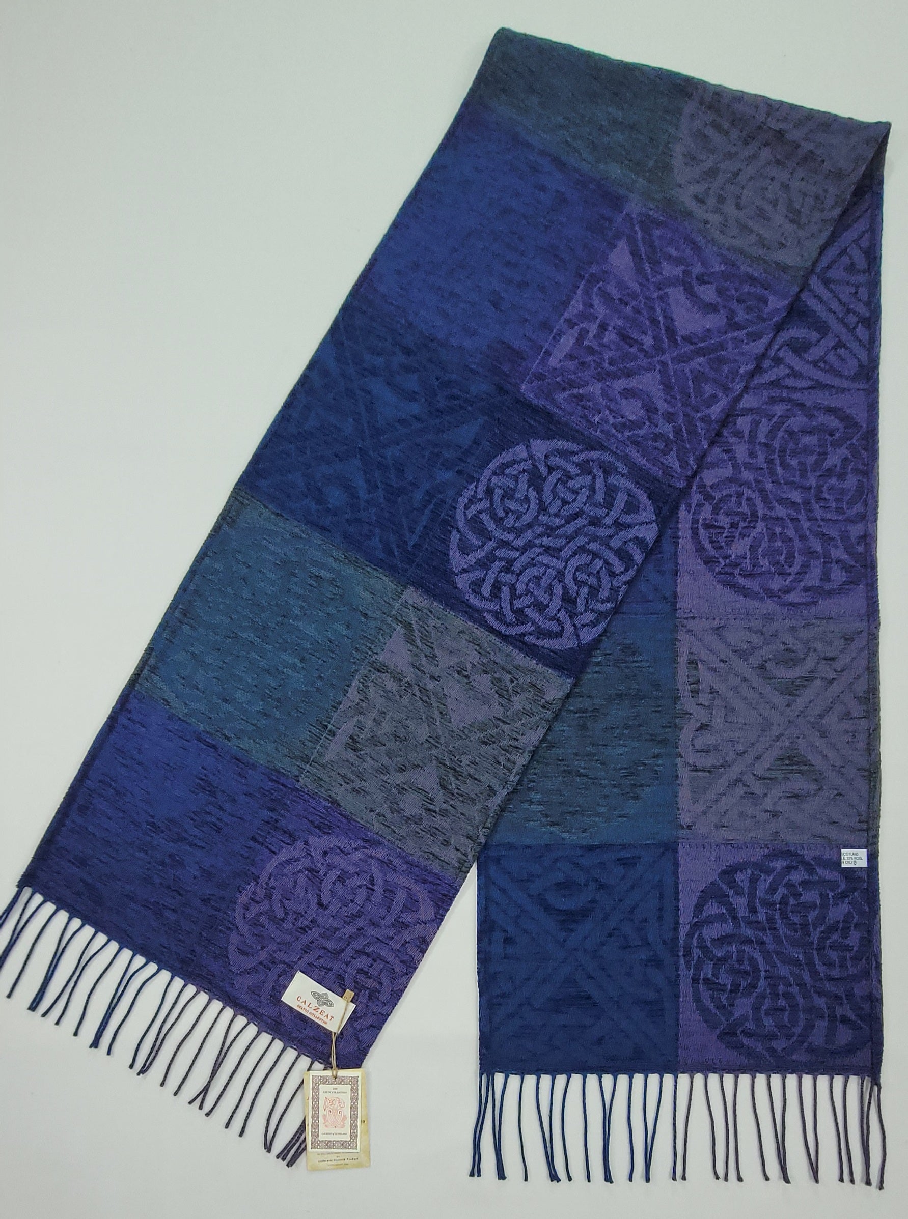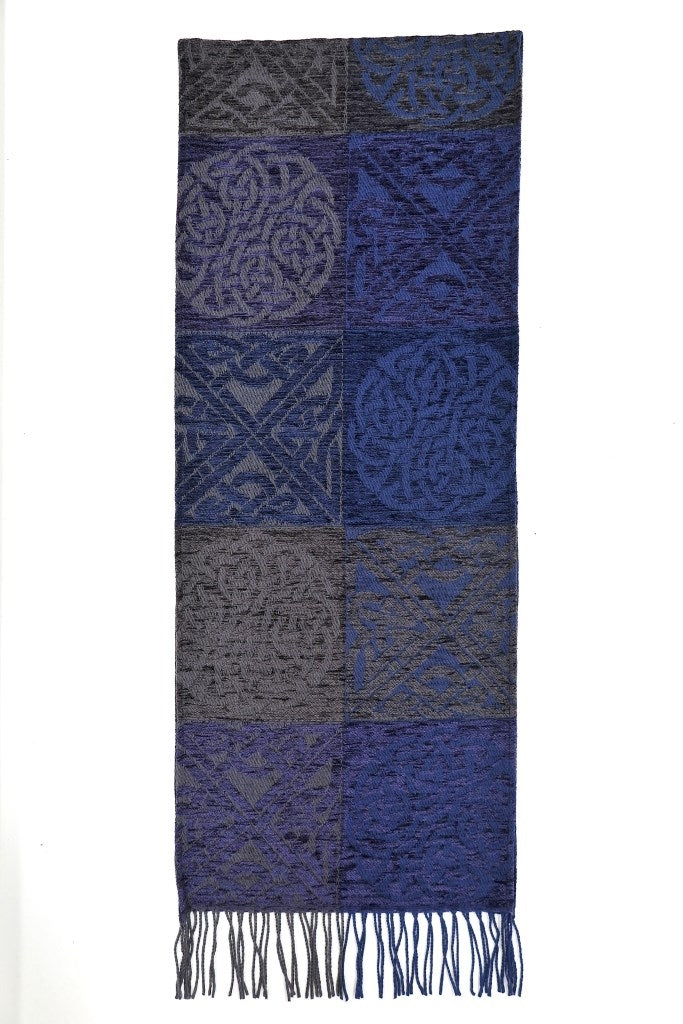 You will see we have used a combination of two Celtic knots in the Pewter colourway which is one of our most popular colour combinations using slate grey, royal blue and deep purple. Our scarves are made from our beautiful throws so colour block placement may vary.