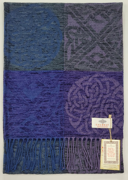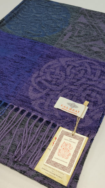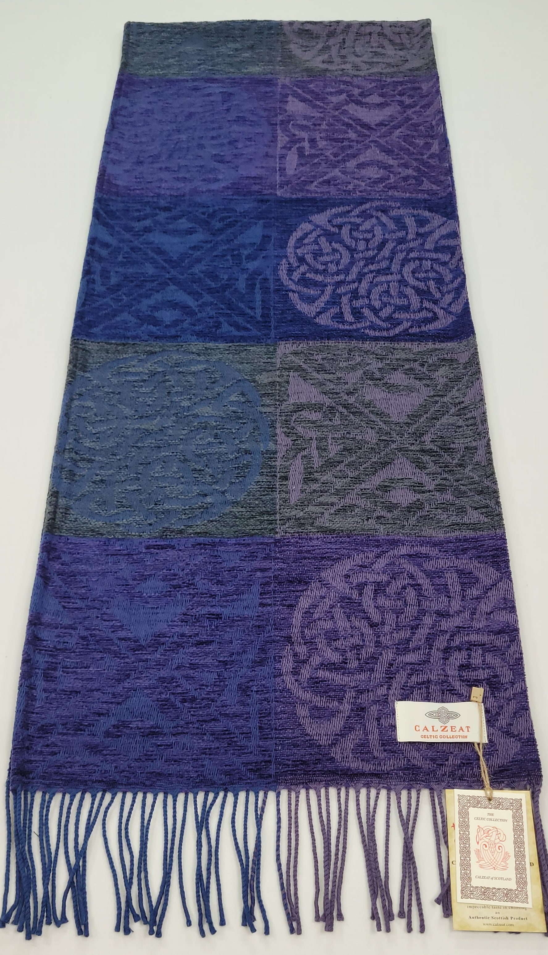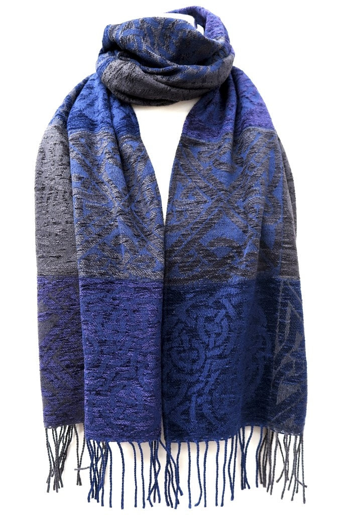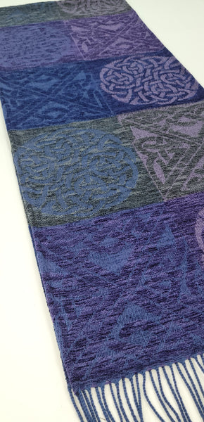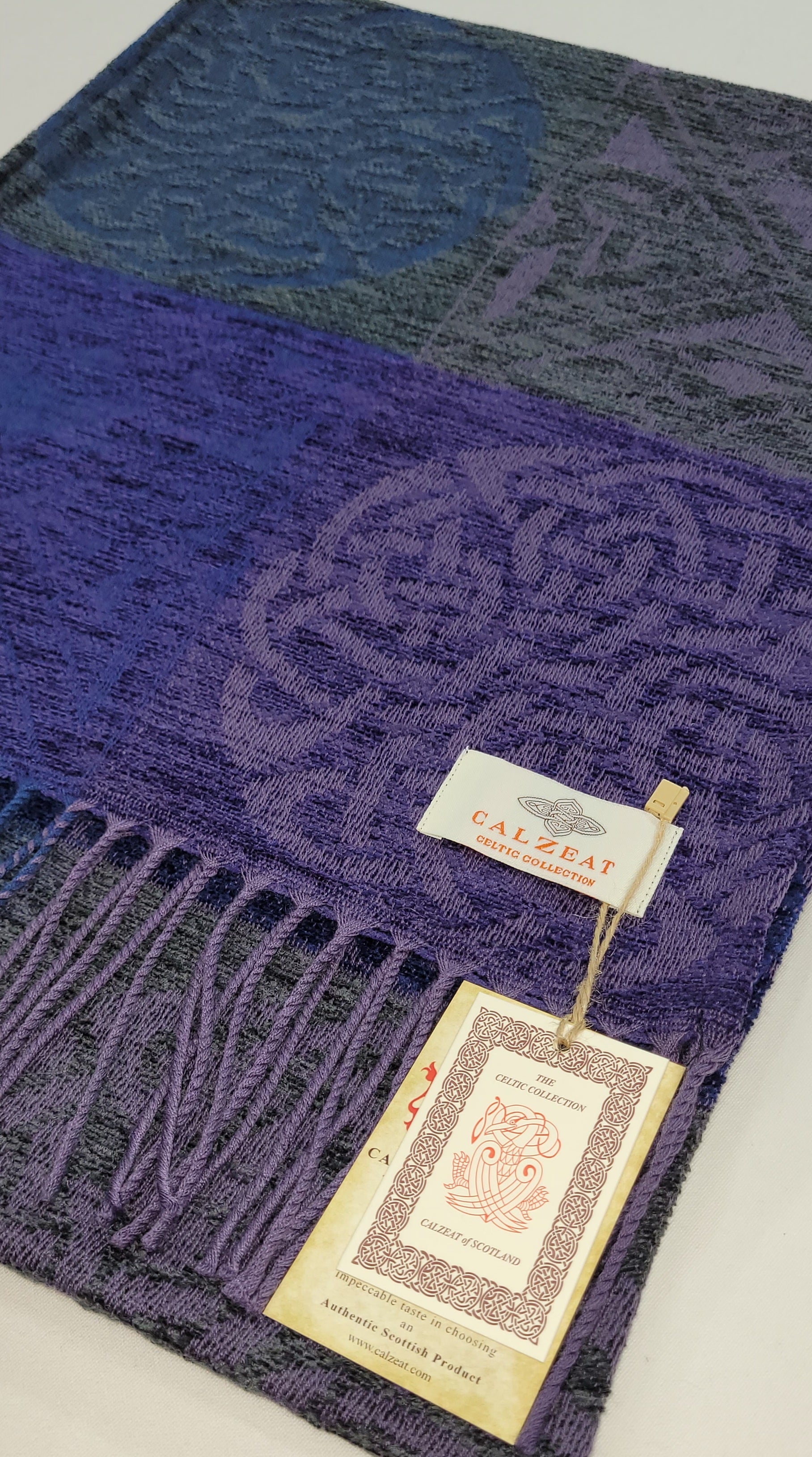 You will see we have used a combination of two Celtic knots in the Pewter colourway which is one of our most popular colour combinations using slate grey, royal blue and deep purple. Our scarves are made from our beautiful throws so colour block placement may vary.
