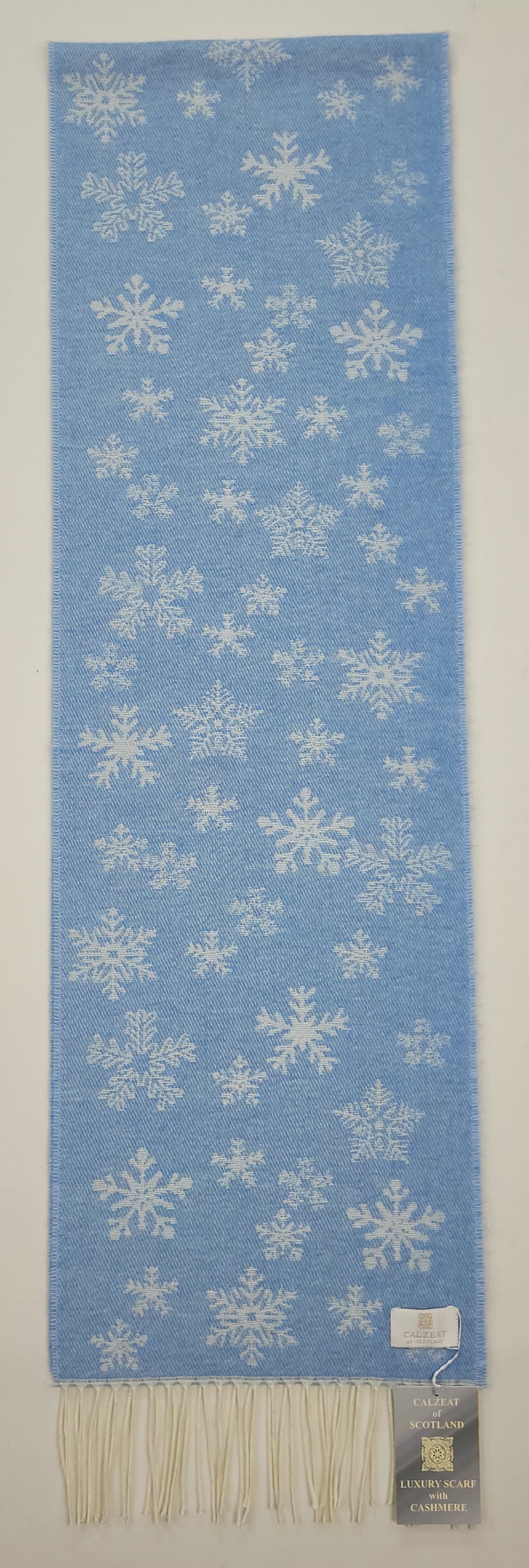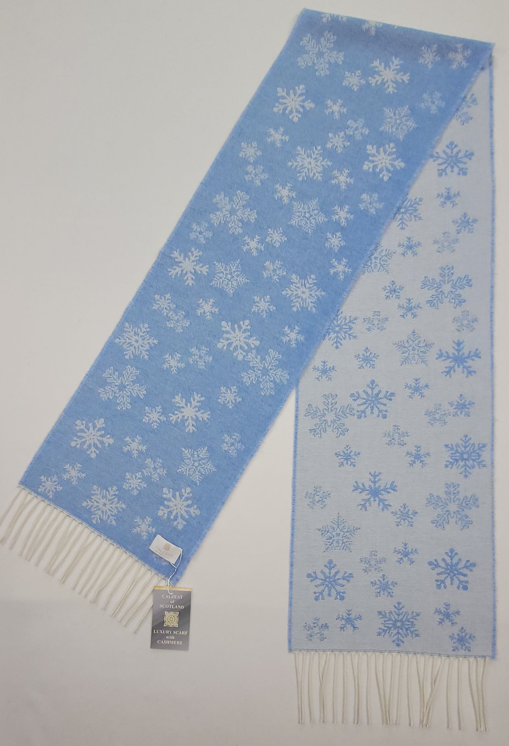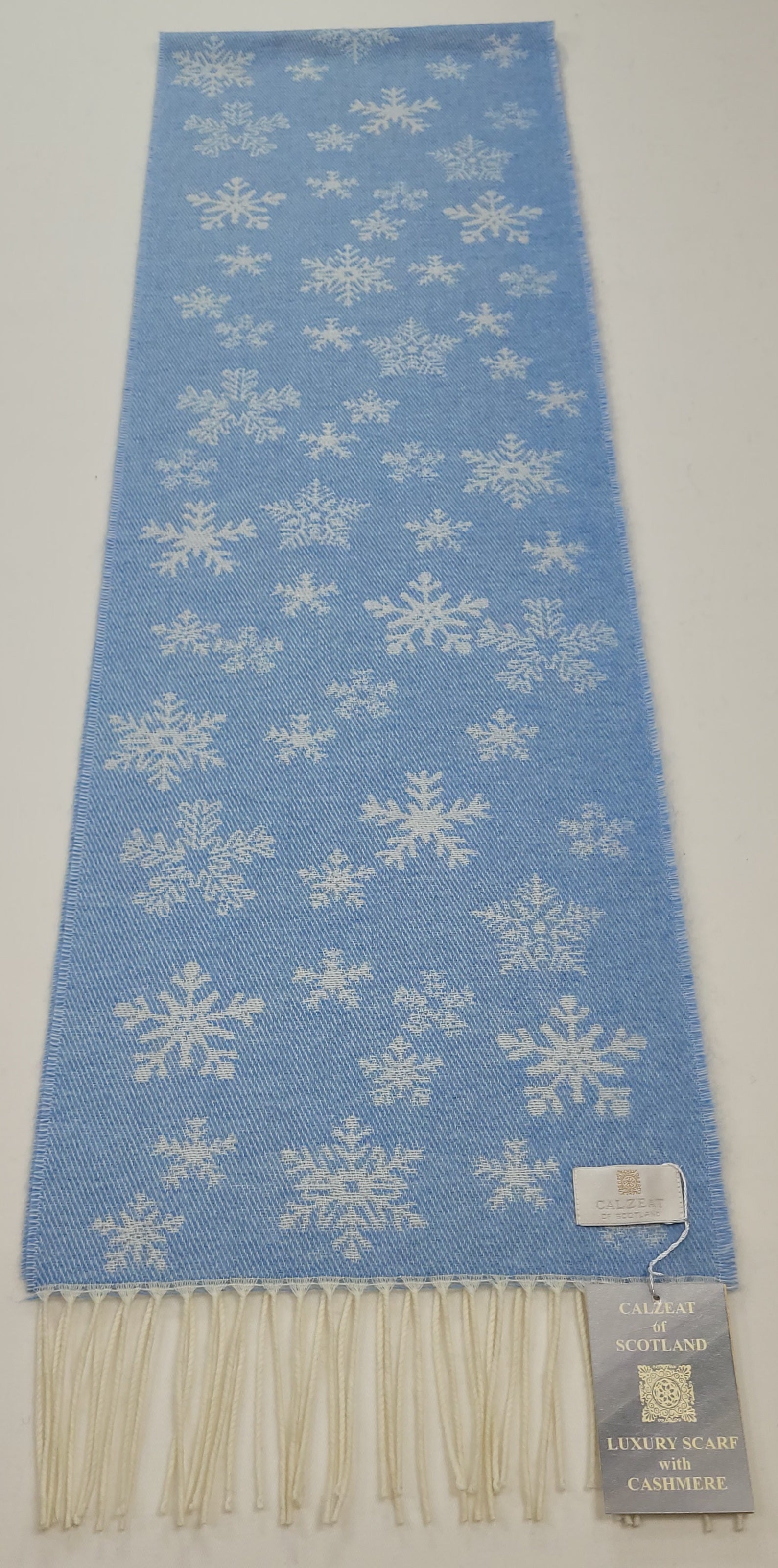 Baby Blue Winter Snowflake Scarf Cashmere blend scarf with delicate snowflake patterns. Dimensions: 26 x 210 cms Composition: 62% Wool/19% Polyamide/16% Viscose/3% Cashmere An authentic Scottish product exclusively designed and woven by Calzeat of Scotland. |