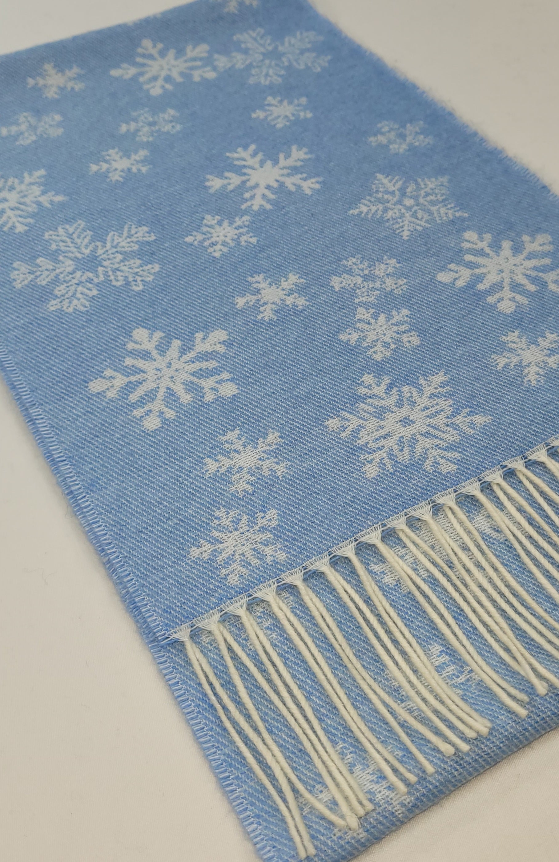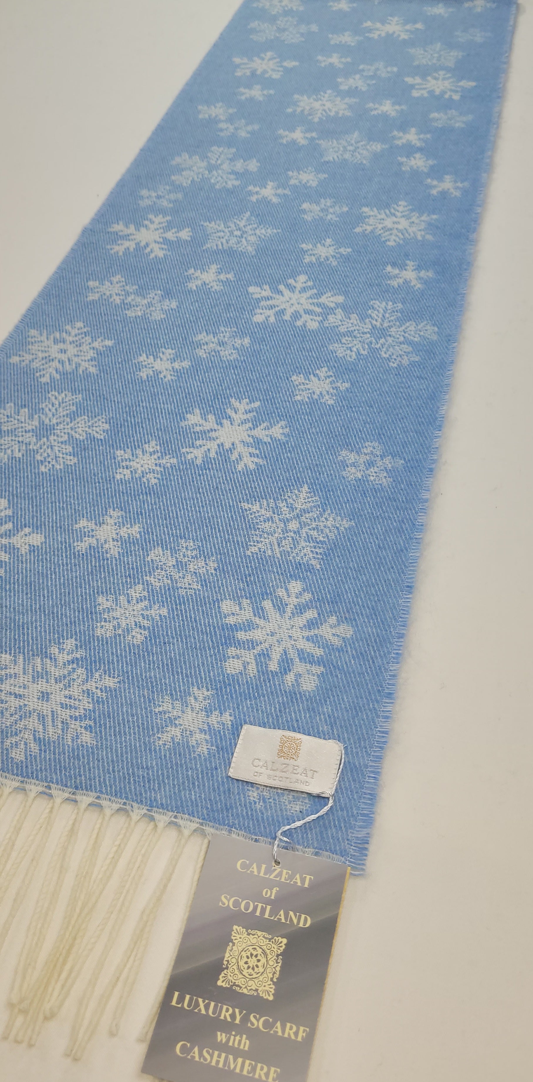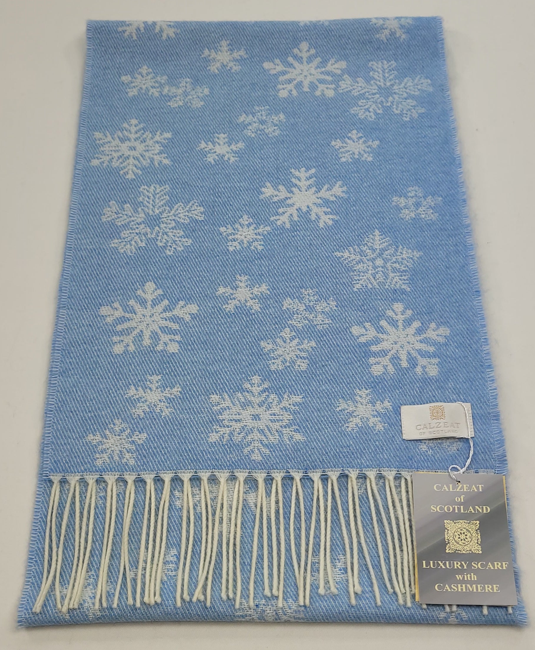 Baby Blue Winter Snowflake Scarf Cashmere blend scarf with delicate snowflake patterns. Dimensions: 26 x 210 cms Composition: 62% Wool/19% Polyamide/16% Viscose/3% Cashmere An authentic Scottish product exclusively designed and woven by Calzeat of Scotland. |