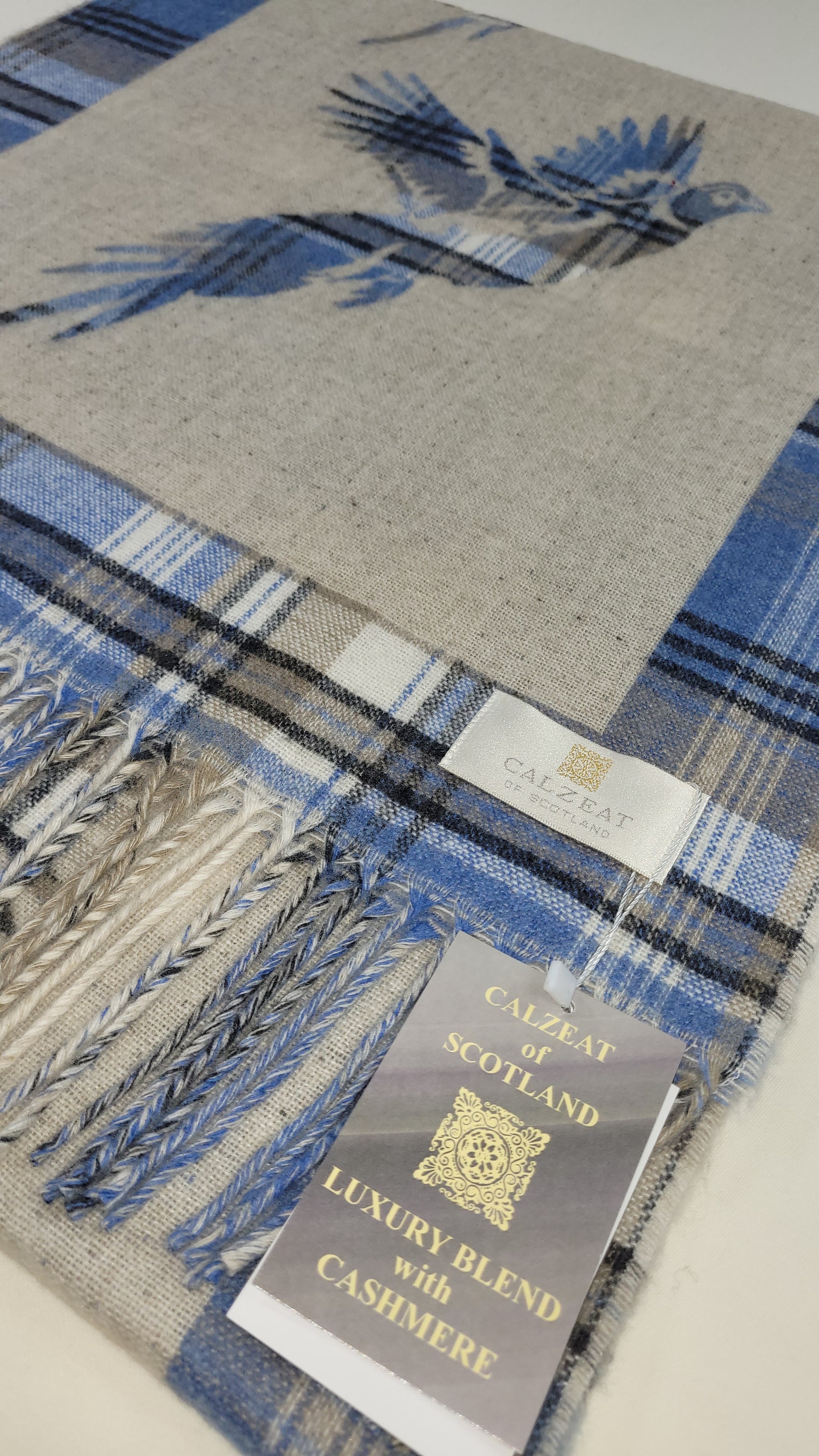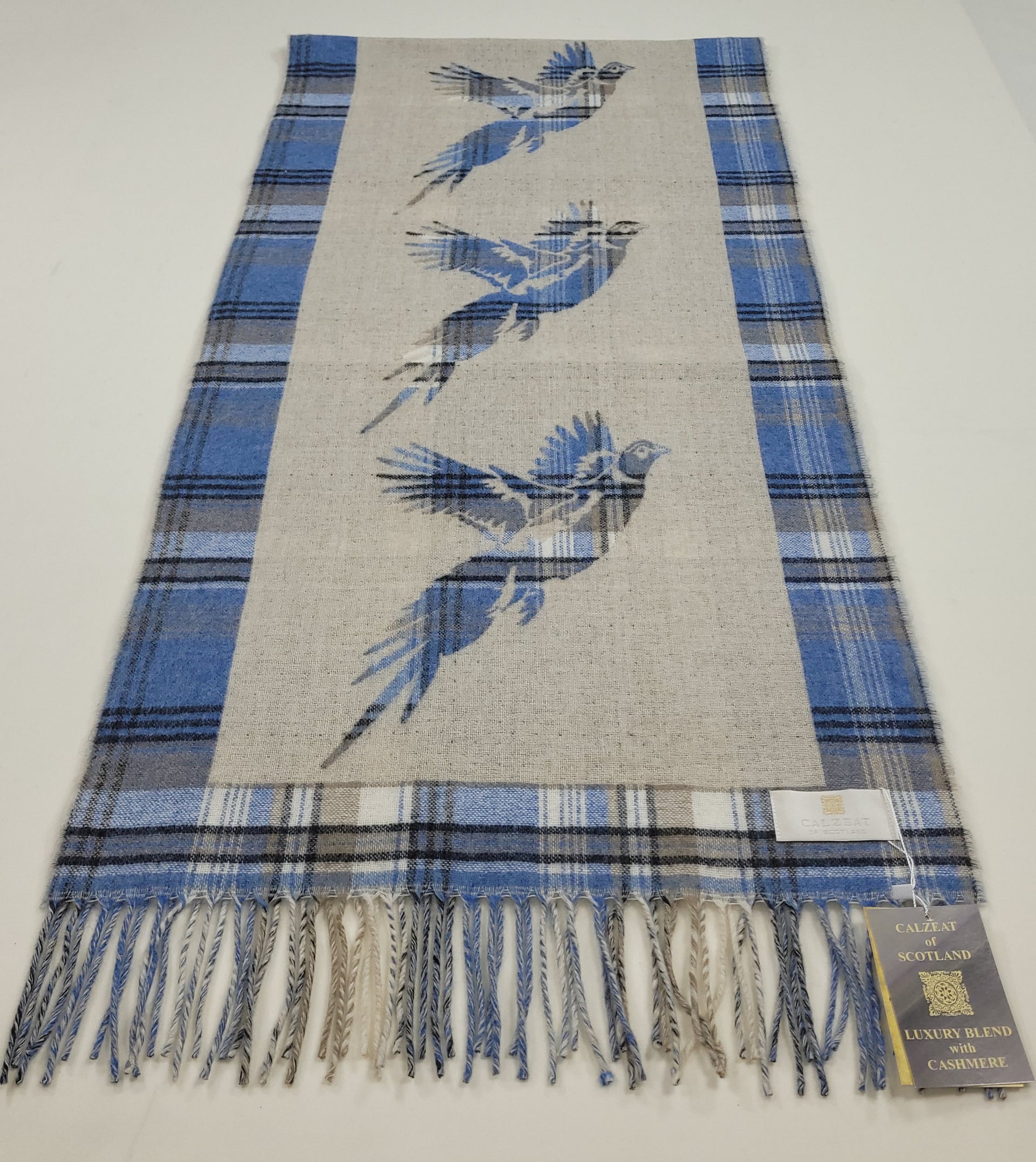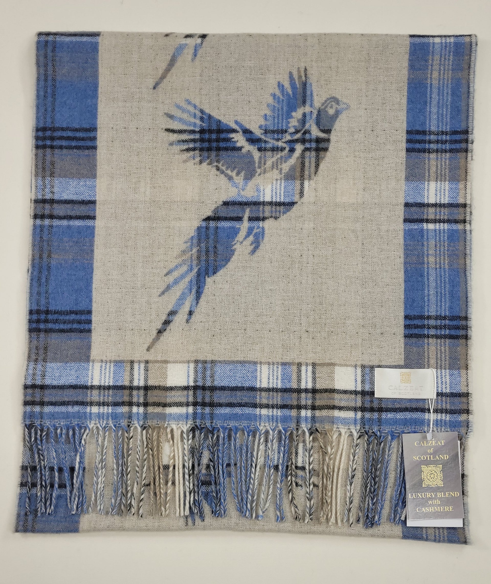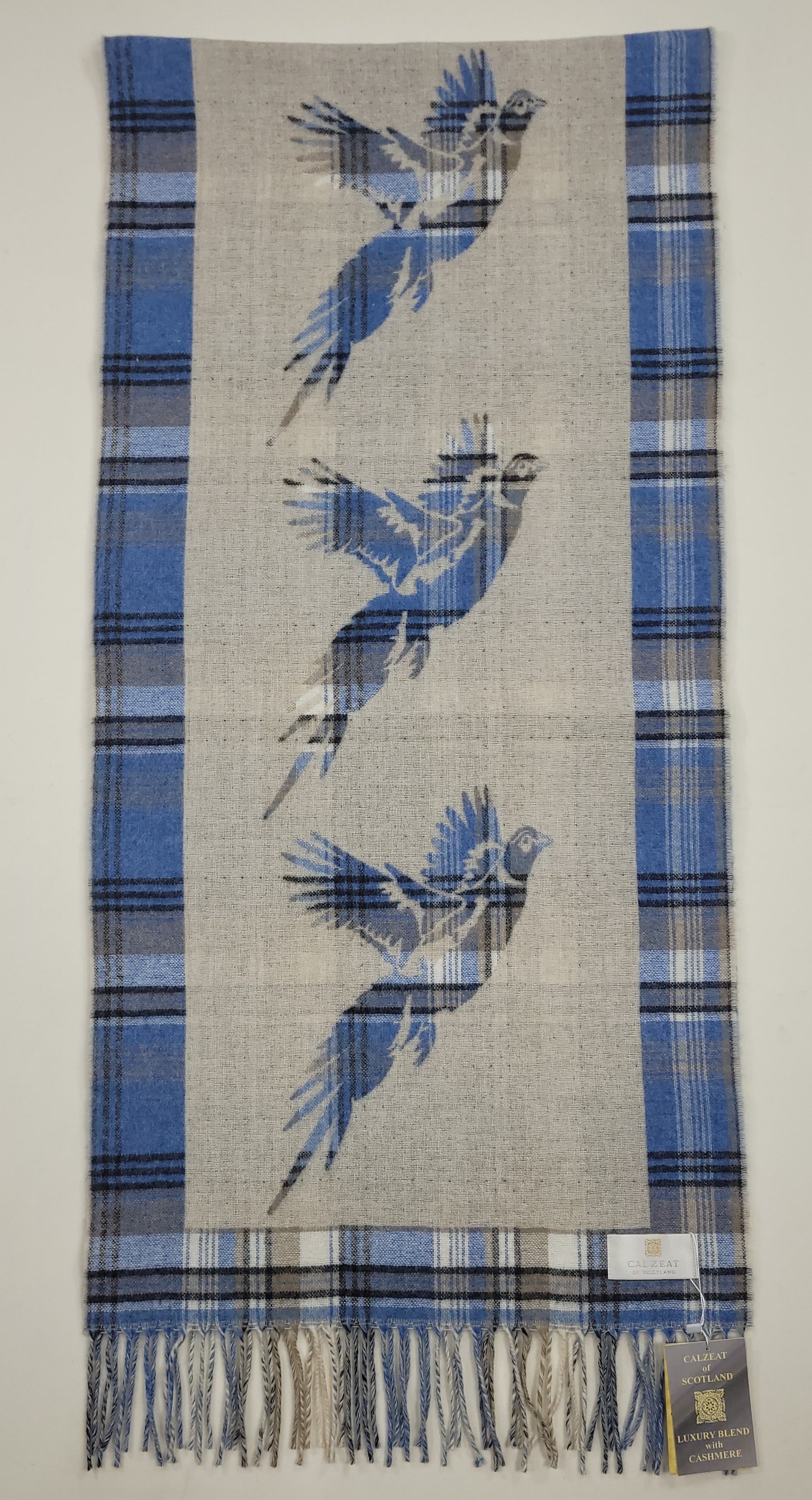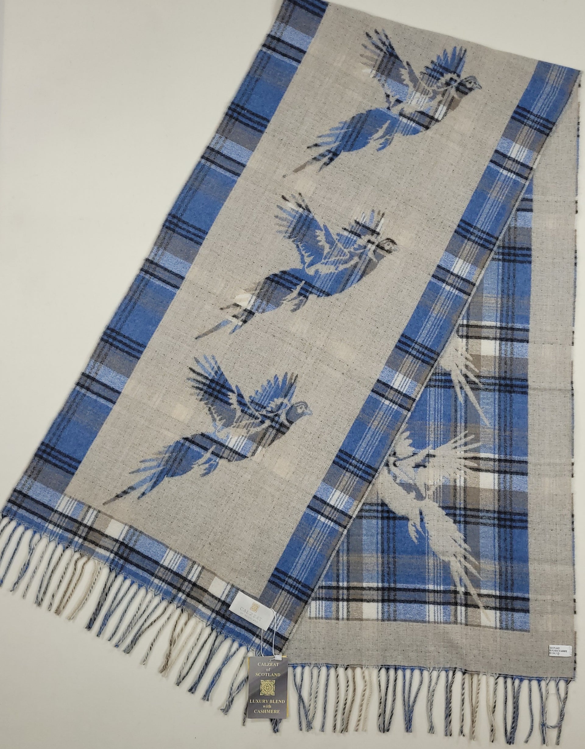 Our Blue Pheasant Wrap is lovely and soft to the touch. It features an intricate double cloth construction that creates a Scottish check in the motif of a pheasant. This truly is a beautiful & unique Scottish product. Dimensions: 47 x 200 cm Including Fringes An authentic Scottish product exclusively designed and woven by Calzeat of Scotland. |