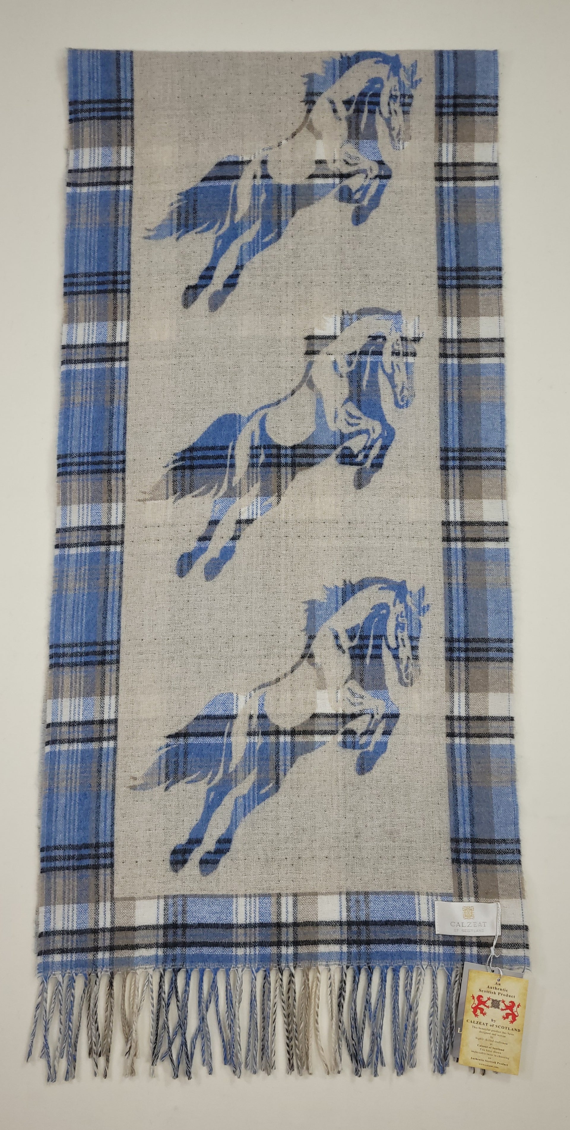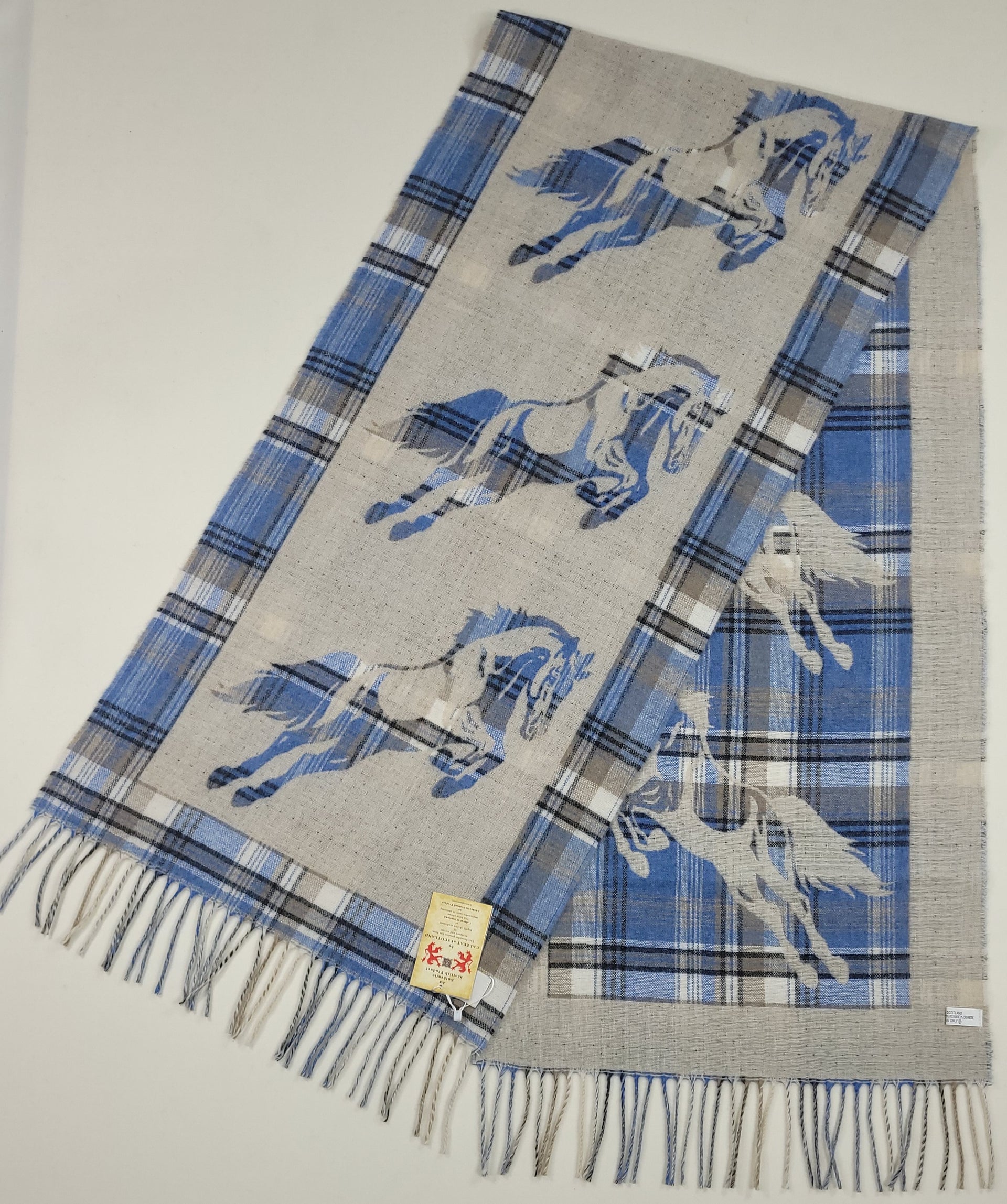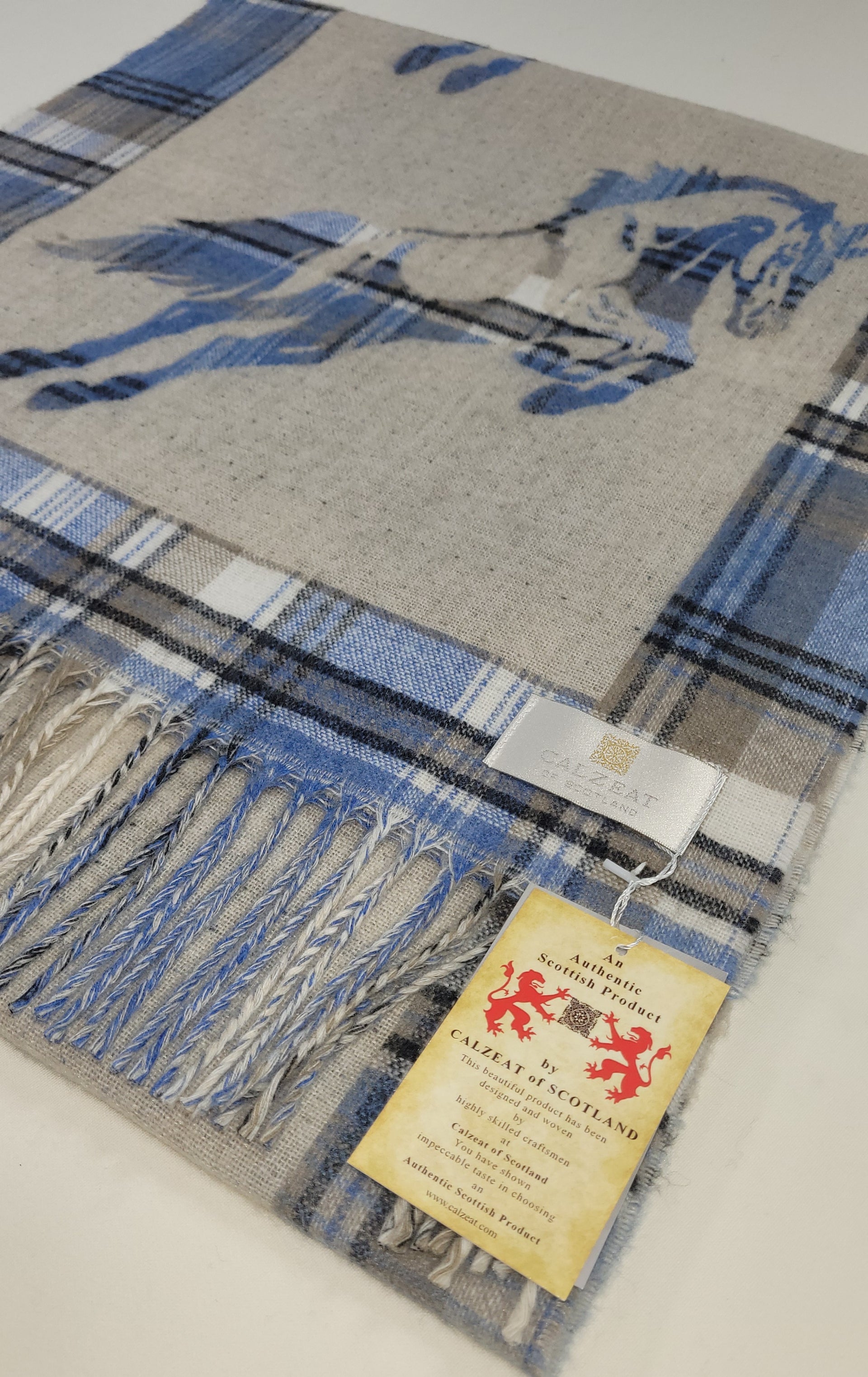 Our Blue Horse Wrap is lovely and soft to the touch. It features an intricate double cloth construction that creates a Scottish check in the motif of a jumping horse. This truly is a beautiful & unique Scottish product. Dimensions: 47 x 200 cm Including Fringes An authentic Scottish product exclusively designed and woven by Calzeat of Scotland. |