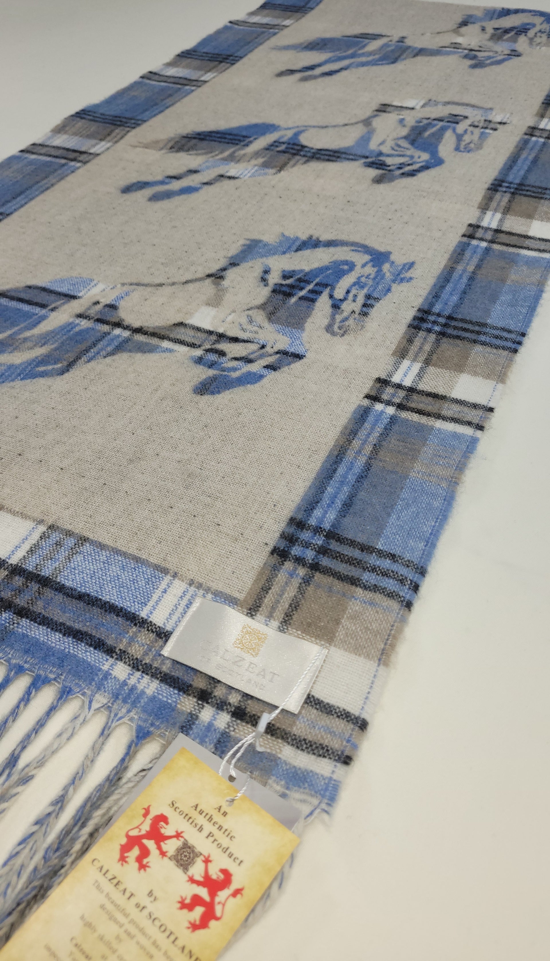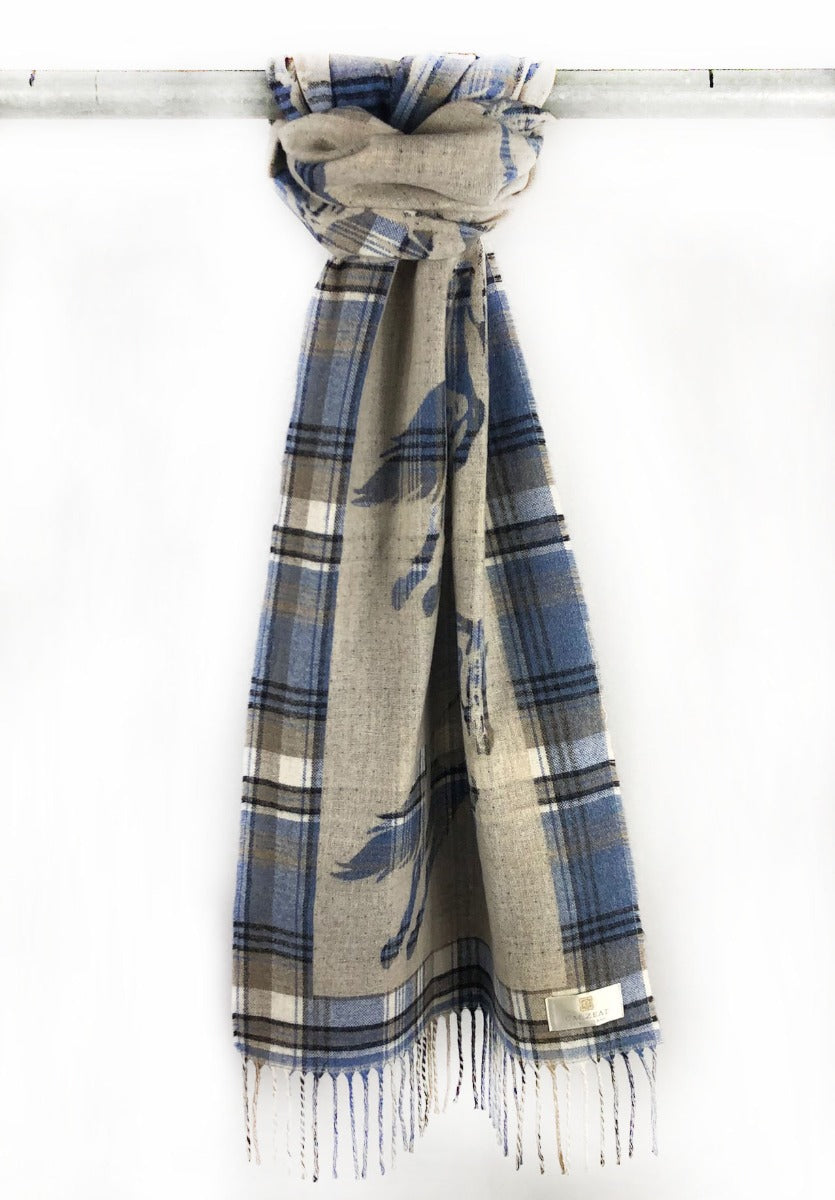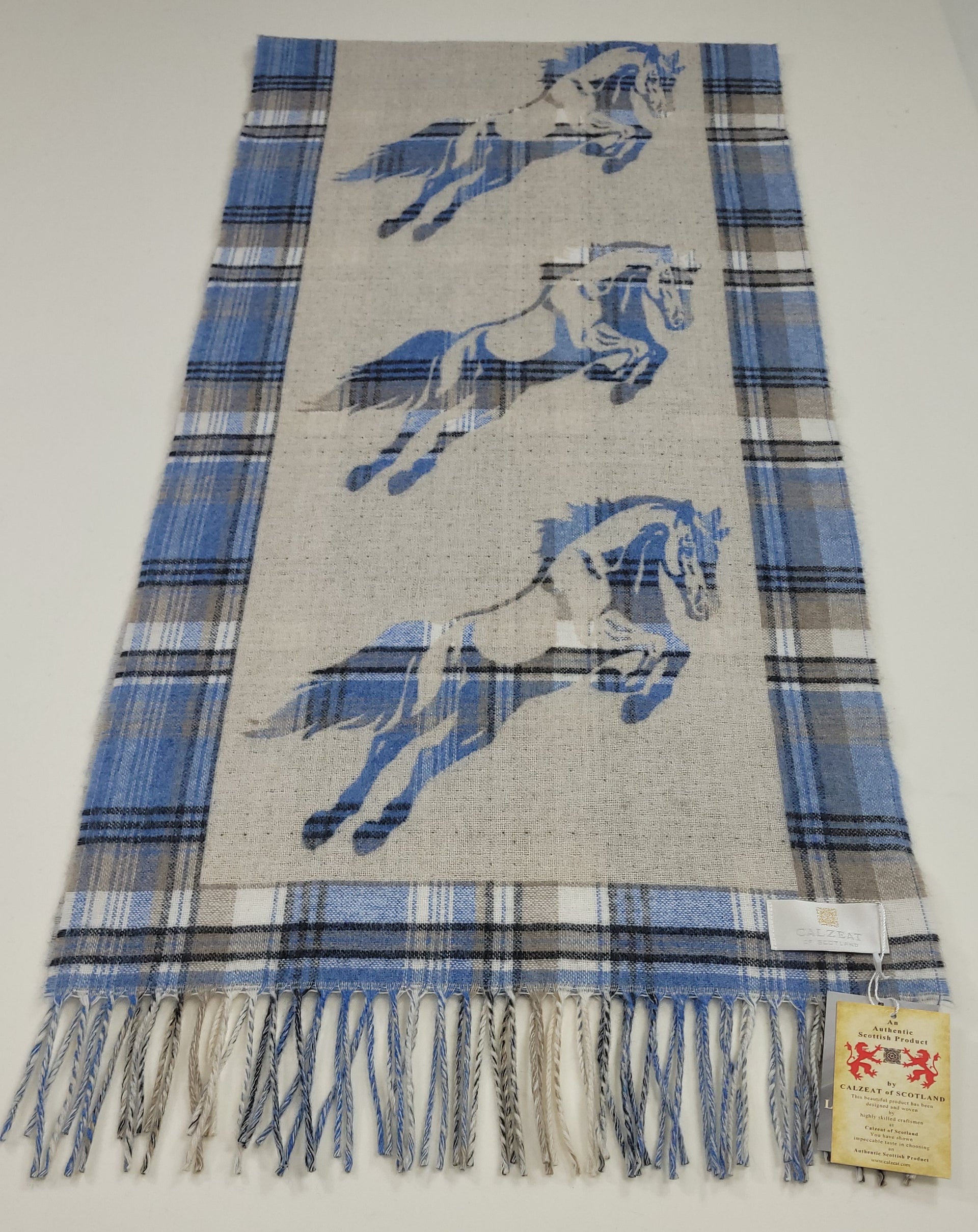 Our Blue Horse Wrap is lovely and soft to the touch. It features an intricate double cloth construction that creates a Scottish check in the motif of a jumping horse. This truly is a beautiful & unique Scottish product. Dimensions: 47 x 200 cm Including Fringes An authentic Scottish product exclusively designed and woven by Calzeat of Scotland. |