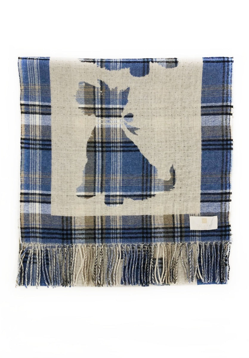 Description | Our Blue Scottie Dog Wrap is lovely and soft to the touch. It features an intricate double cloth construction that creates a Scottish check in the motif of a Scottie dog. This truly is a beautiful & unique Scottish product. Dimensions: 47 x 200 cm Including Fringes An authentic Scottish product exclusively designed and woven by Calzeat of Scotland. |
