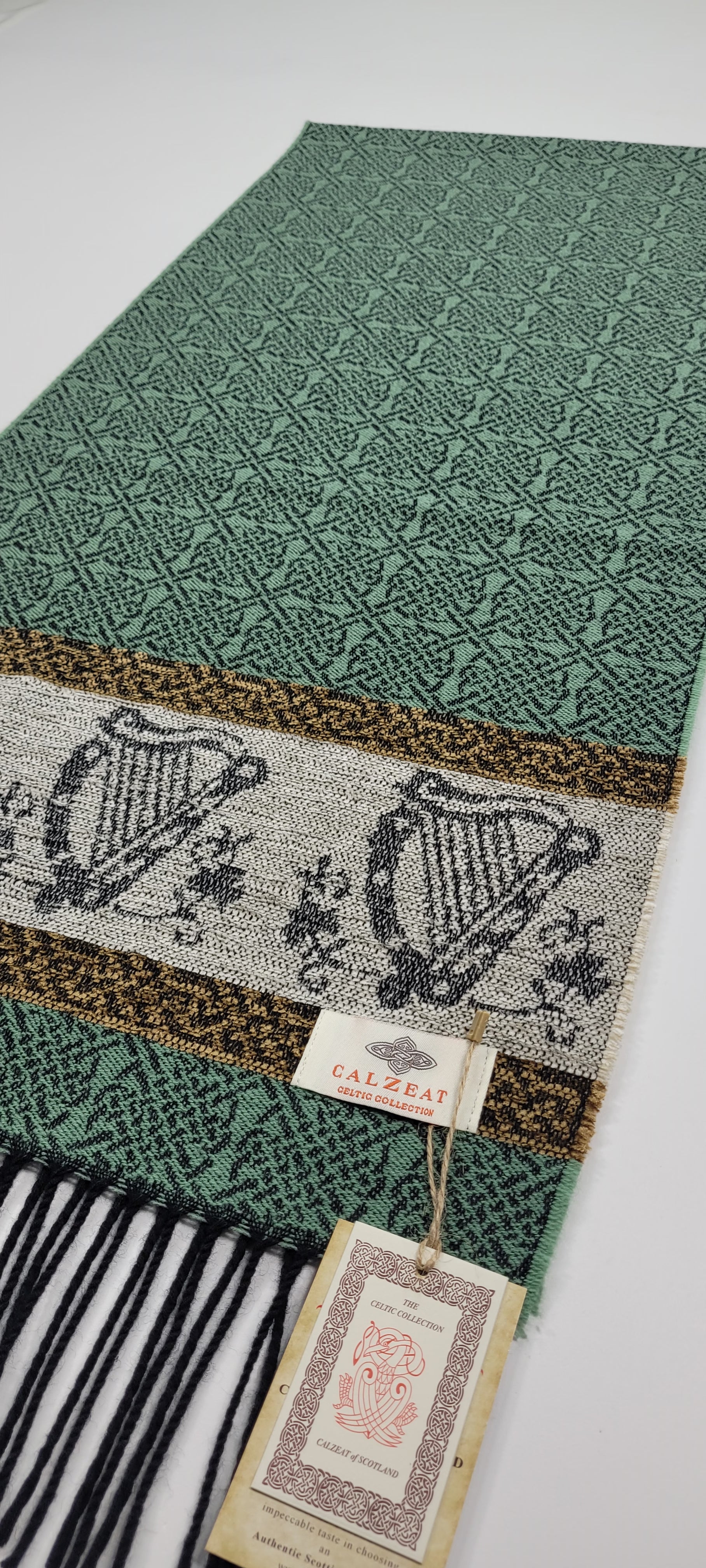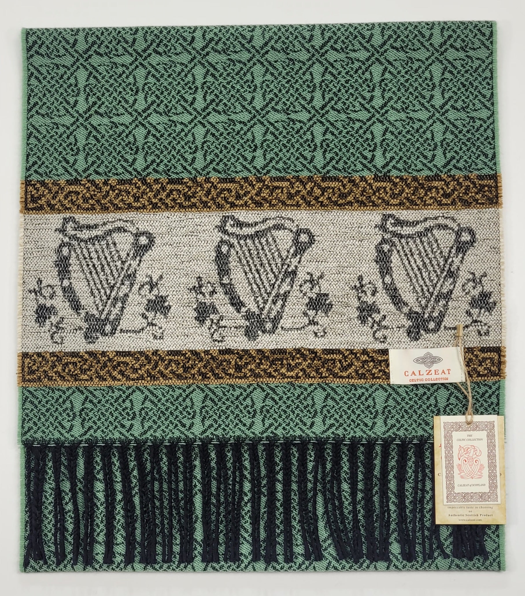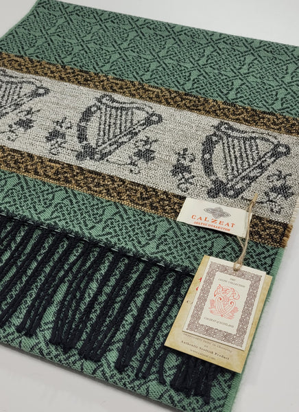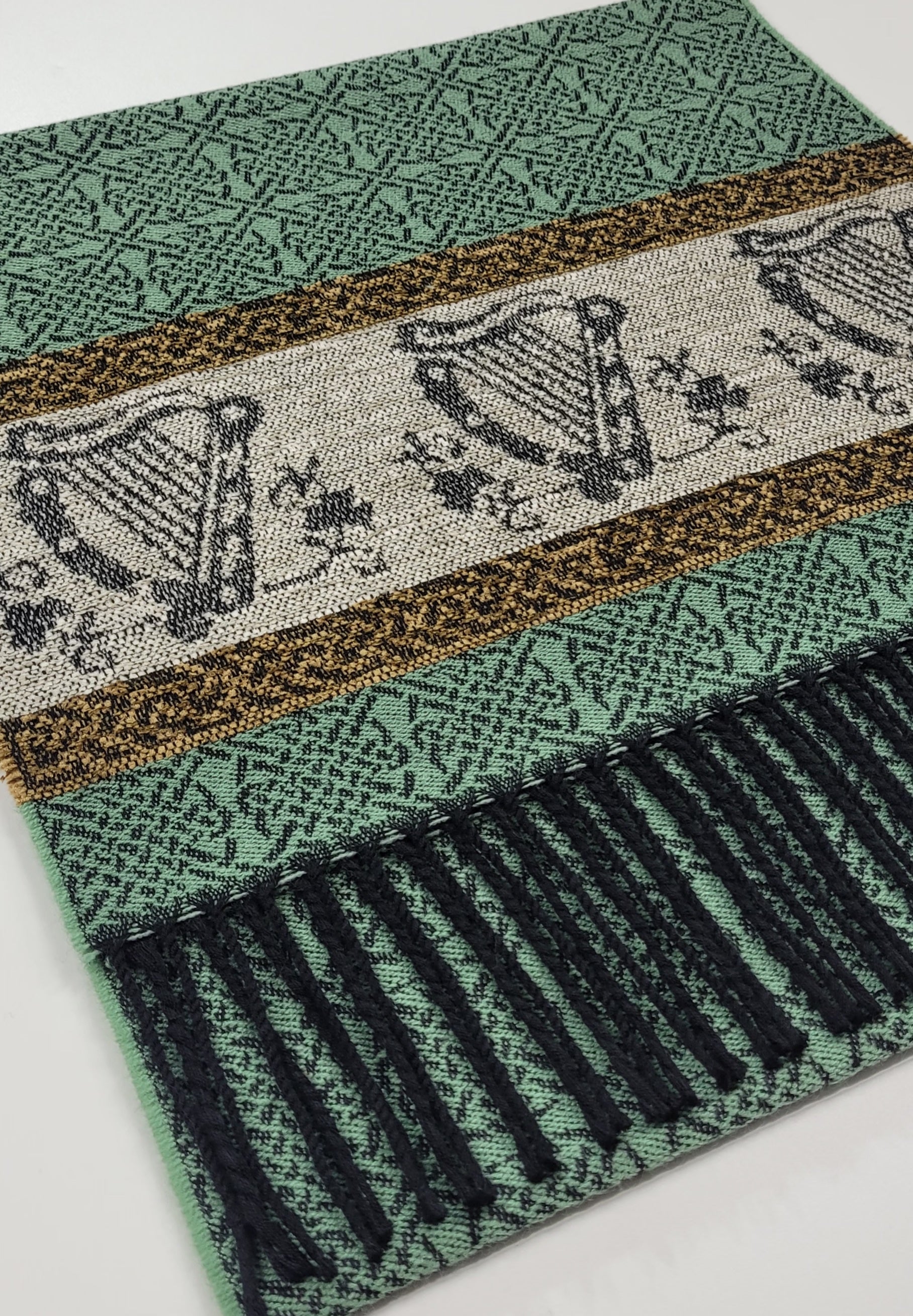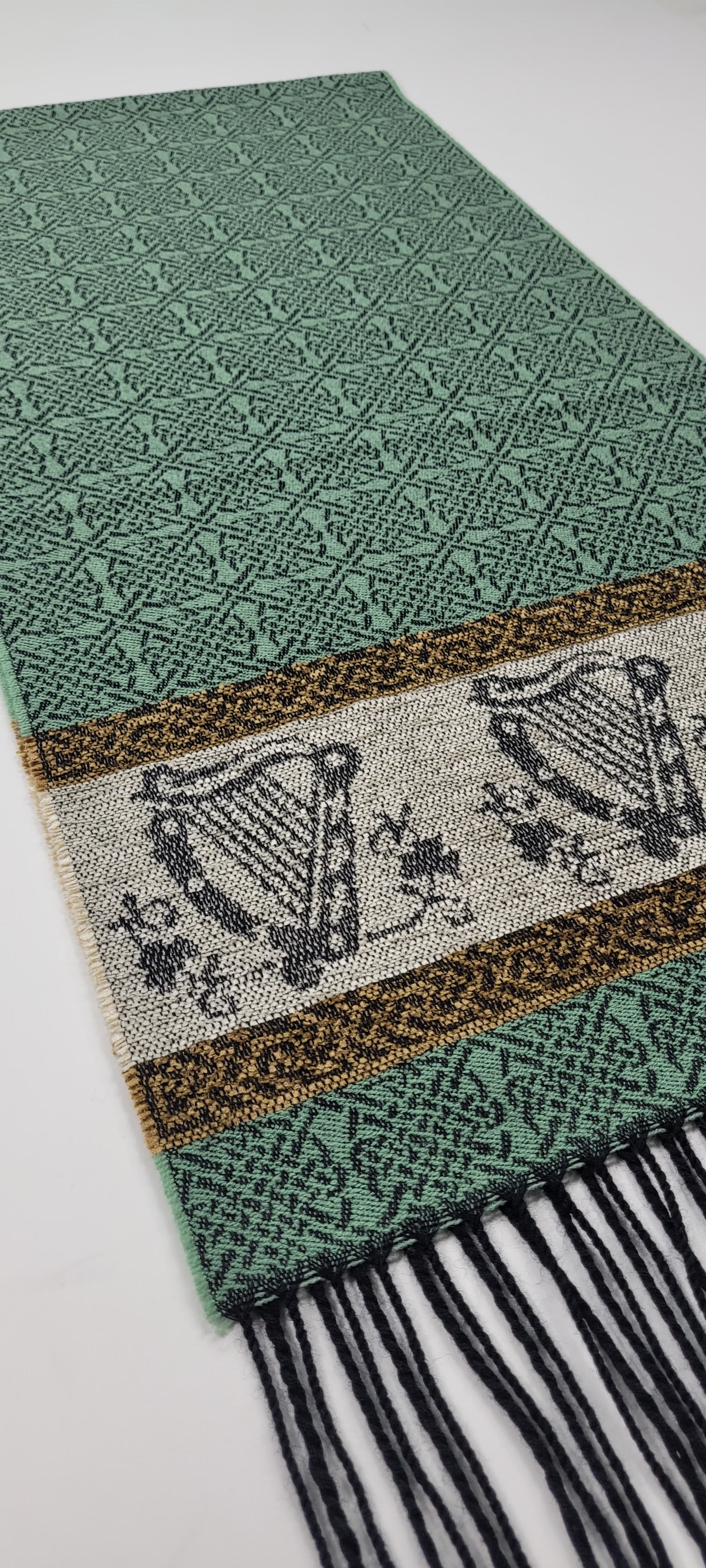 This exquisite jacquard woven scarf celebrates Celtic heritage through its intricate harp motif, inspired by the natural beauty of meadow landscapes. Crafted with precision weaving techniques, the design captures the delicate interplay of traditional Celtic symbolism and organic imagery. The sophisticated colour palette and detailed pattern work make this piece a versatile accessory for those who appreciate cultural artistry and refined craftsmanship. Perfect for adding a touch of heritage elegance to any ensemble.