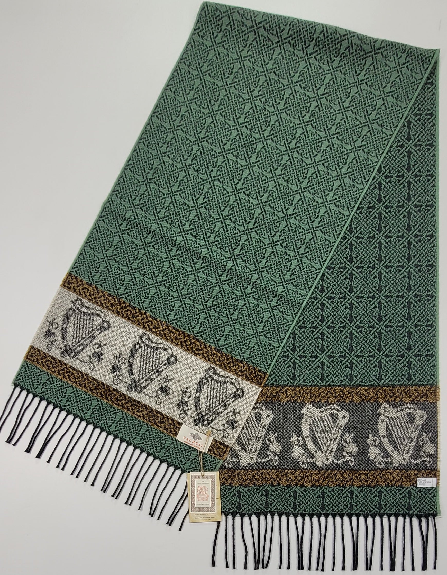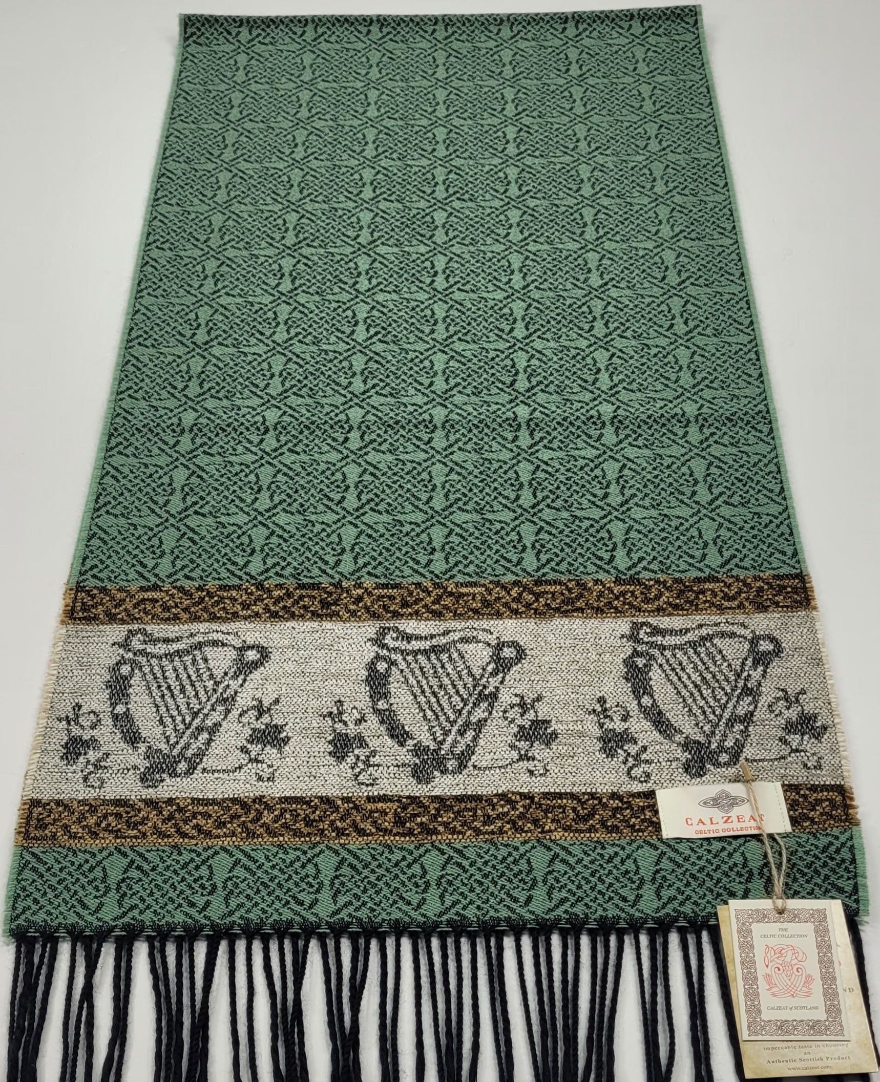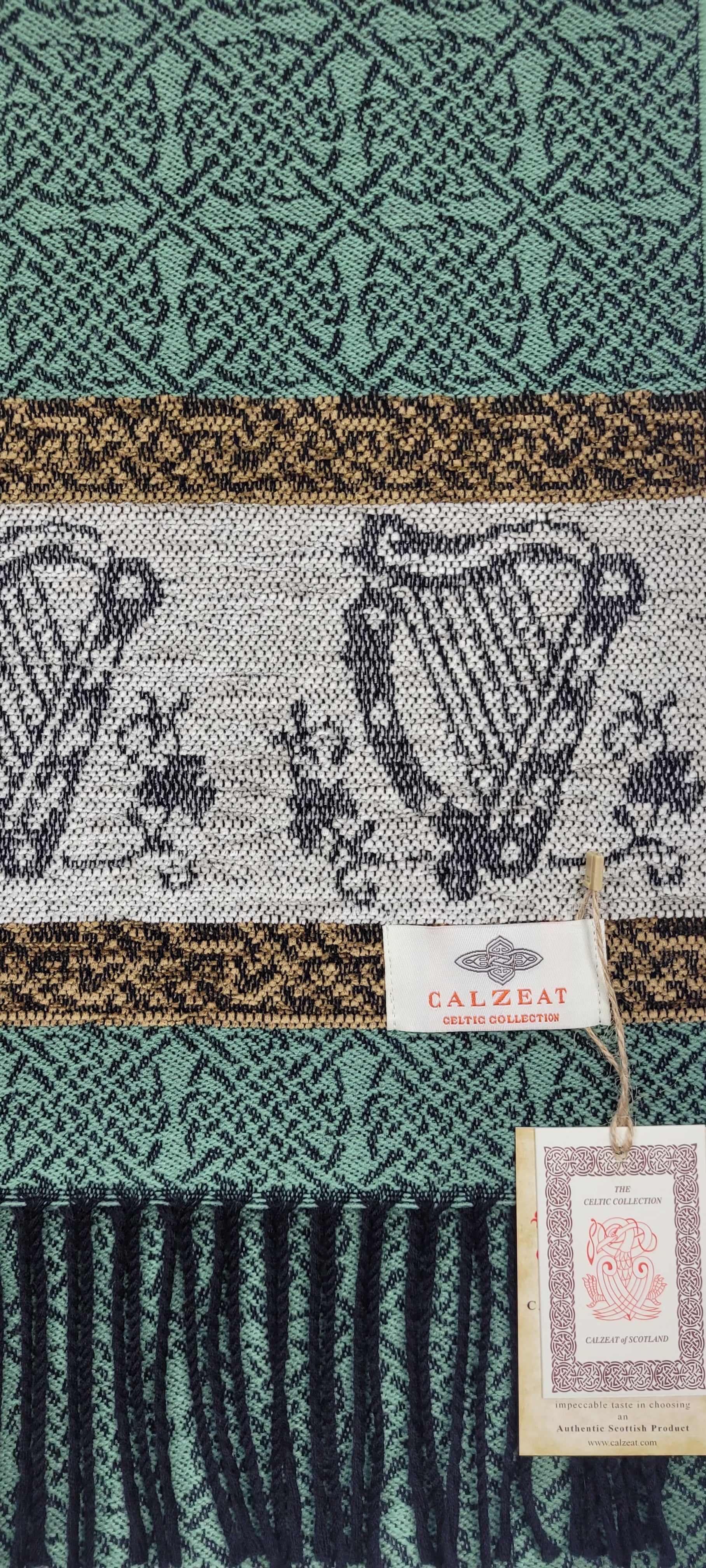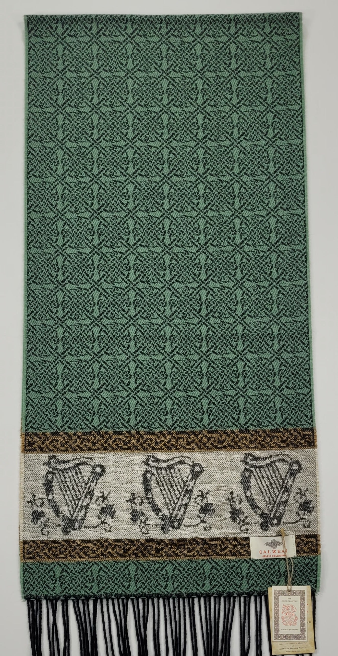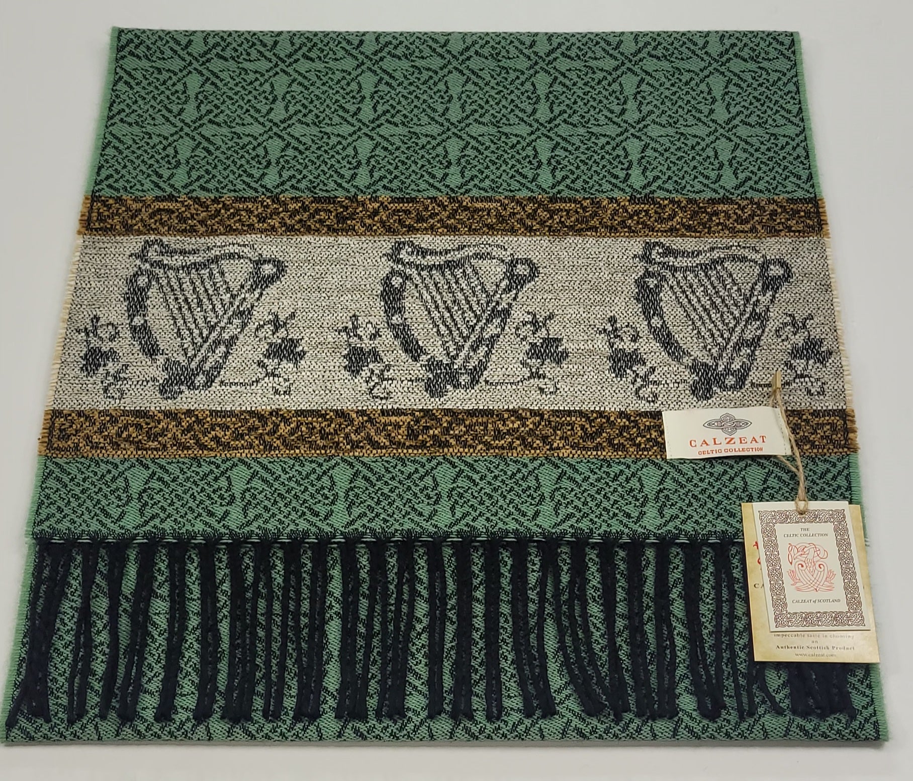 This exquisite jacquard woven scarf celebrates Celtic heritage through its intricate harp motif, inspired by the natural beauty of meadow landscapes. Crafted with precision weaving techniques, the design captures the delicate interplay of traditional Celtic symbolism and organic imagery. The sophisticated colour palette and detailed pattern work make this piece a versatile accessory for those who appreciate cultural artistry and refined craftsmanship. Perfect for adding a touch of heritage elegance to any ensemble.