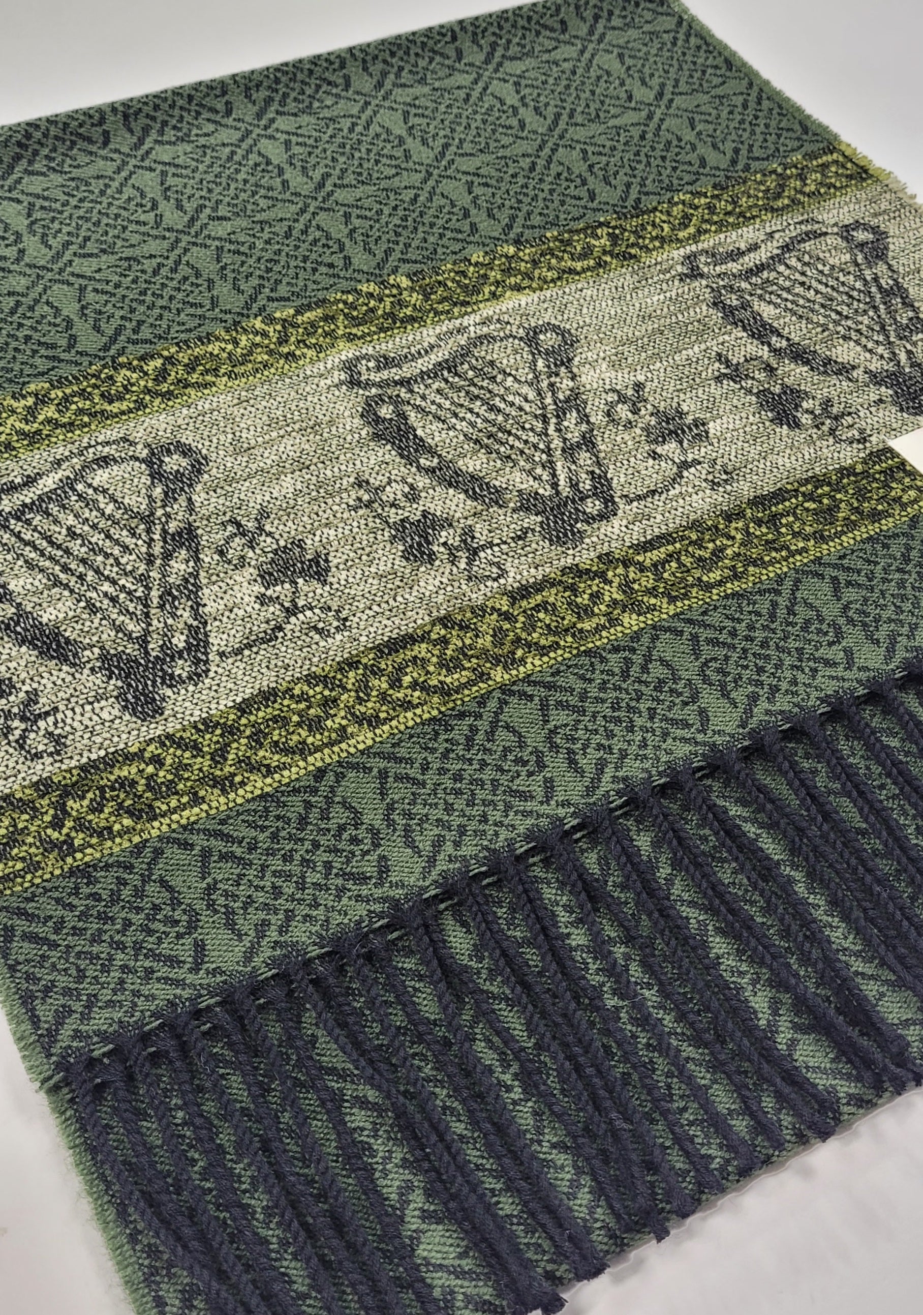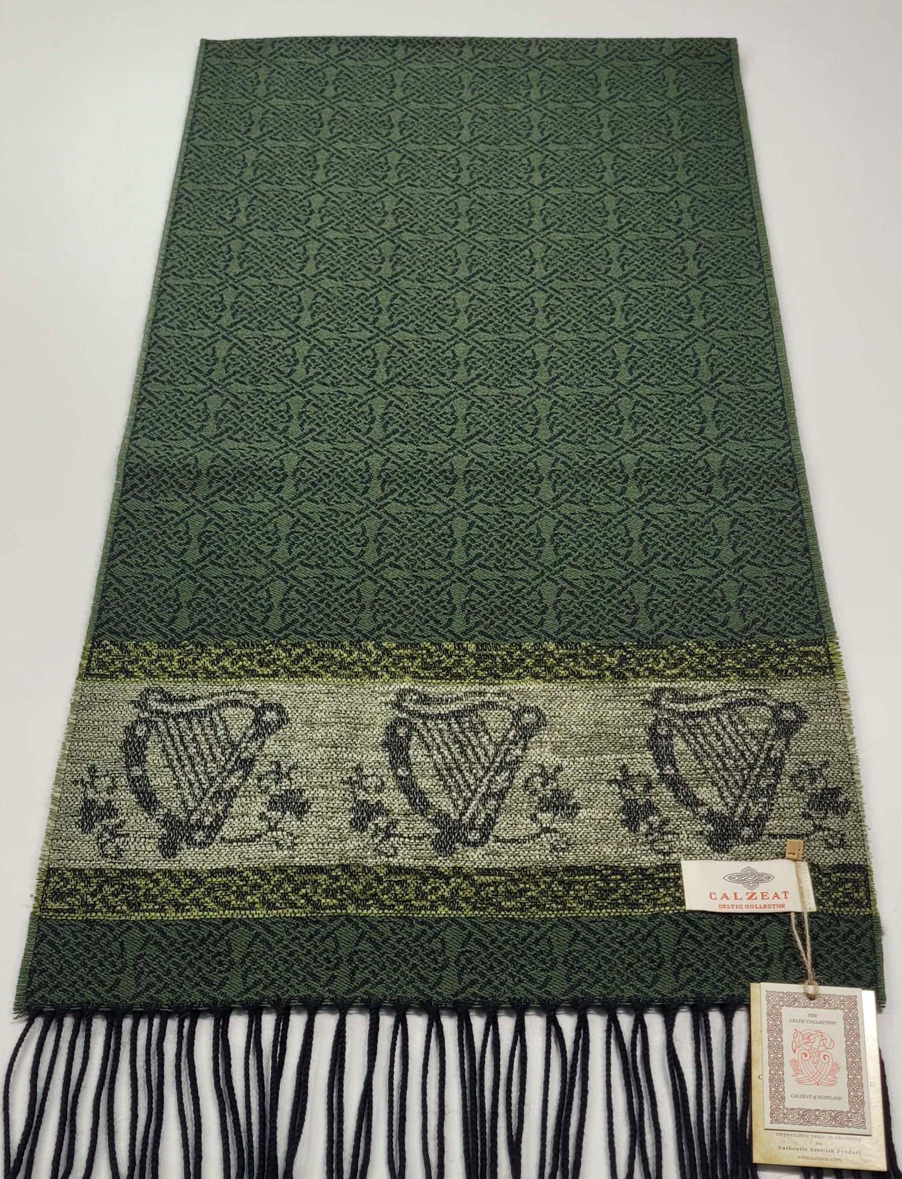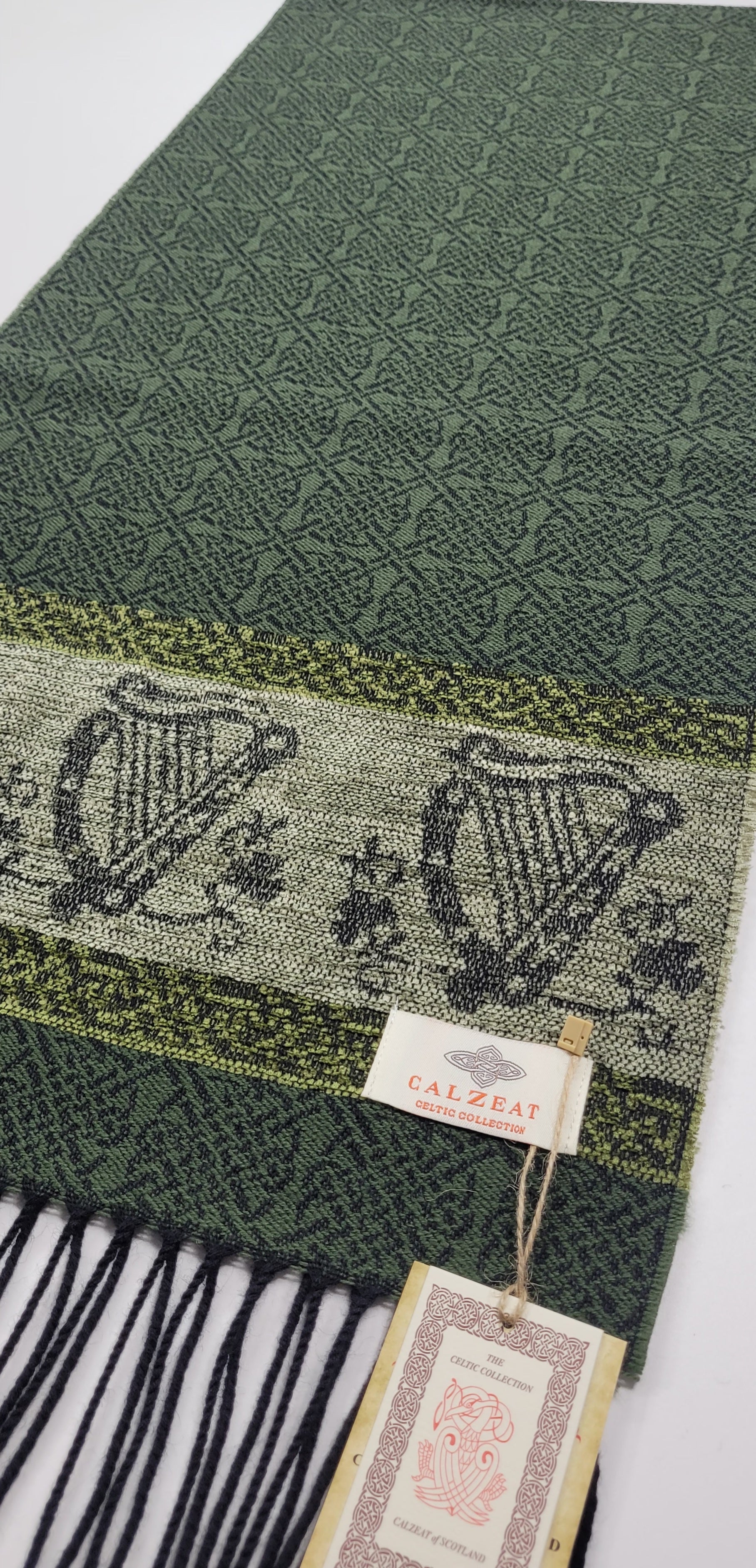 Crafted with meticulous jacquard weaving, this Celtic harp scarf showcases intricate traditional patterns in a sophisticated olive palette. The woven design captures the essence of Celtic heritage with detailed harp motifs that reflect centuries of artistic tradition. Perfect for those who appreciate authentic craftsmanship and cultural symbolism, this versatile accessory elevates any ensemble while celebrating timeless Celtic artistry.
