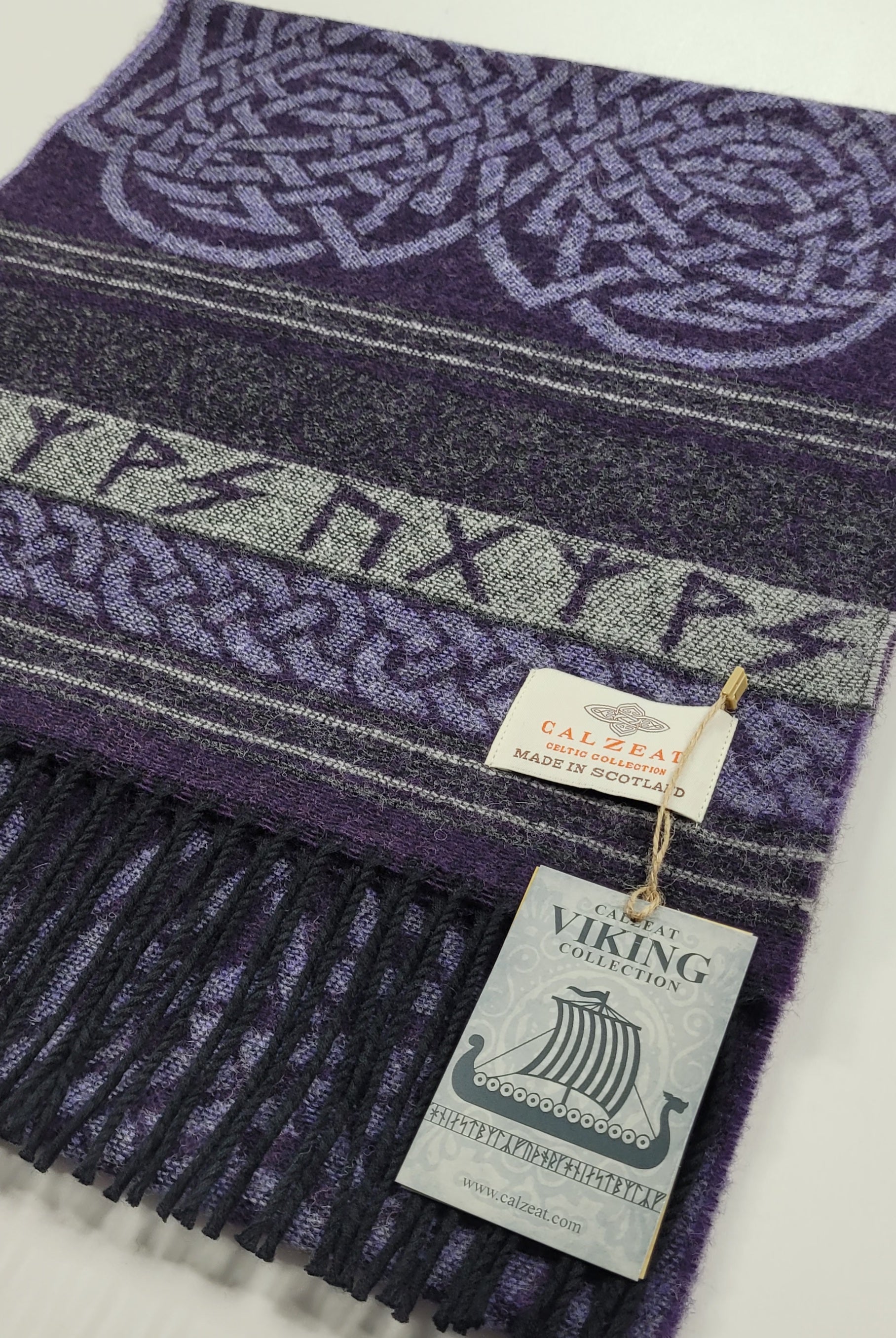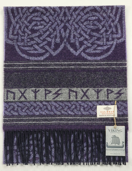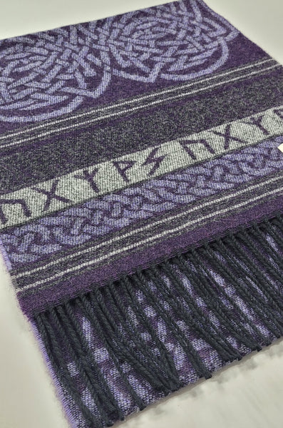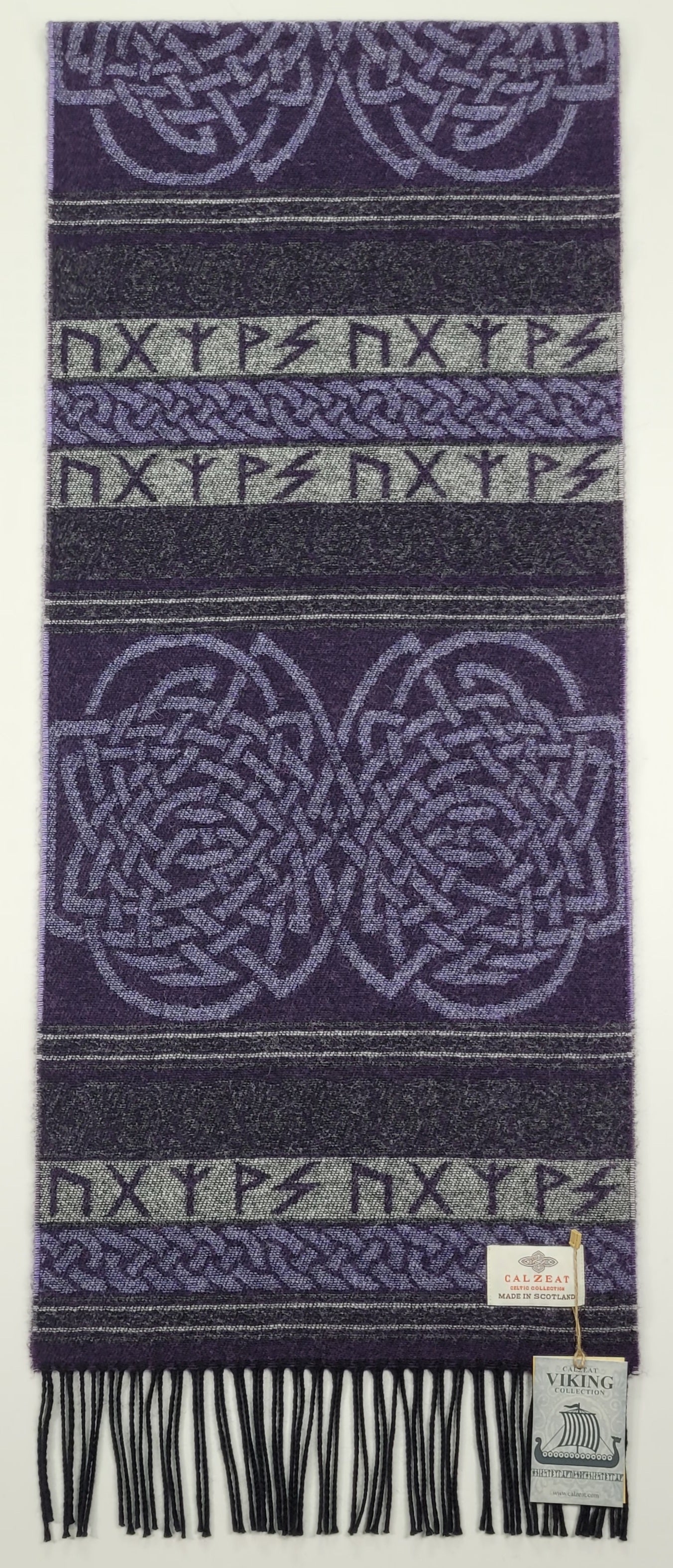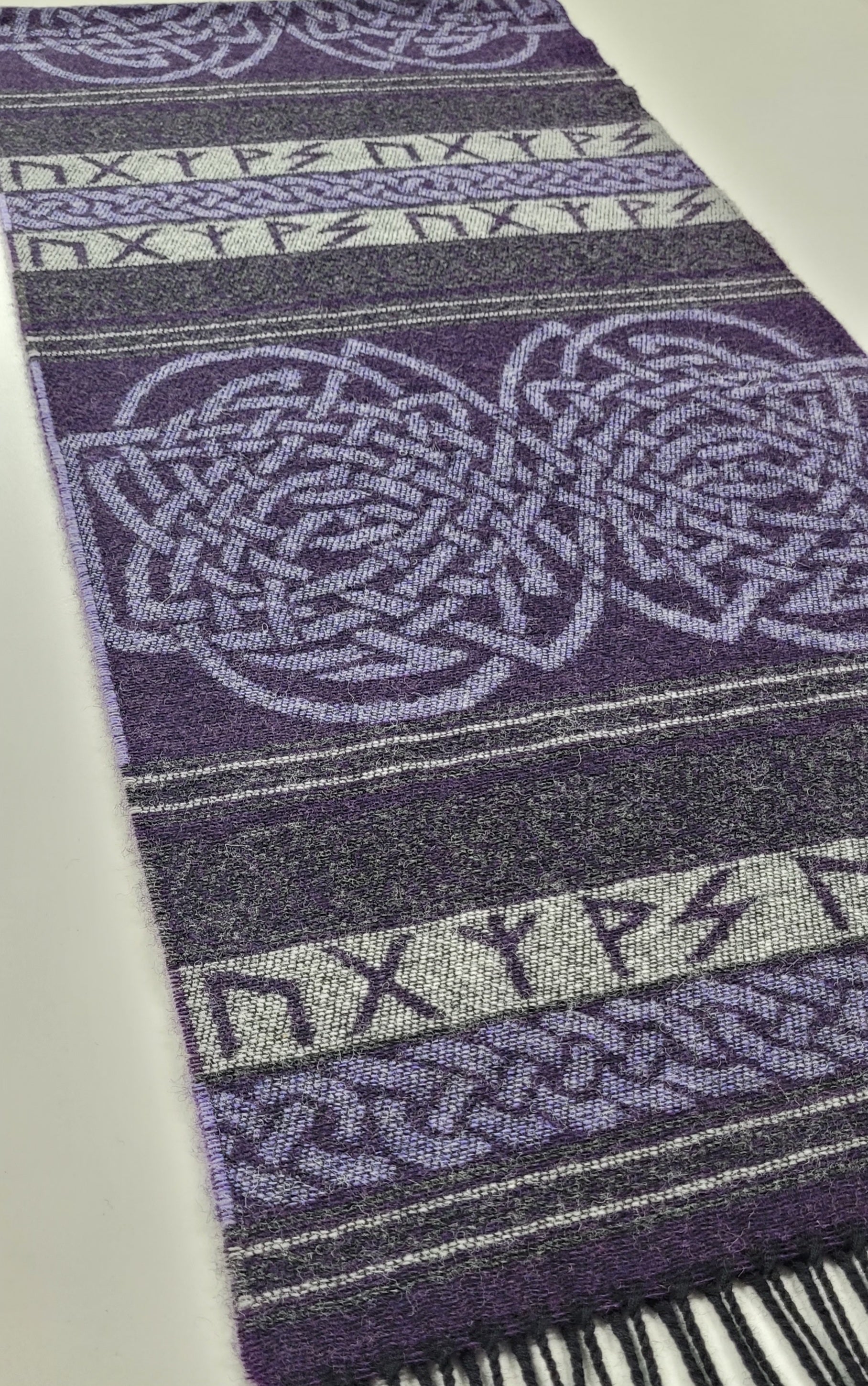 Executed through precision jacquard weaving, this Burleigh scarf presents rune symbolism in sophisticated purple across a lambswool foundation.