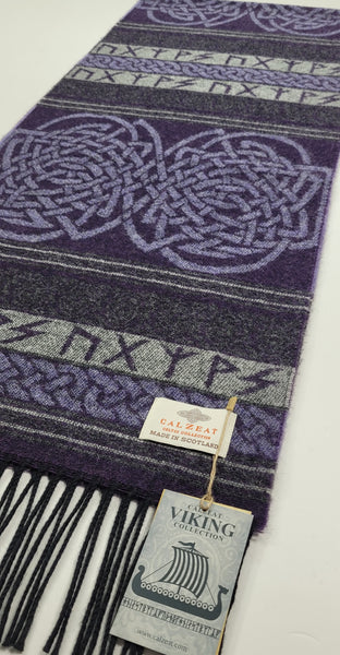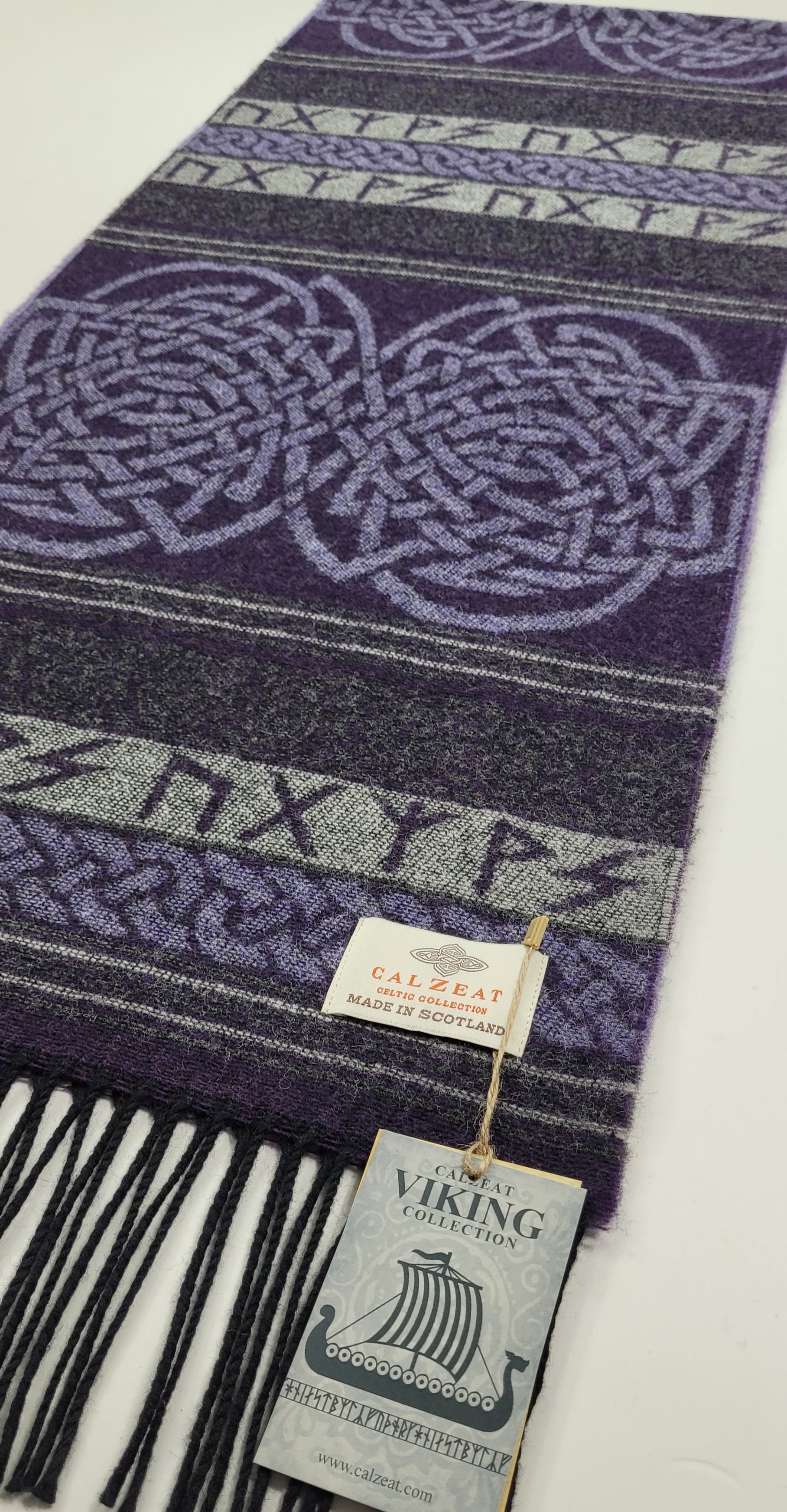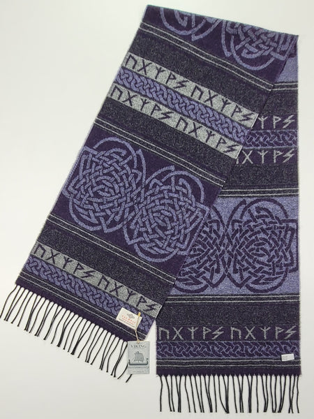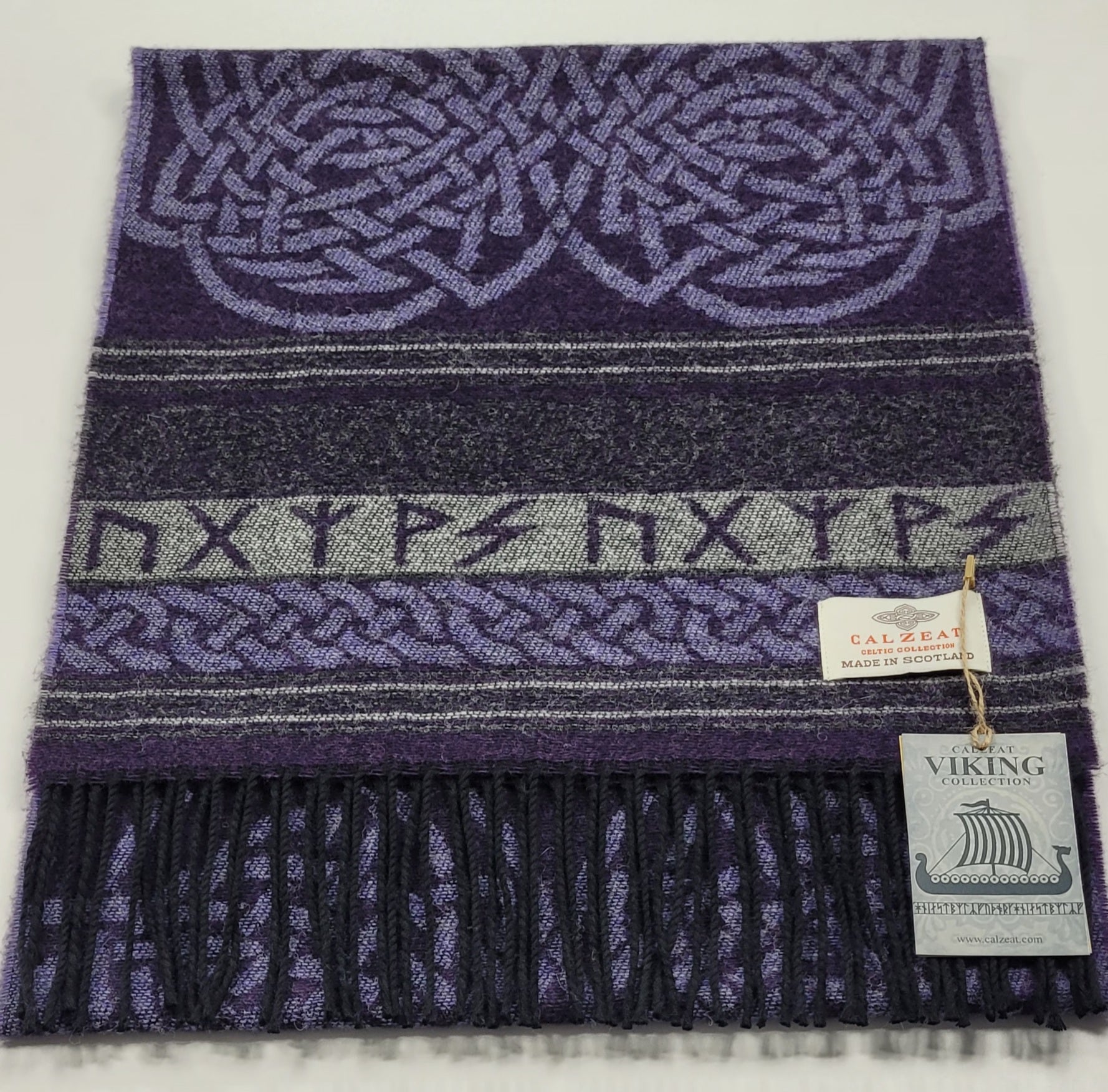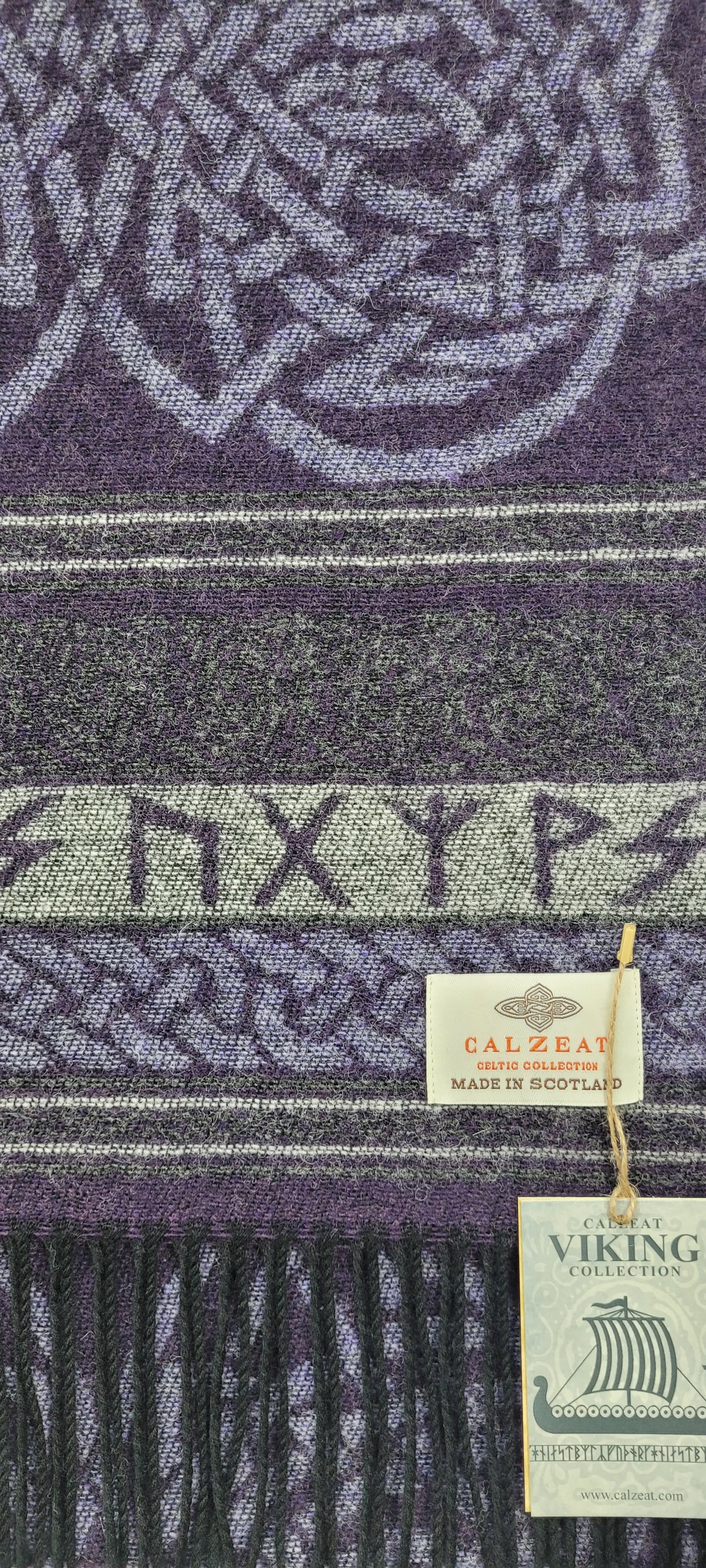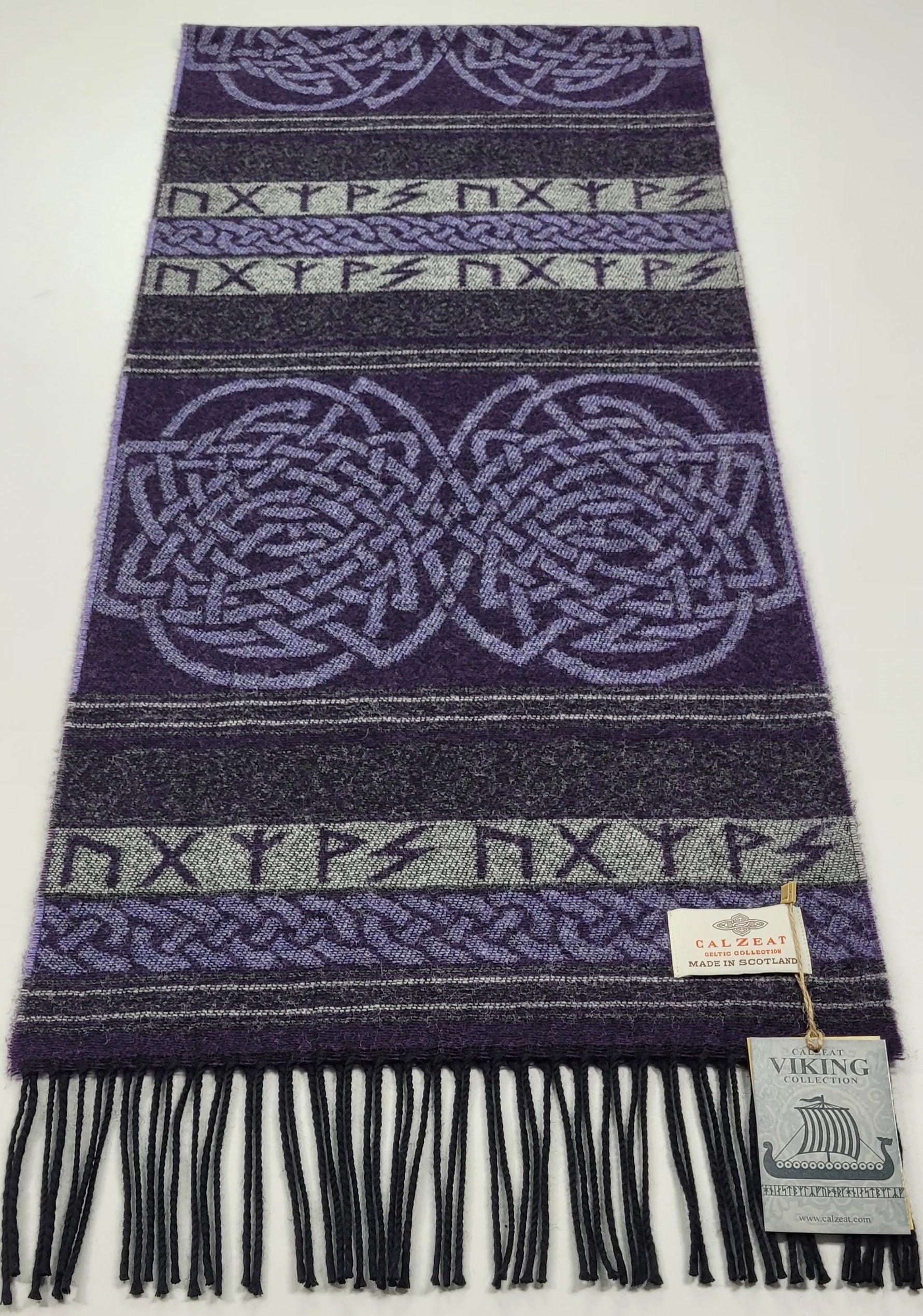 Executed through precision jacquard weaving, this Burleigh scarf presents rune symbolism in sophisticated purple across a lambswool foundation.