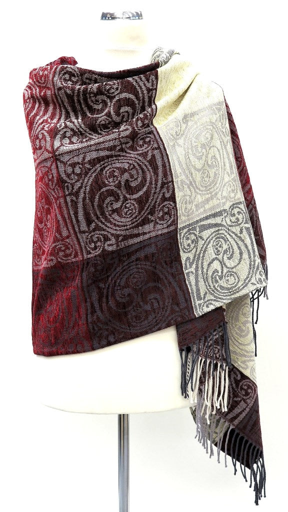 This Tobar Wrap is a gorgeous combination of Garnet, Mulberry and Eggshell.. Our wraps are made from our beautiful throws so colour block placement may vary.
