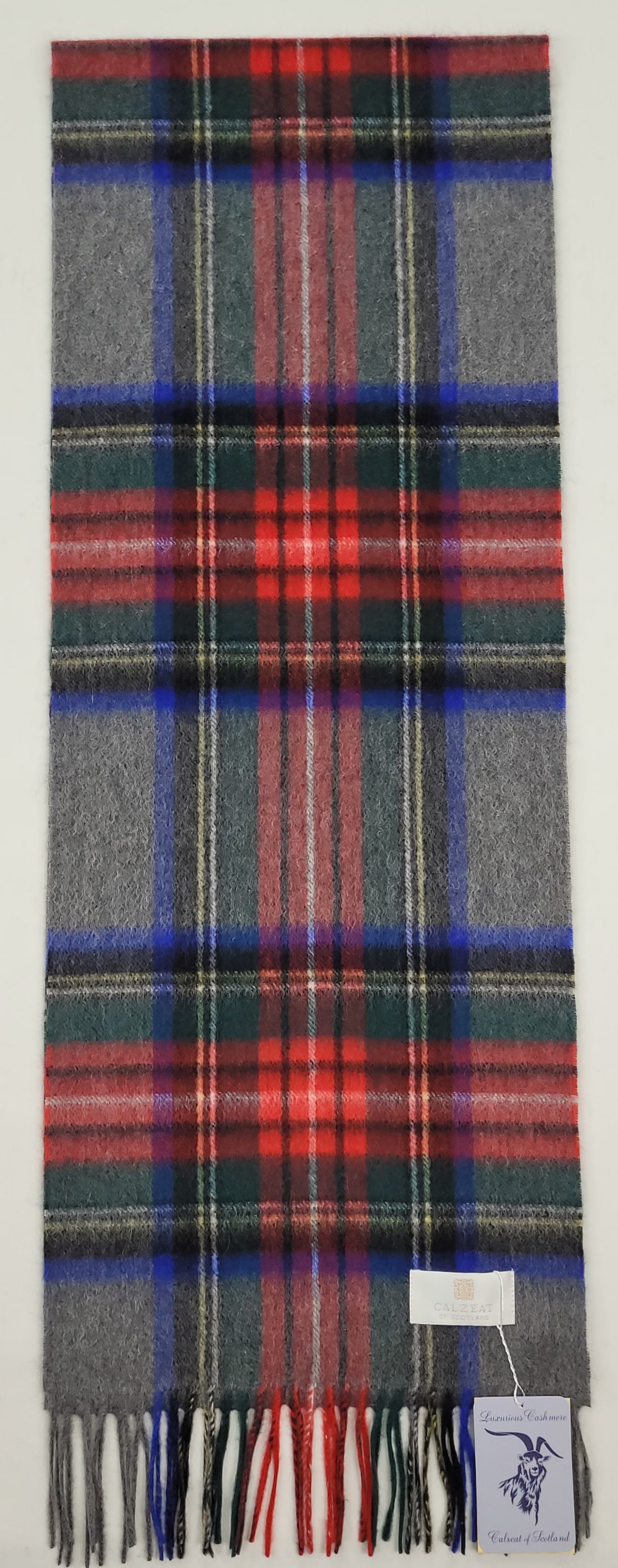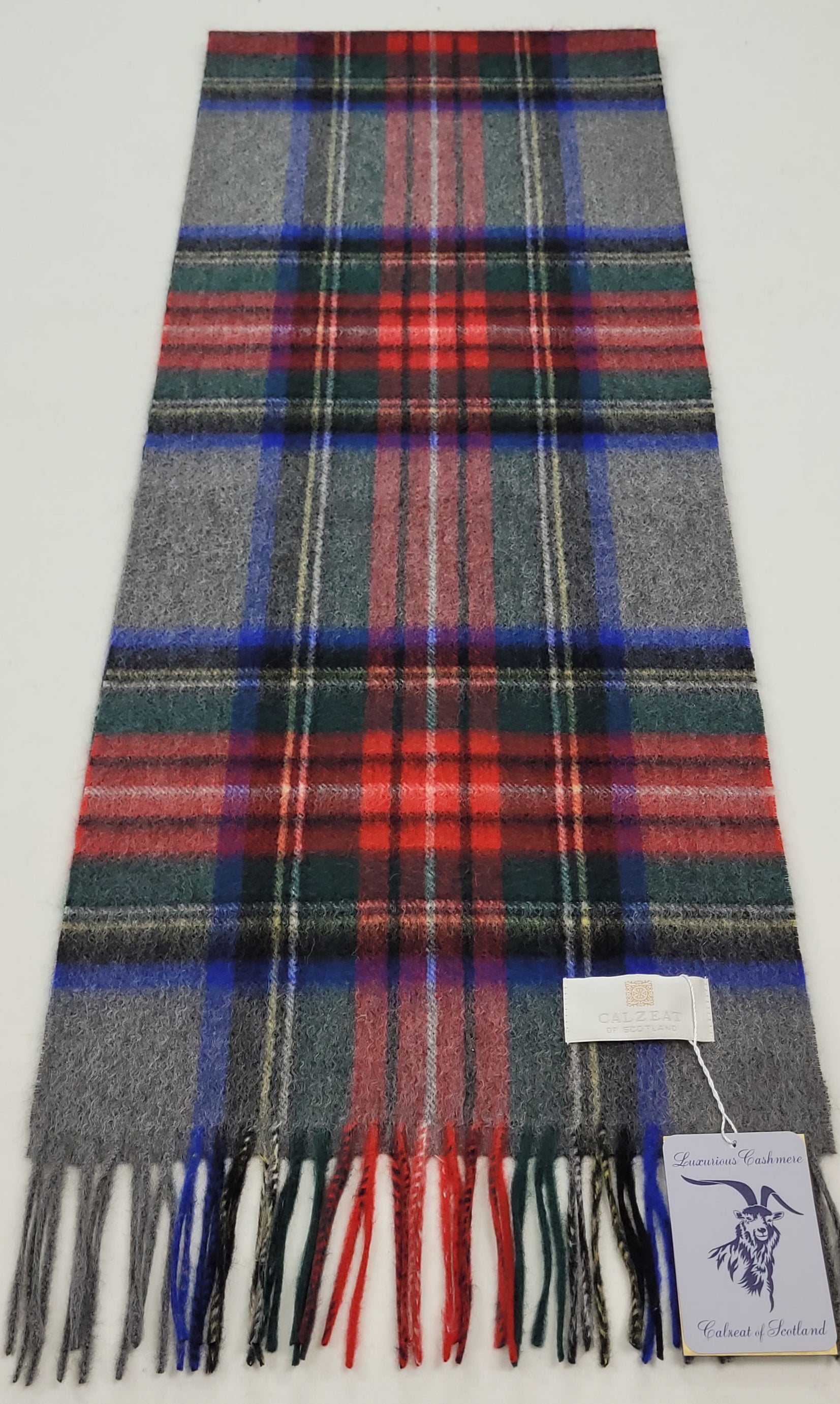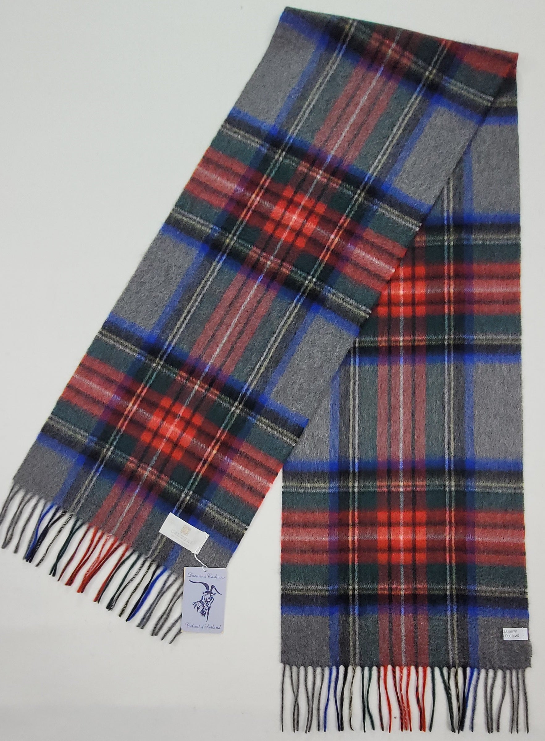 This pure cashmere scarf in shades of Grey , Blue and Red is a classic and timeless design perfect for both men & women alike.
