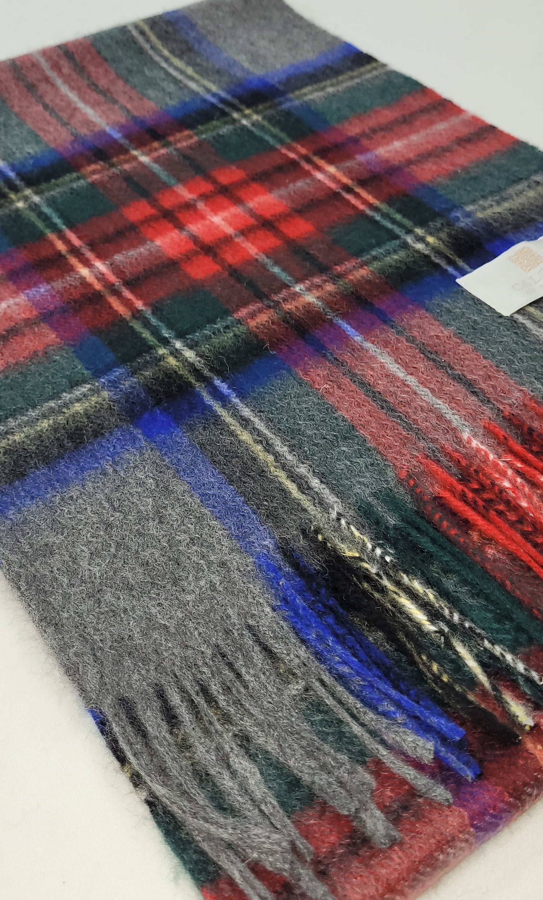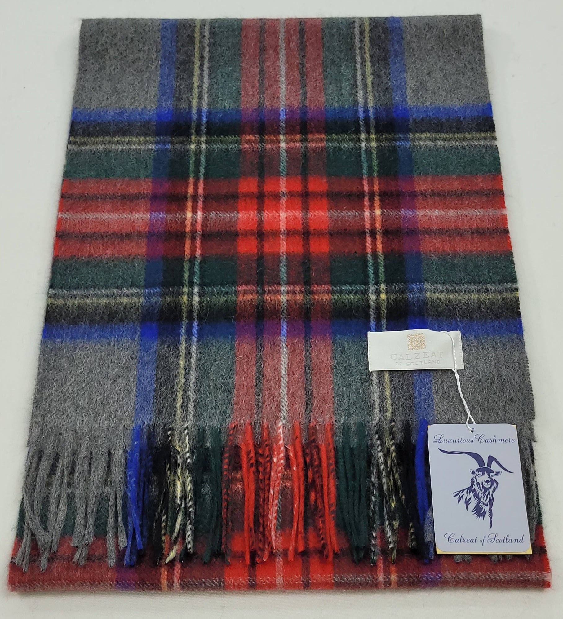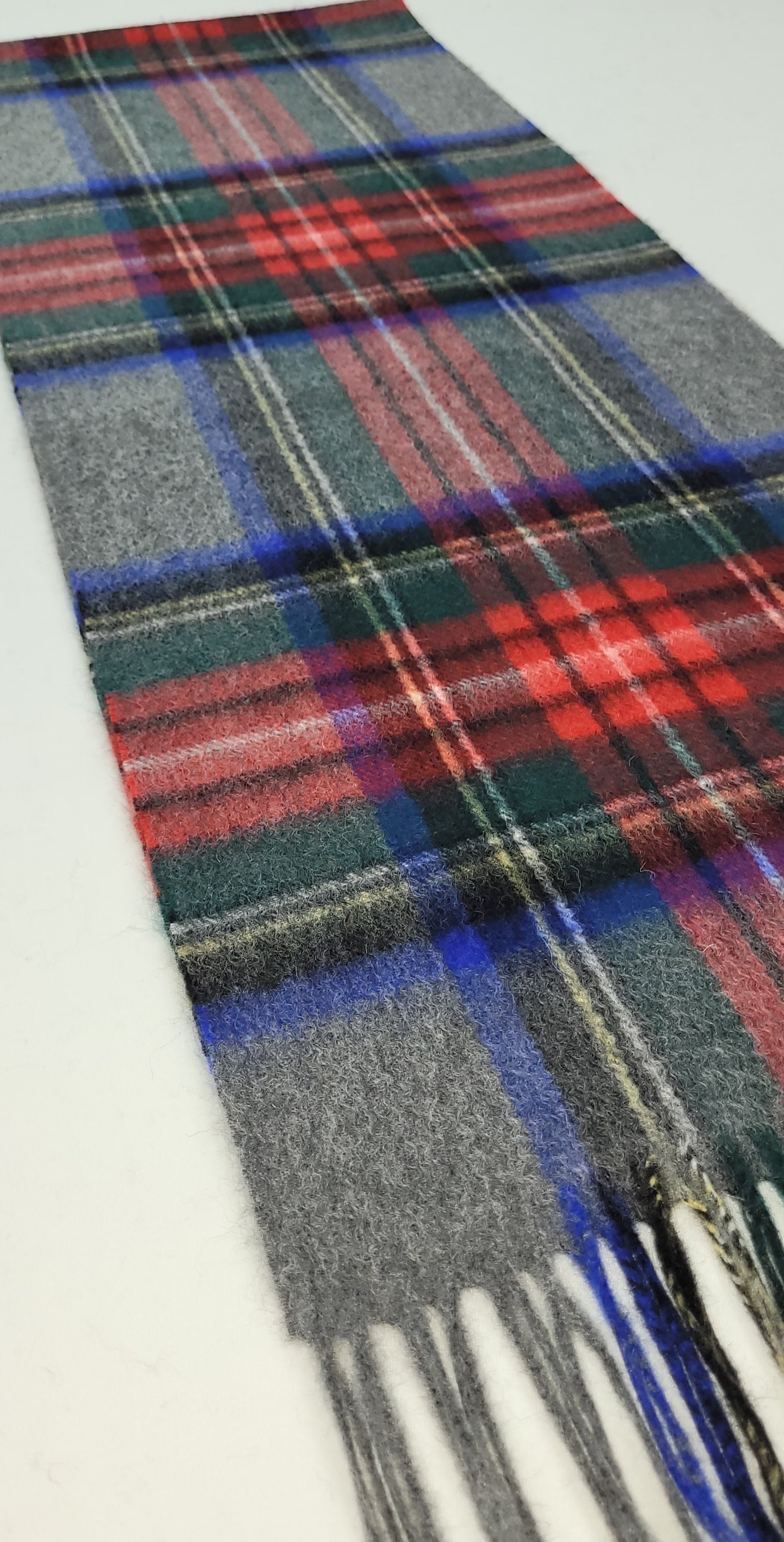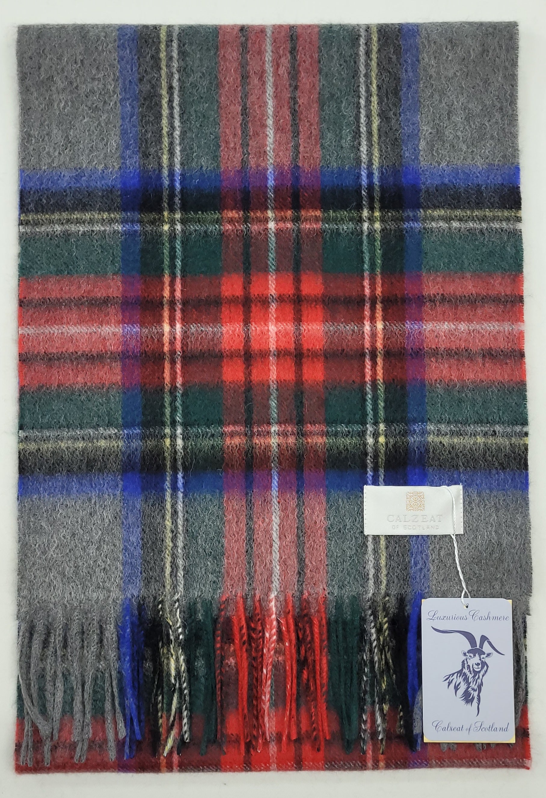 This pure cashmere scarf in shades of Grey , Blue and Red is a classic and timeless design perfect for both men & women alike.
