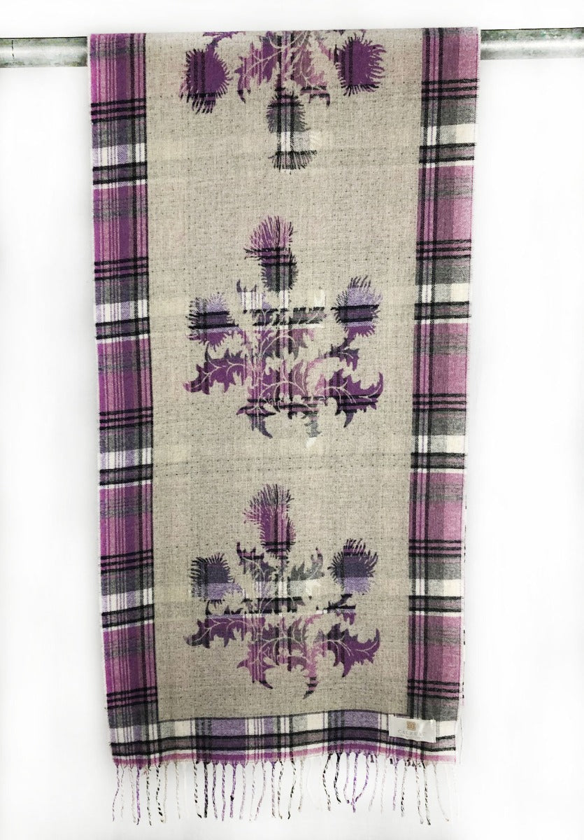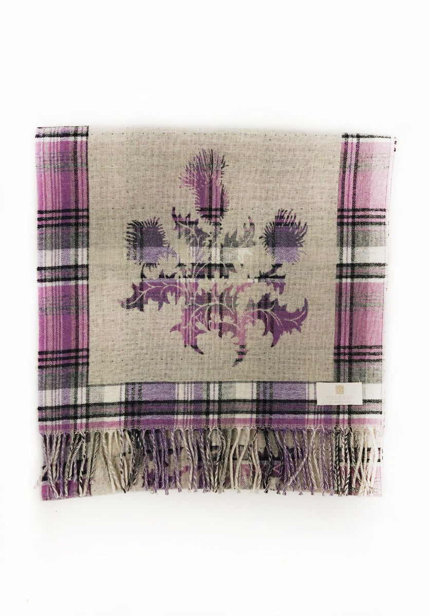 Our Purple Thistle Wrap is lovely and soft to the touch. It features an intricate double cloth construction that creates a Scottish check in the motif of a thistle. This truly is a beautiful & unique Scottish product. Dimensions: 47 x 200 cm Including Fringes An authentic Scottish product exclusively designed and woven by Calzeat of Scotland. |