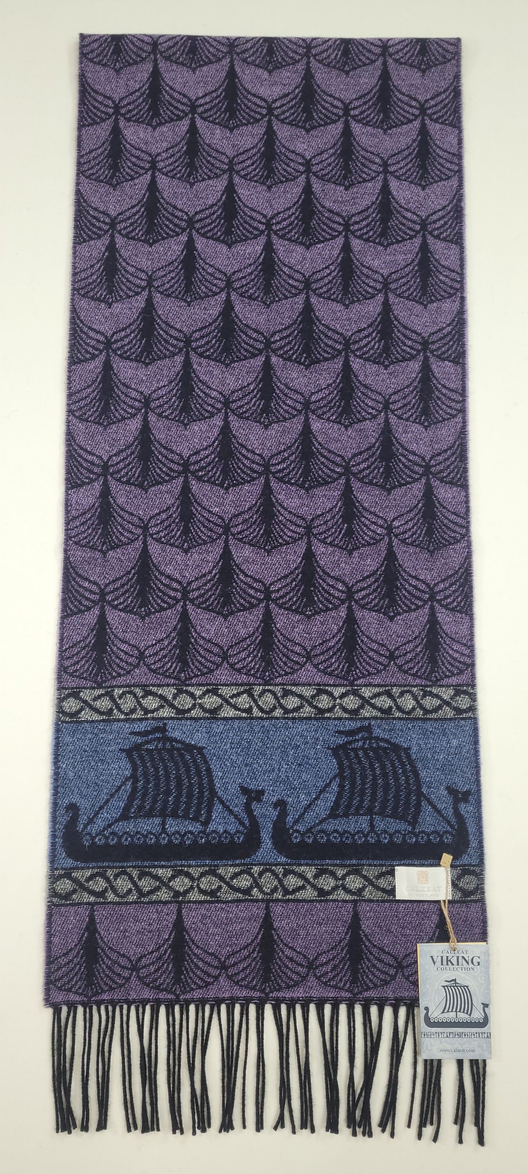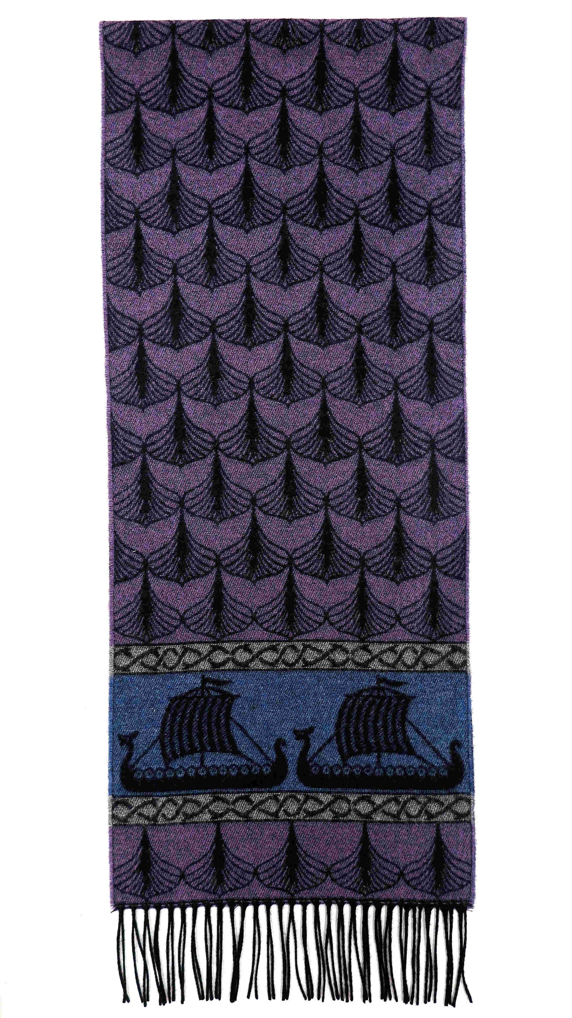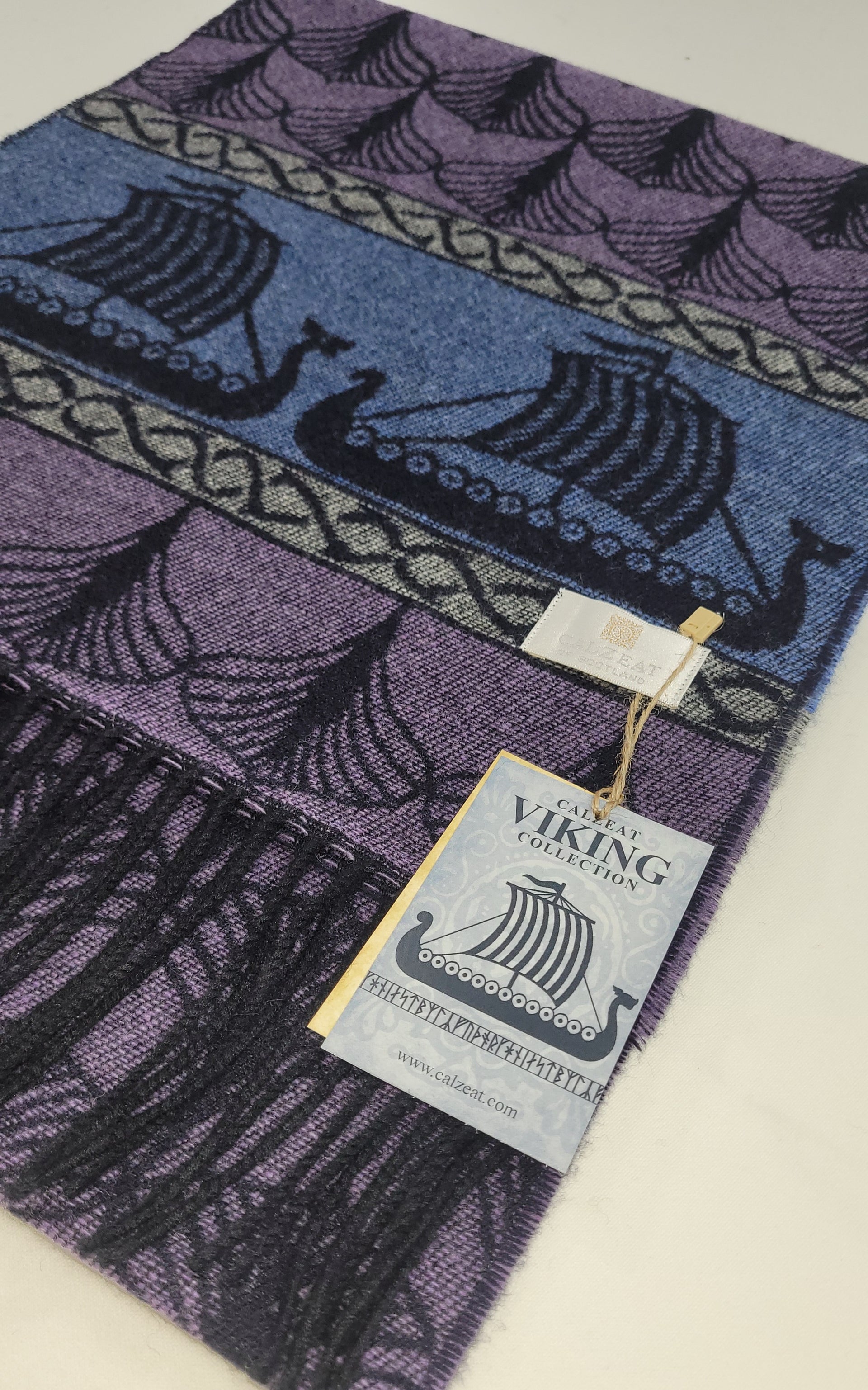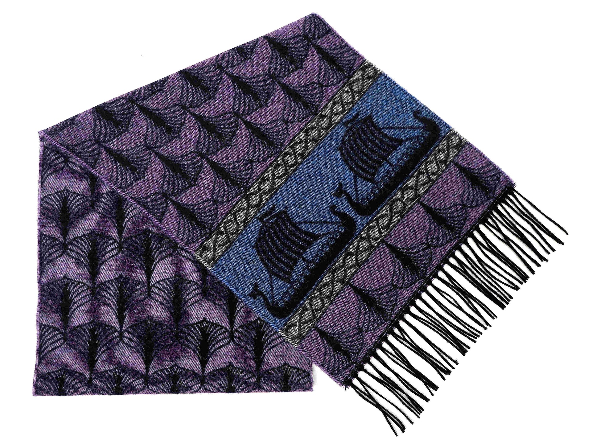 Our beautiful amethyst purple Viking Ships Dragon Scarf has a clever ship's bow design in the centre and a blue border at each end depicting 2 longships.