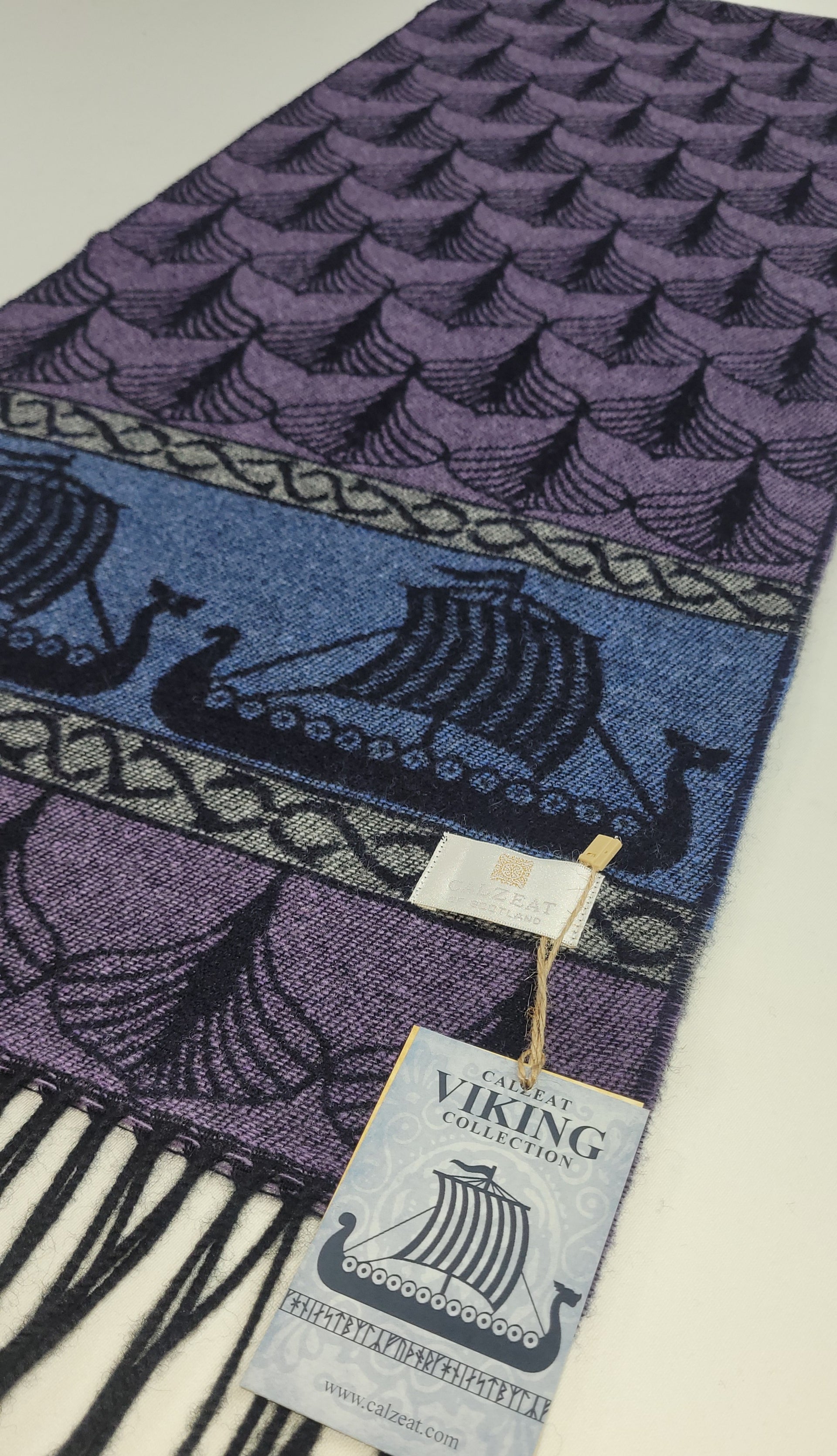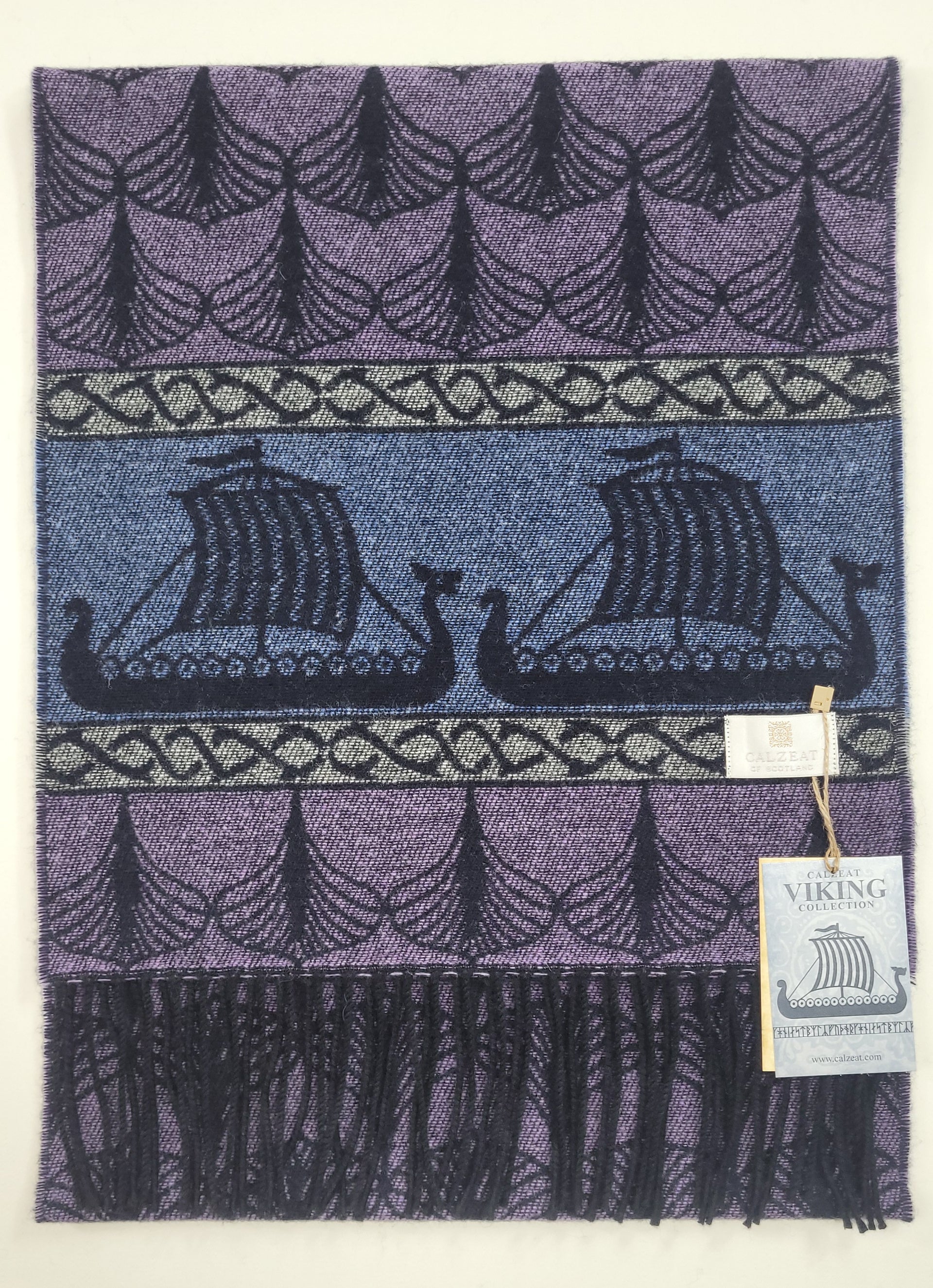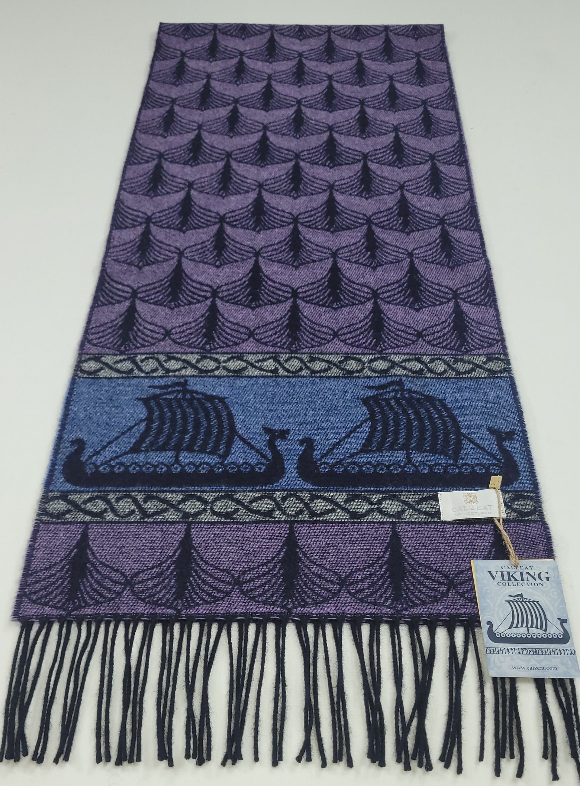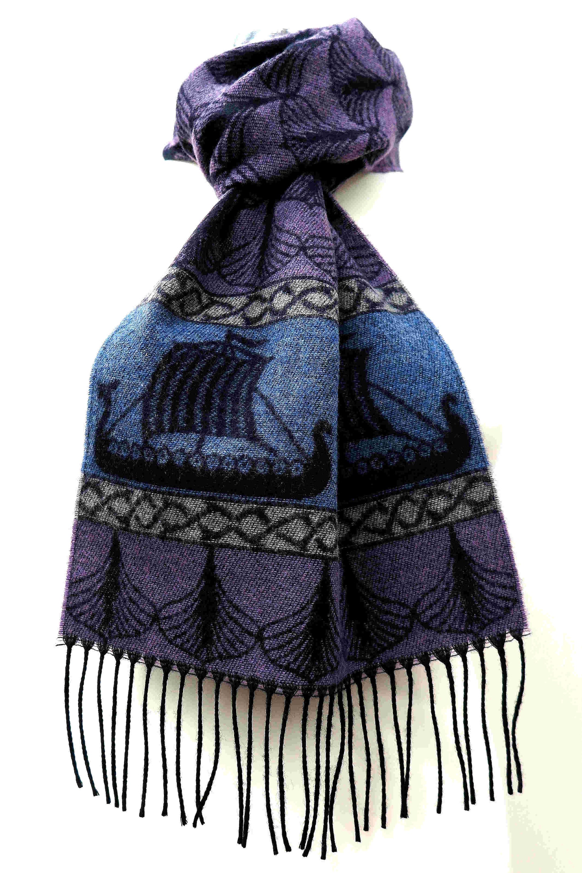 Our beautiful amethyst purple Viking Ships Dragon Scarf has a clever ship's bow design in the centre and a blue border at each end depicting 2 longships.