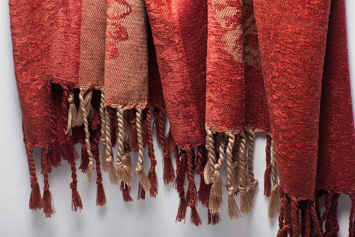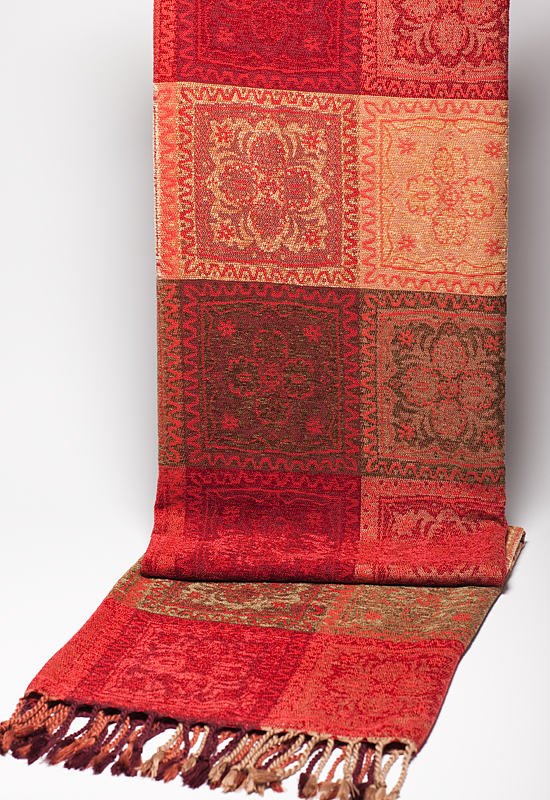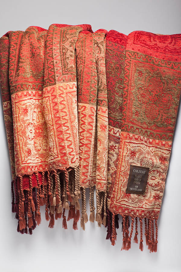 This Throw is a Red and Olive colour combination on an intricate lozenge mosaic design. Dimensions: 150 x 200 cms Including Fringes Composition: 70% Acrylic/30% Viscose Chenille |