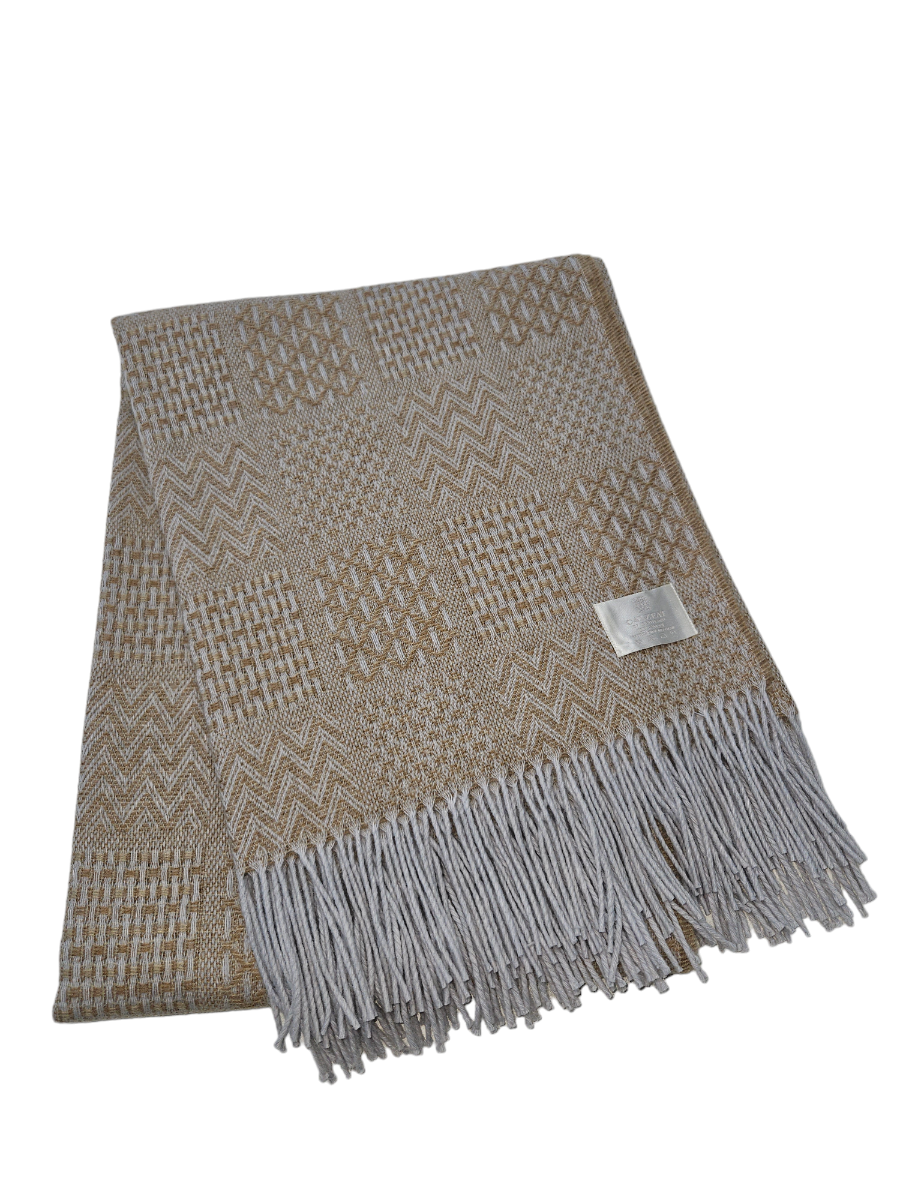 Geometric Throw (Camel) Composition: 100% Wool Size: 136 cms x 187 cms Geometric Throws Made by Calzeat of Scotland |
