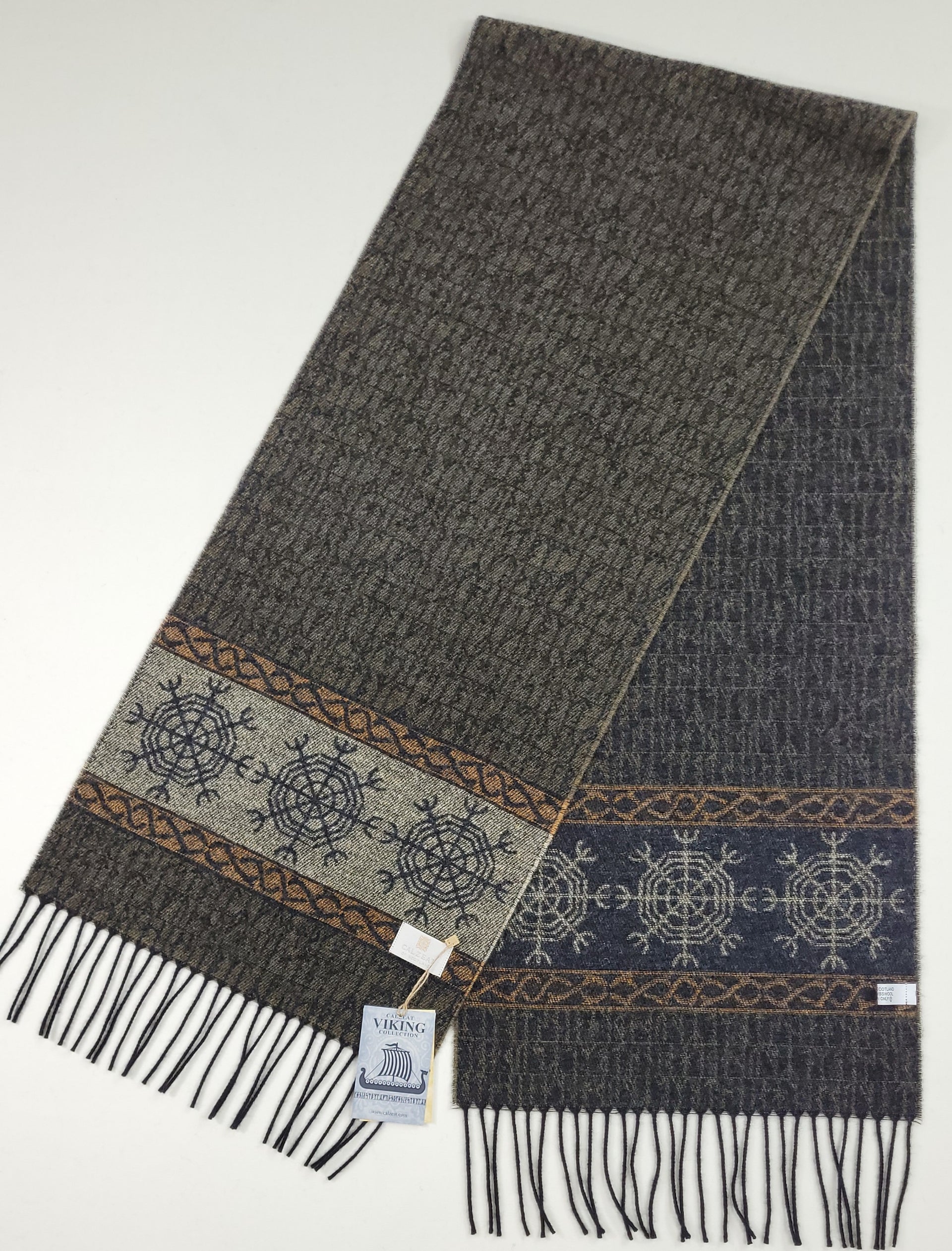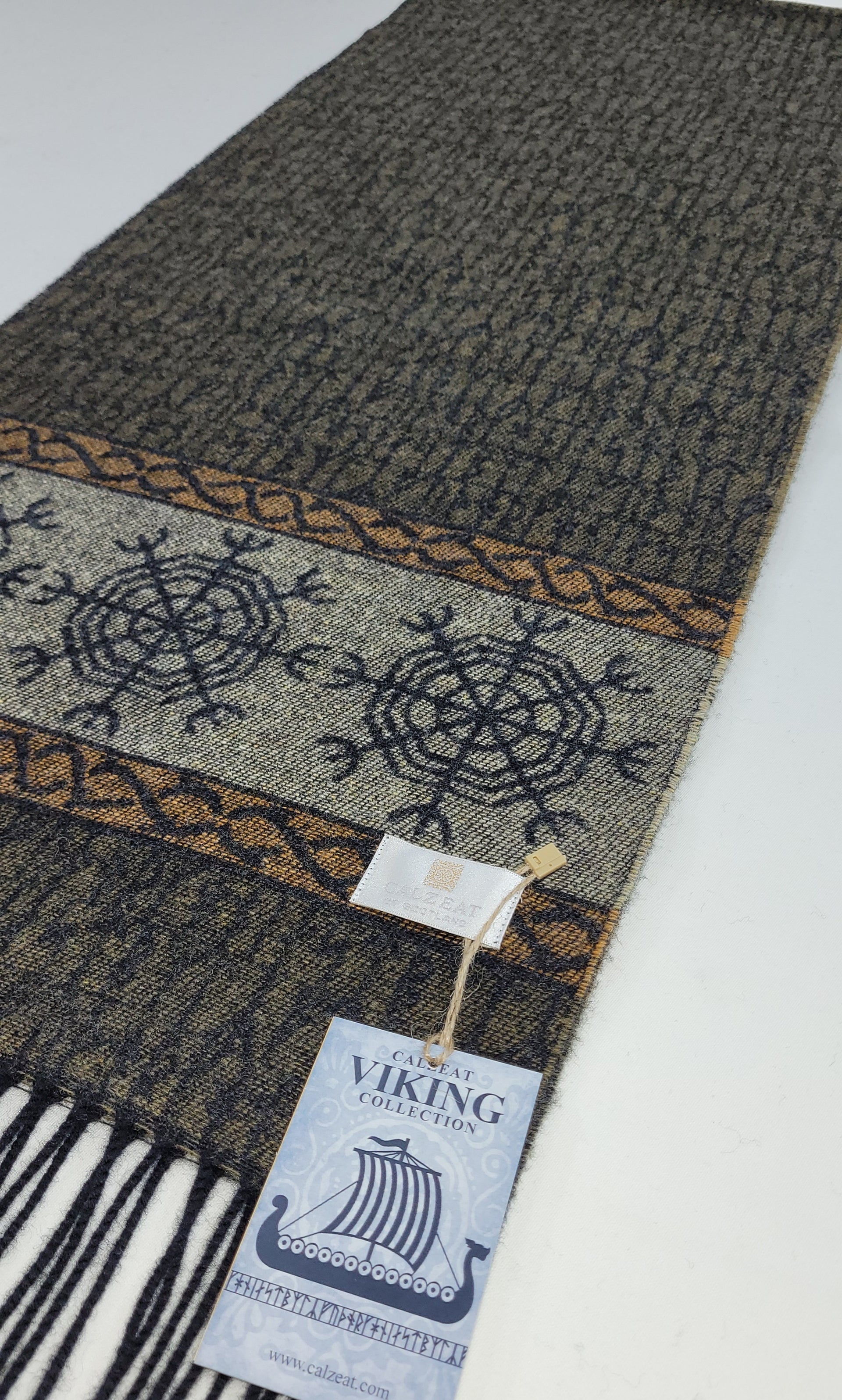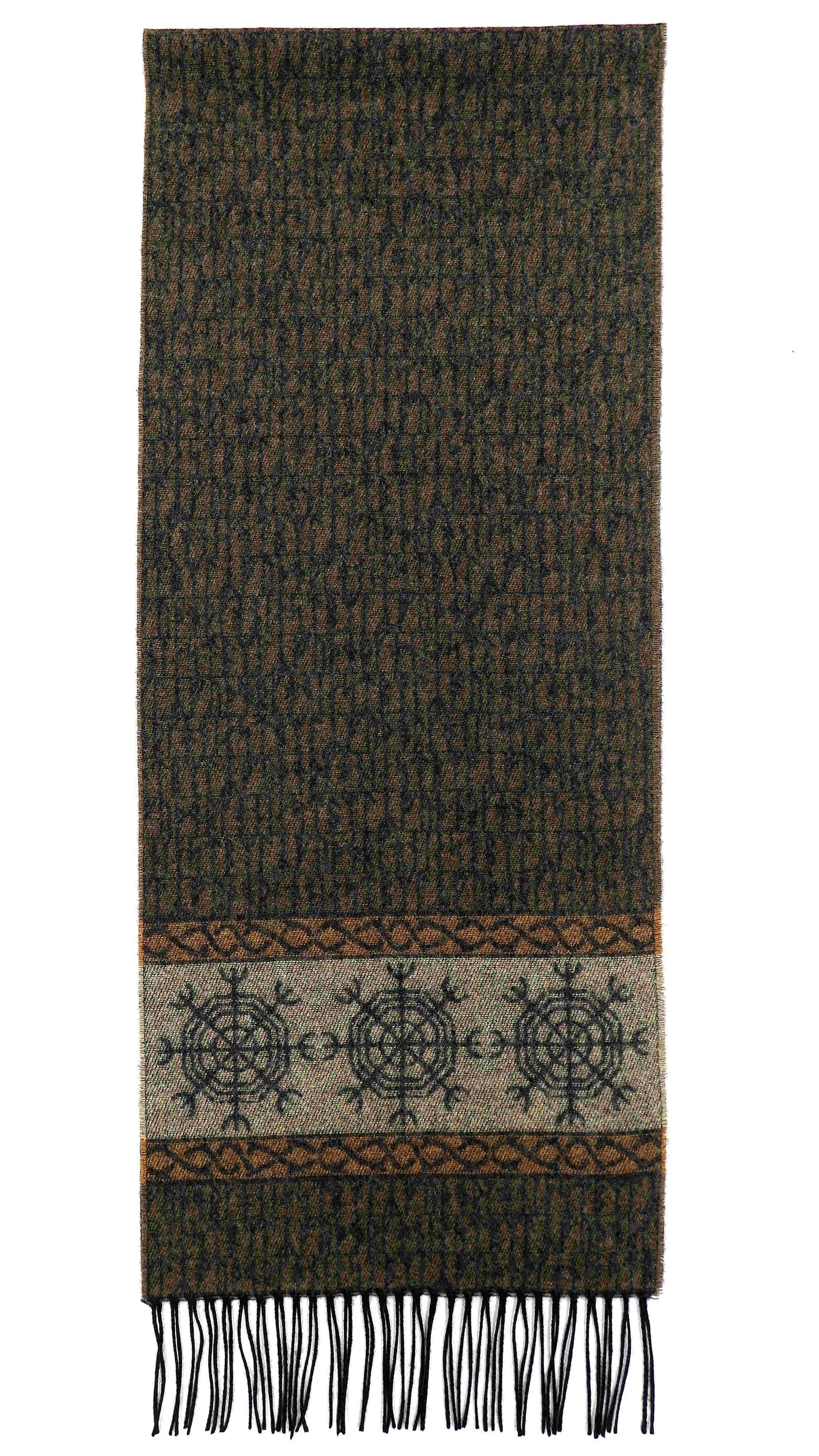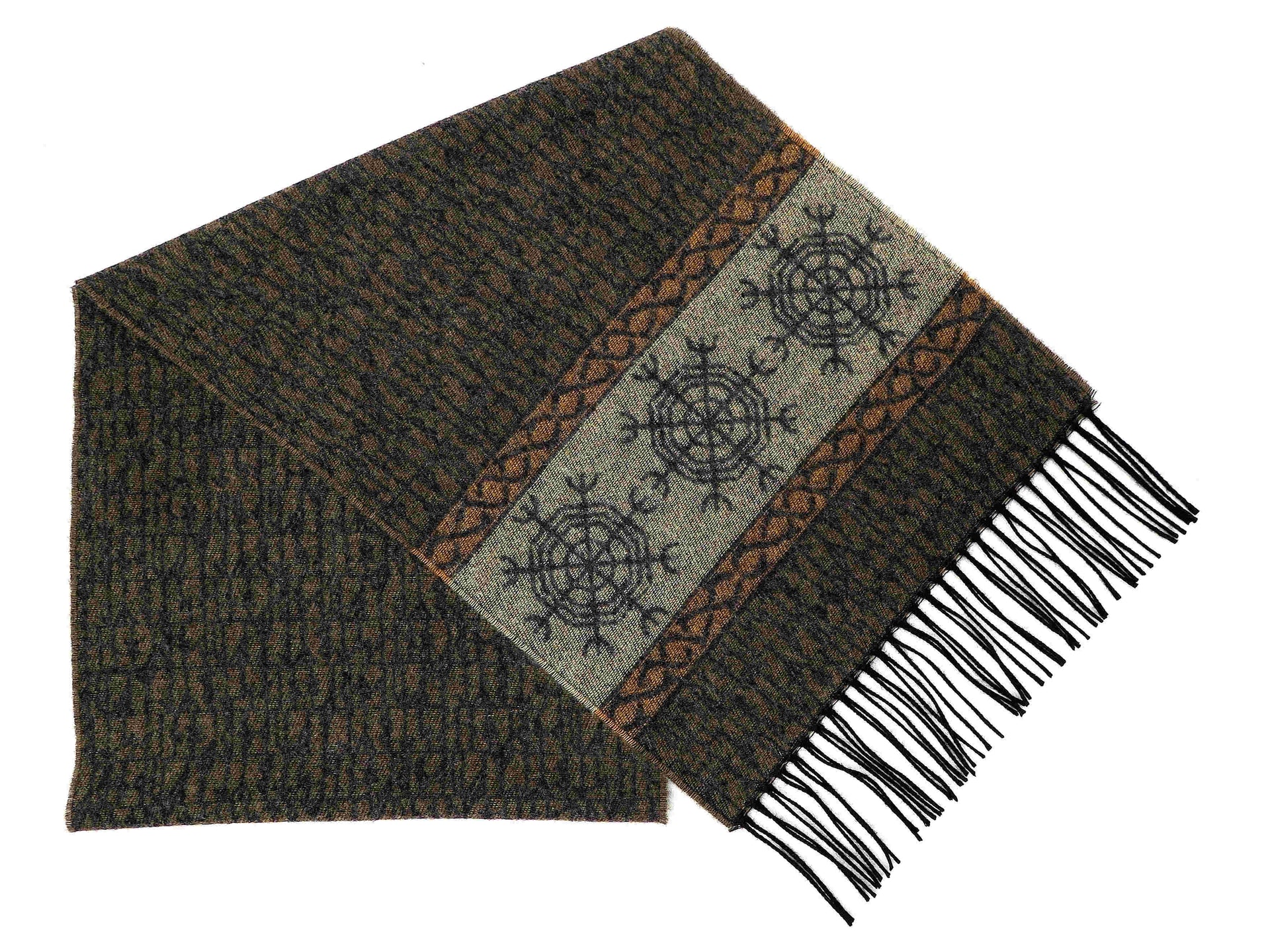 Our Viking Helm of Awe Oakwood Scarf is woven from 100% wool and the design is inspired by the powerful protective symbol used by the Vikings to protect against illness and disease.
